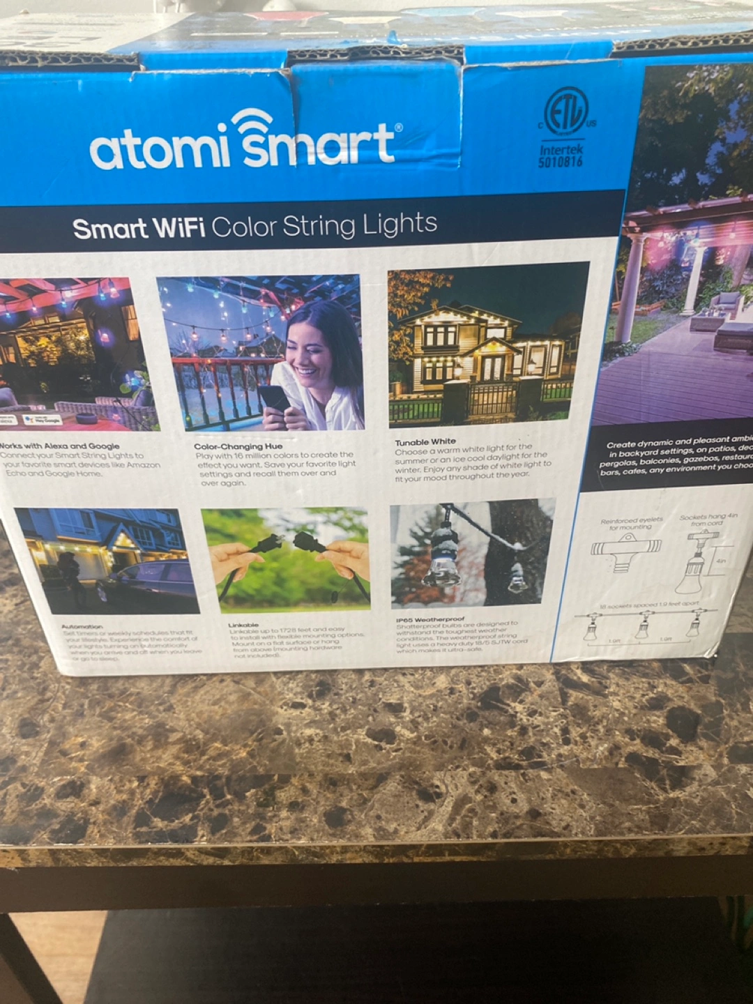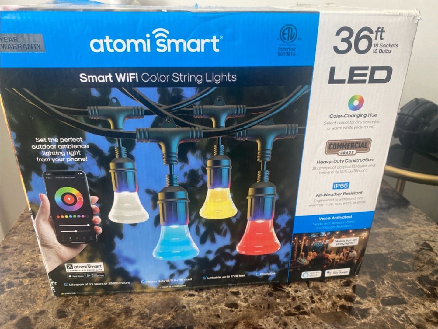 I'm selling a brand new set of Atomi Smart WiFi Color String Lights! They are 36ft long and come with 18 LED bulbs.
