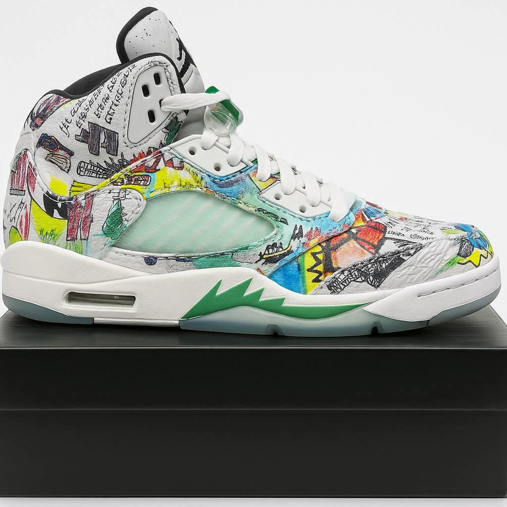 Selling a pair of Air Jordan 5 Retro 'Doernbecher' sneakers! These have a unique and eye-catching design, with colorful drawings all over the white leather upper. The midsole is white with green accents, and the outsole is translucent. Perfect for adding a pop of color and style to your wardrobe!