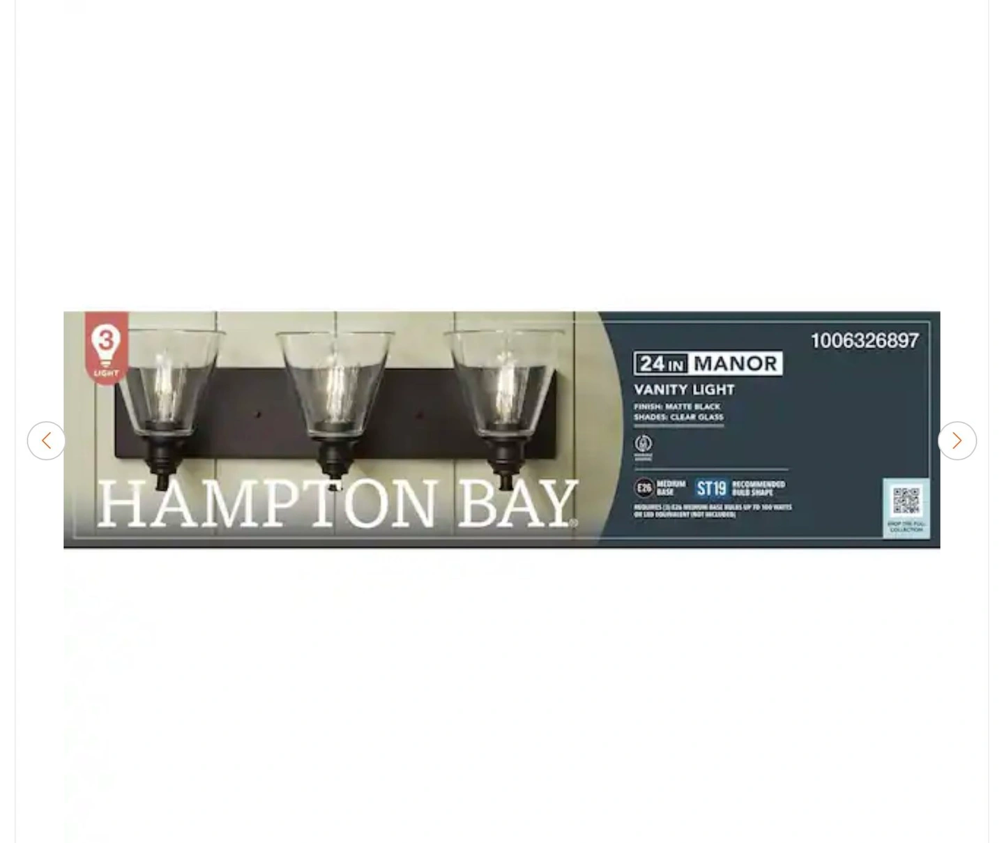 Brand new Hampton Bay Manor 3-light vanity light with a matte black finish and clear glass shades. Let me know if you're interested!