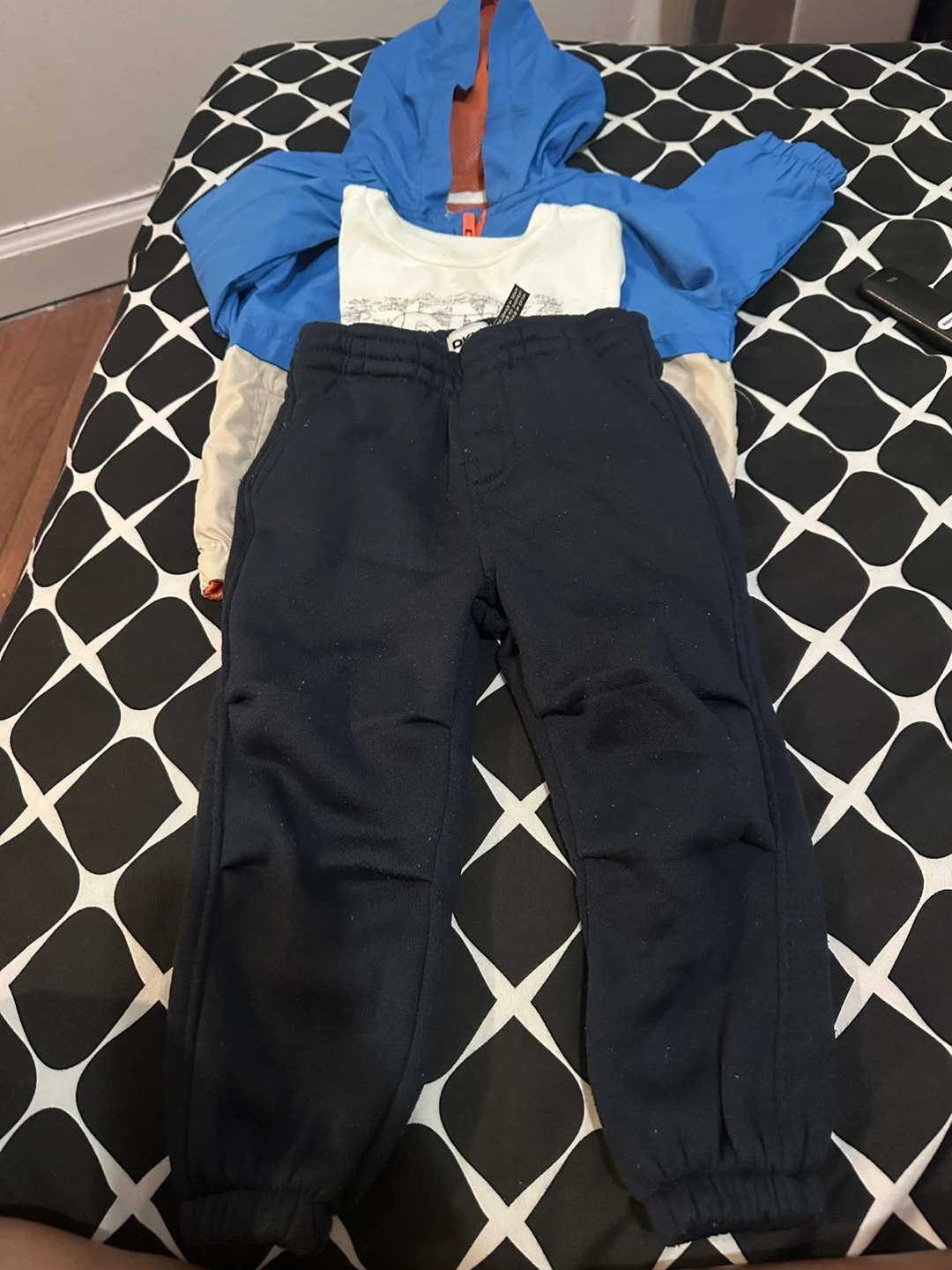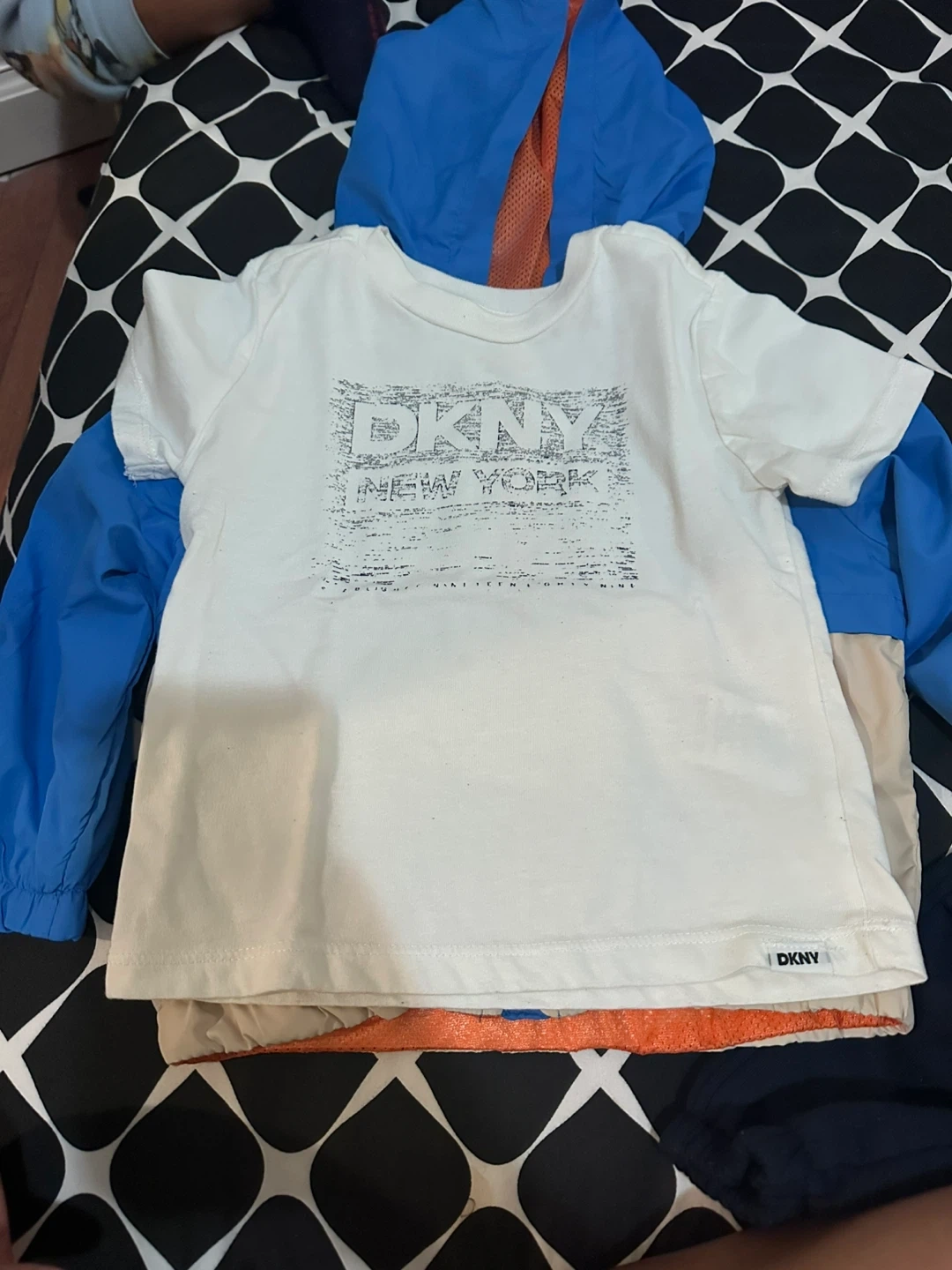 This DKNY outfit set includes a blue and tan color-blocked windbreaker jacket with an orange lining. Also comes with a white DKNY New York graphic tee and navy sweatpants. It's a stylish and comfortable choice for active kids!