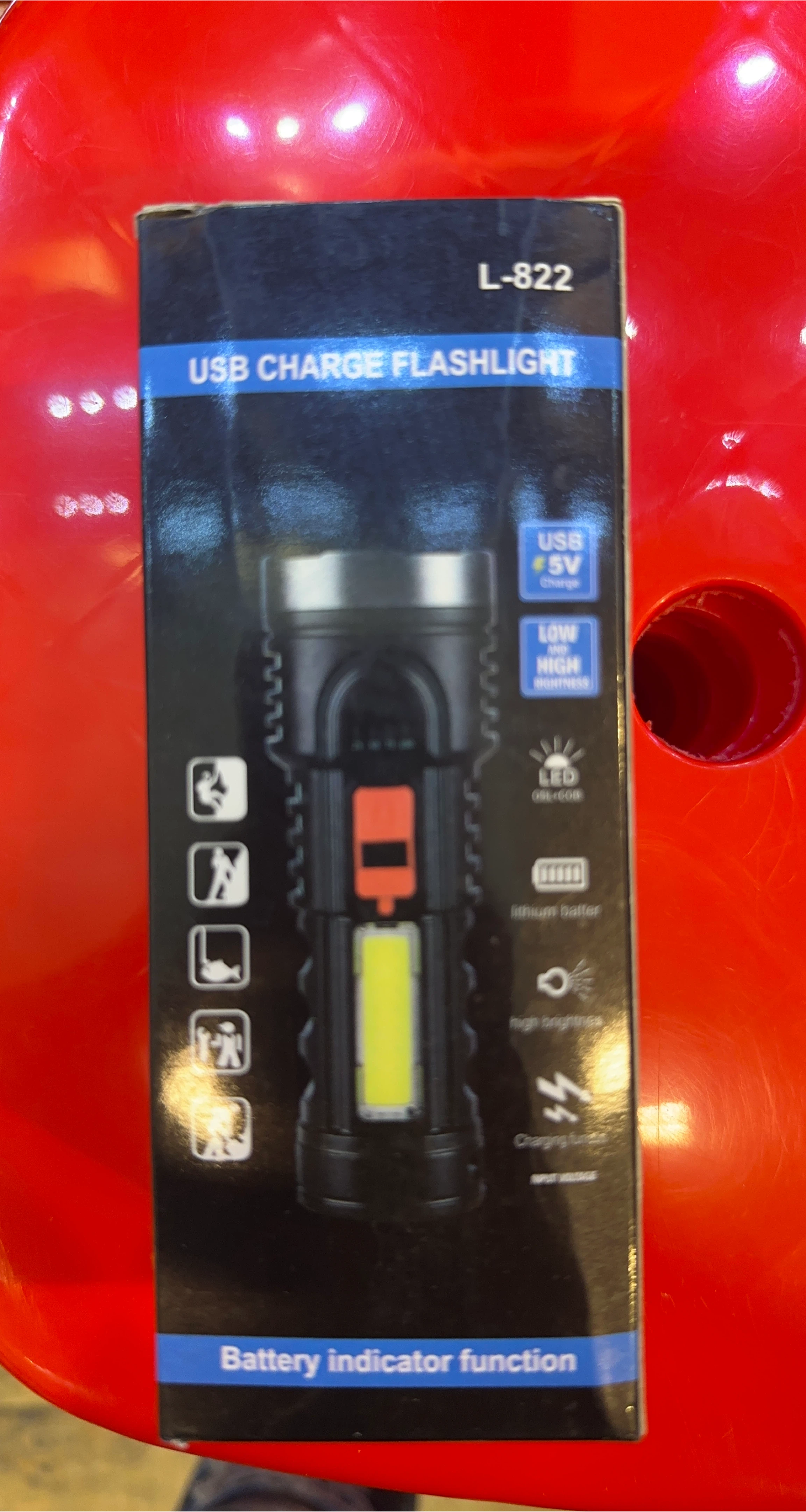 Selling a L-822 USB Charge Flashlight. It features: - USB 5V Charge - Low and High Brightness - LED GSE-606 - Lithium battery - High brightness - Charging function - Battery indicator function