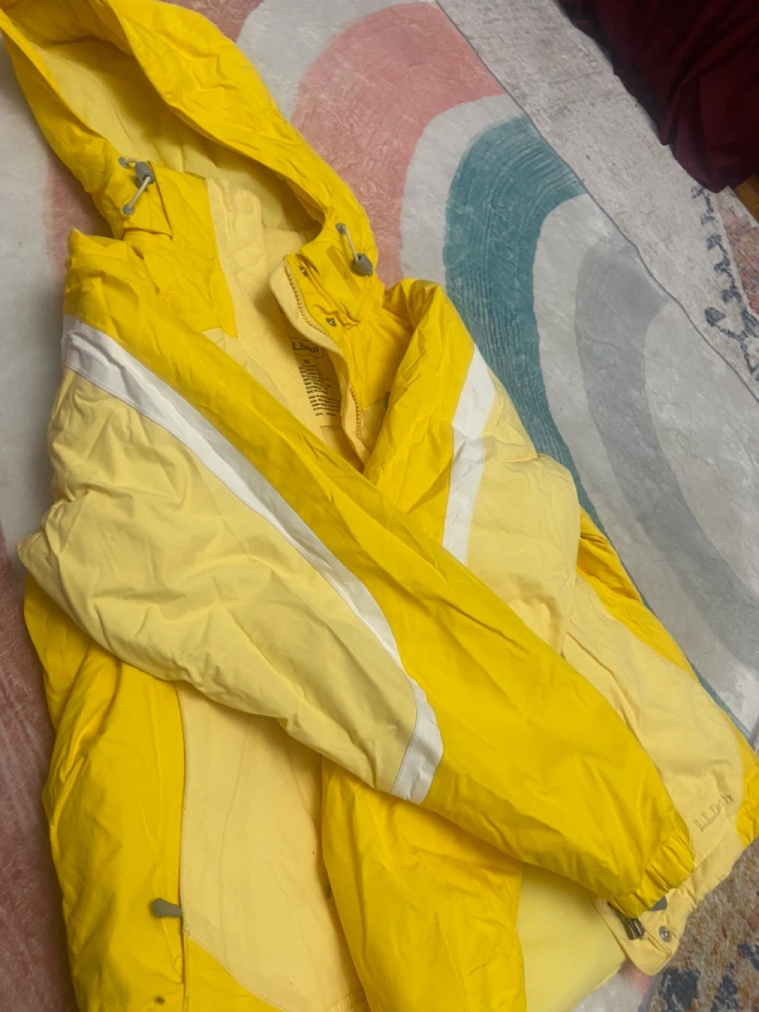 Selling a vibrant yellow L.L.Bean puffer jacket! It's a size medium and features a shell and lining made of 100% nylon. The inside collar and placket are 100% polyester. It’s perfect for staying warm and stylish during colder weather