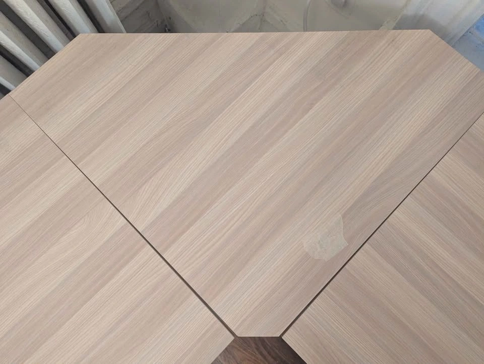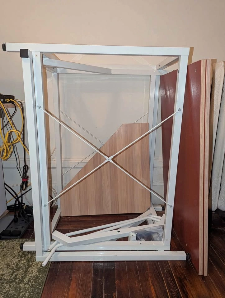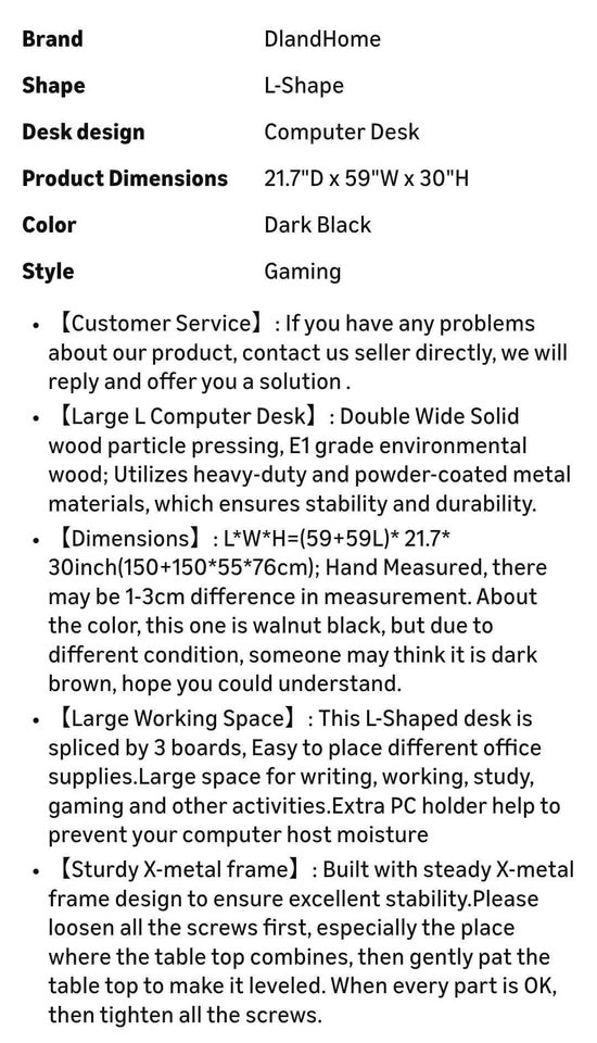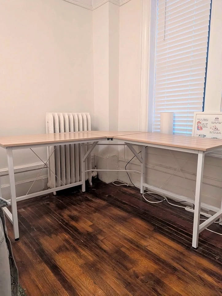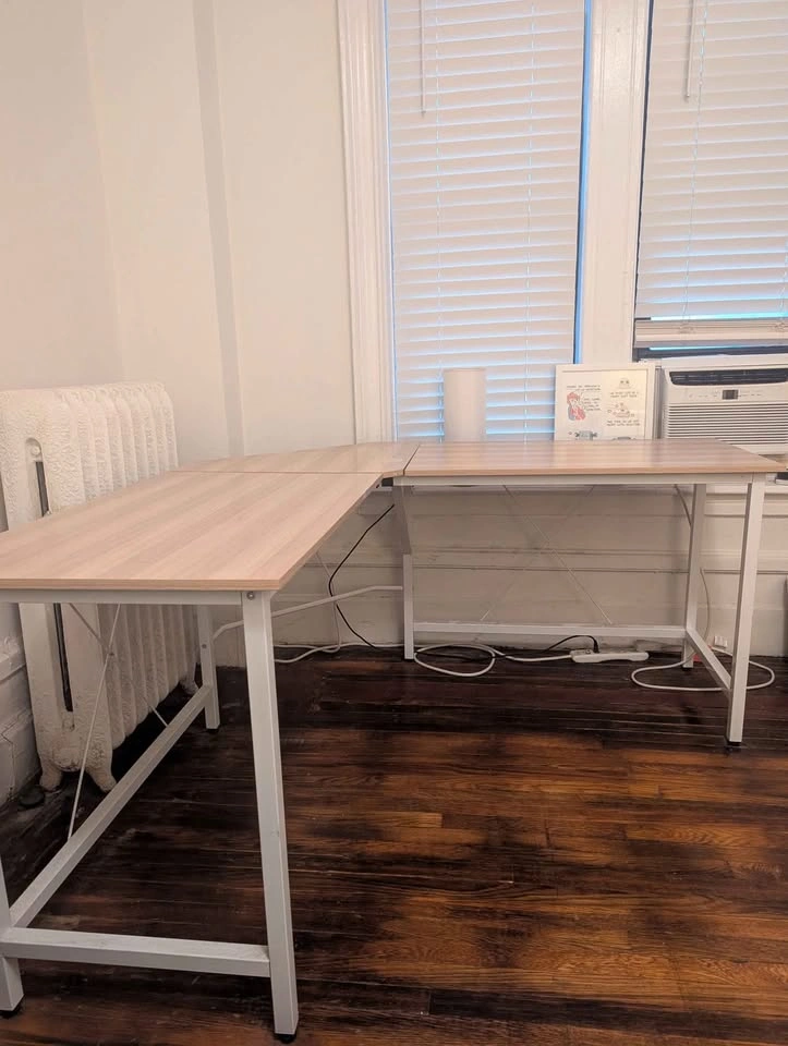 L-shaped desk bought on Amazon 4-5 years ago. Originally $120 retail. I'm selling because it no longer fits in my apartment. The dimensions are 22"D x 59"W x 30"H. There's one small hole in the corner wood piece that happened during reassembly and covered by masking tape. Otherwise, the desk is in good condition. Coming from a pet-free and smoke-free home. Pick up in Astoria. Disassembled for easier pick up.