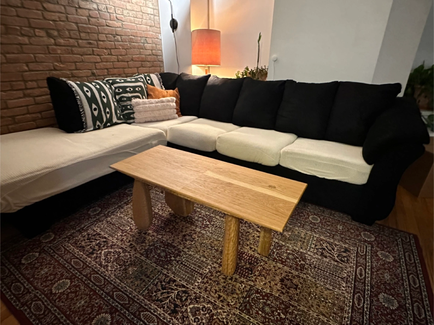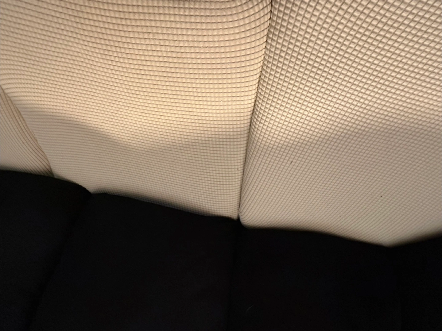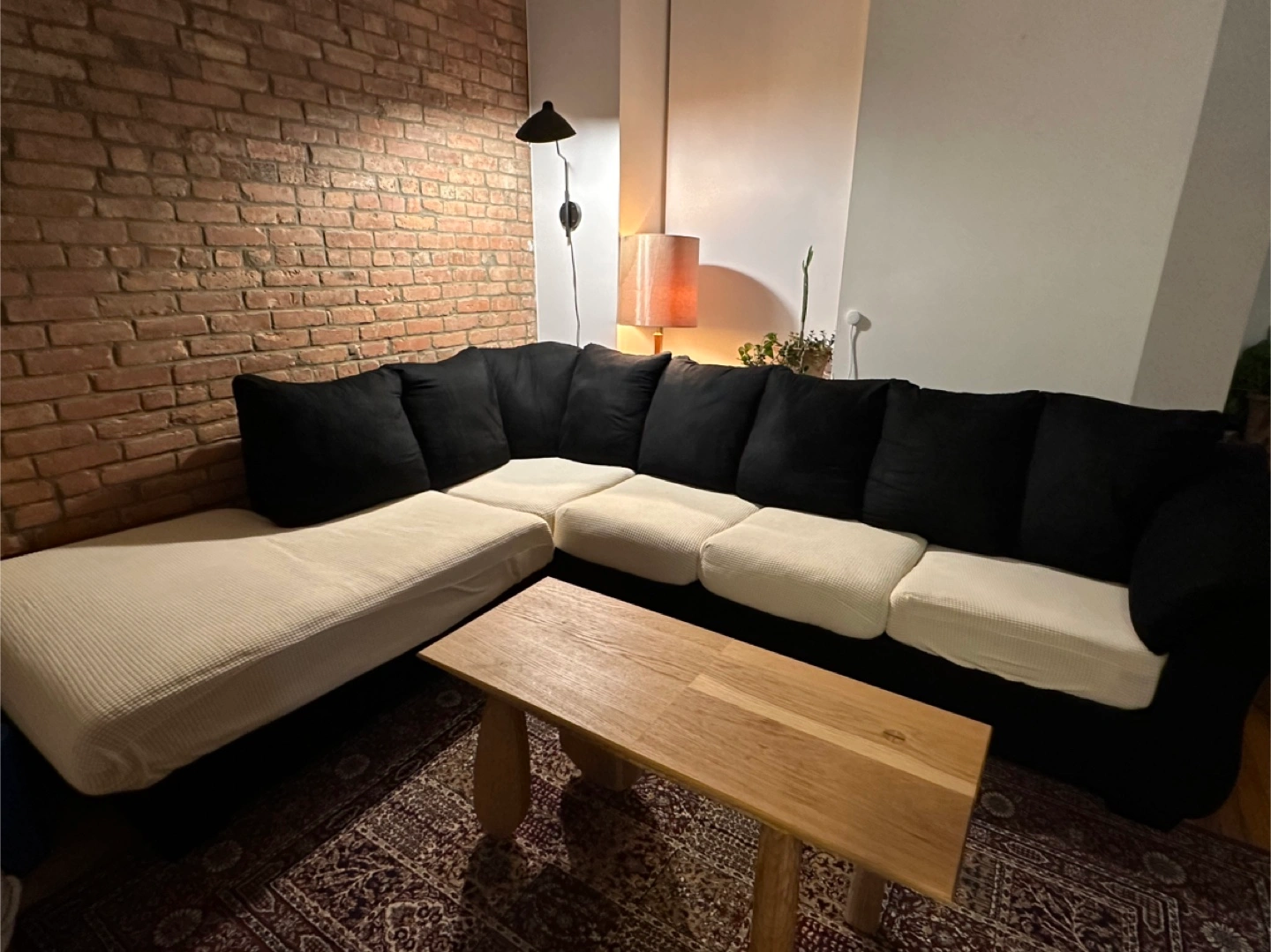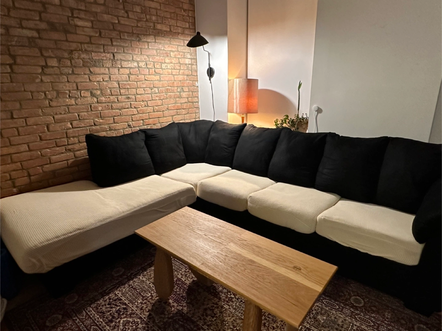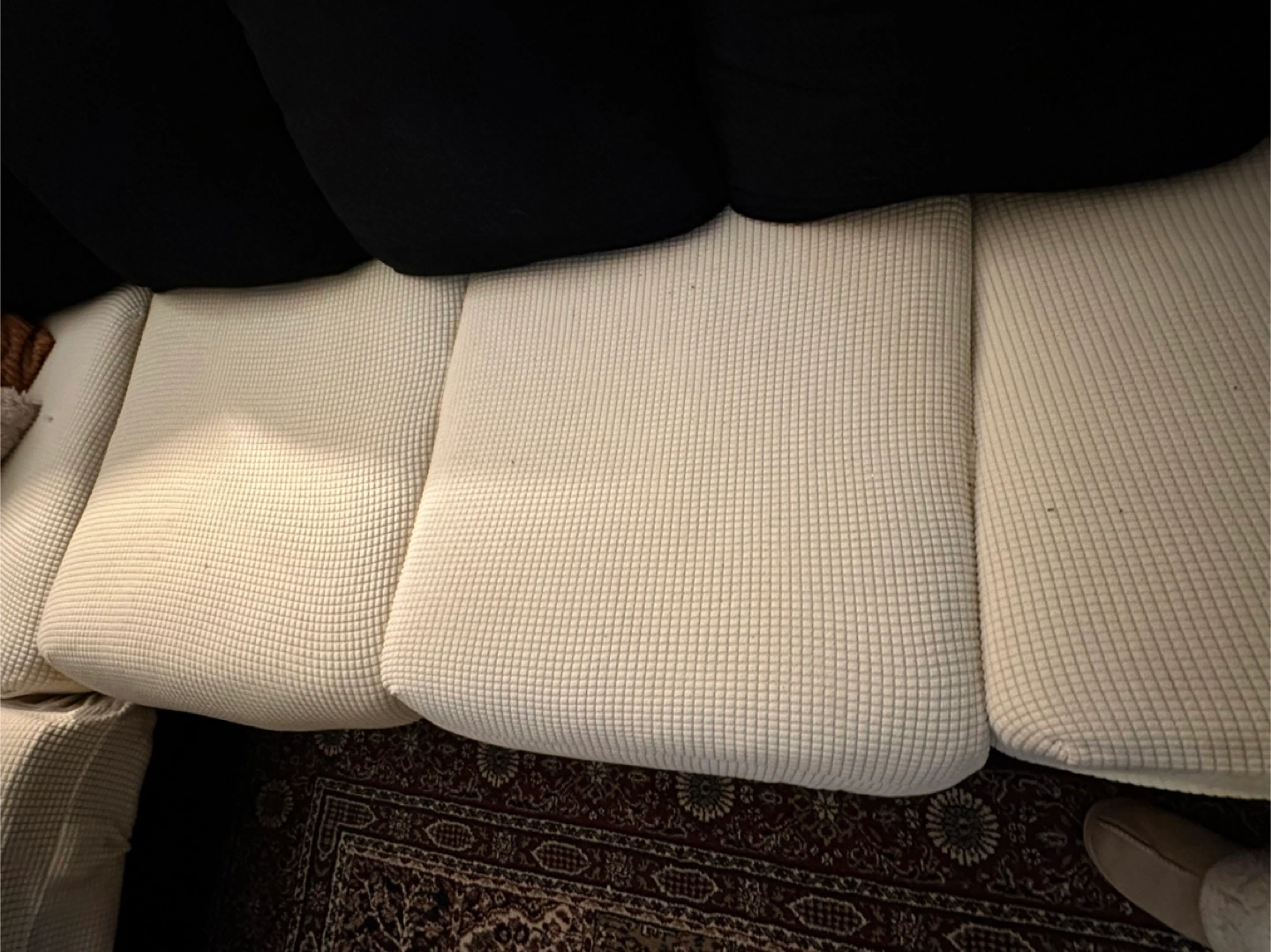 113 long 38 wide 92 chaise L shaped couch Dog friendly home Had couch covers on it and blankets so no dog damage. i.e scratches I have original black covers that I will give to you and these waffle cream covers too Can fit 8 people sitting comfortably