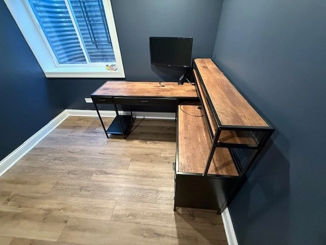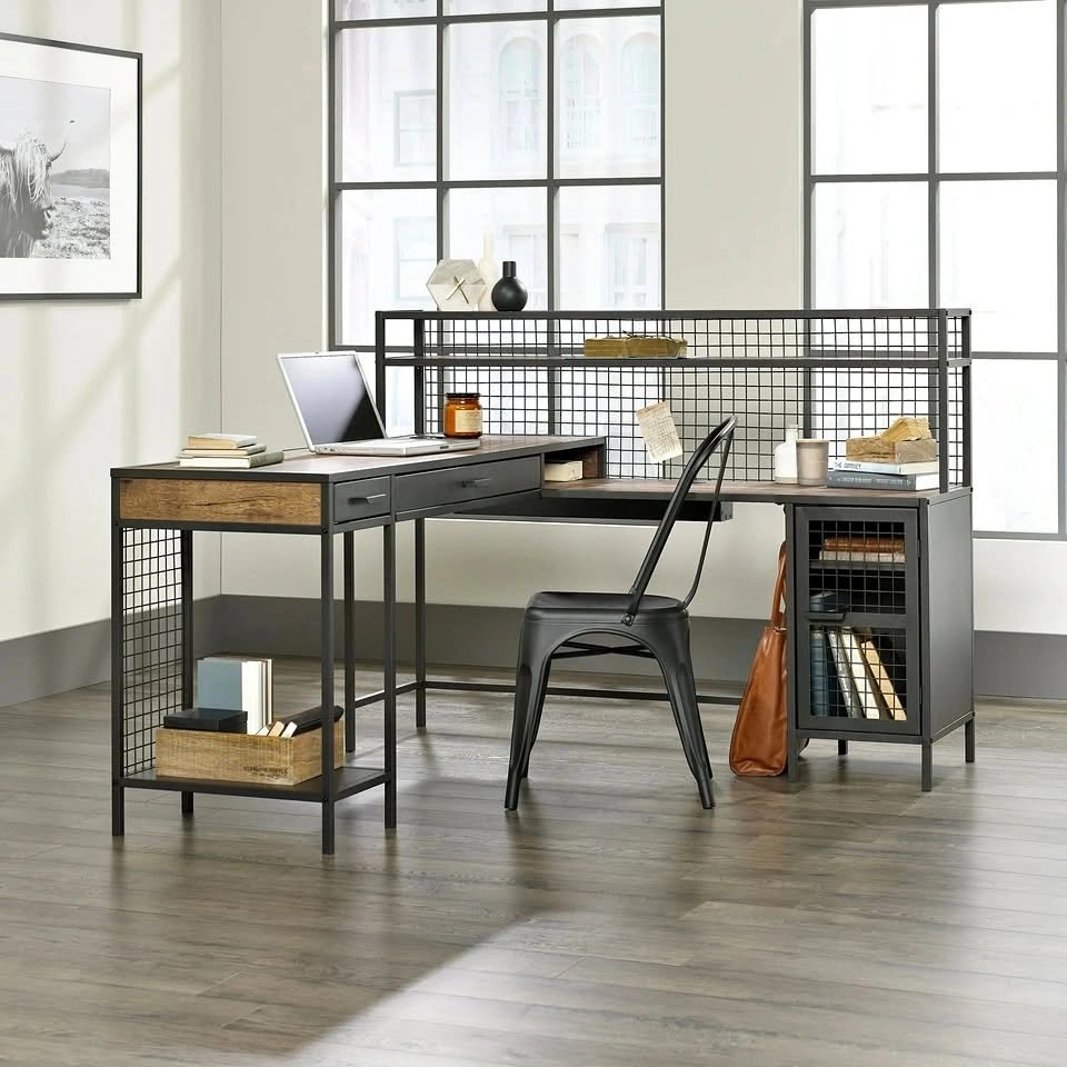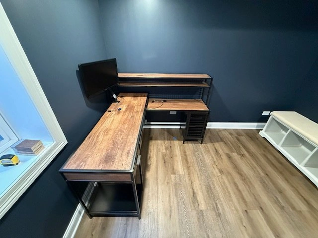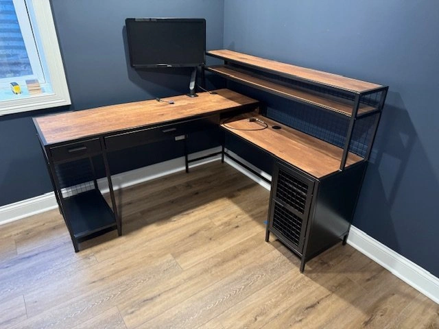 For sale is a used Better Homes & Gardens Lindon Place L-Shaped Desk, Vintage Oak Finish. It's in like new condition, just doesn't fit within my new office. Full details can be found at the below link and normally retails for $325 + tax. I have taken it apart to 2 pieces, so you will need a SUV or truck to pick it up. Also note that the monitor and monitor arm come with it, which is a great addition! https://www.walmart.com/ip/Better-Homes-Gardens-Lindon-Place-L-Shaped-Desk-with-Cage-Vintage-Oak-Finish/364476927