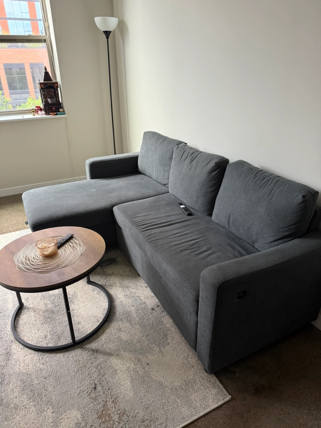 Selling a comfortable gray sectional sofa! It's in good condition and perfect for a living room or entertainment space. The sectional design allows for flexible arrangement and plenty of seating. It's a great addition to any home!