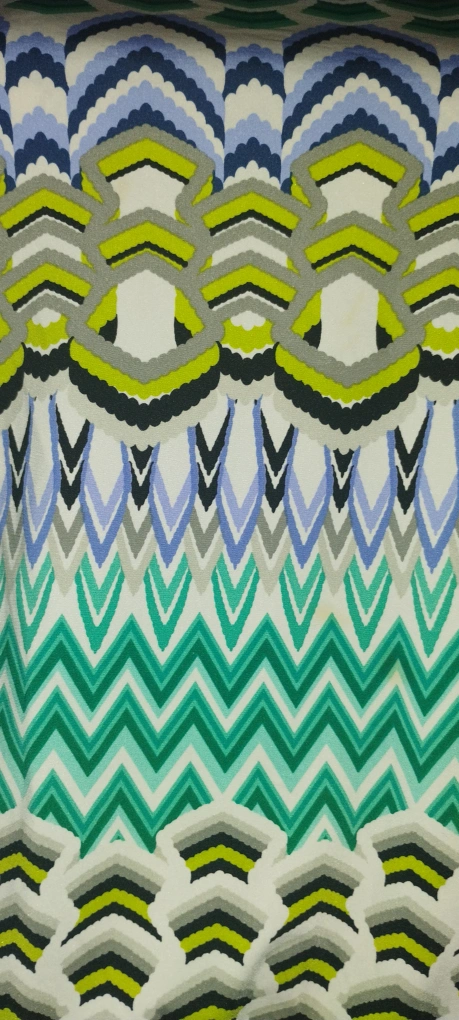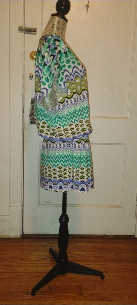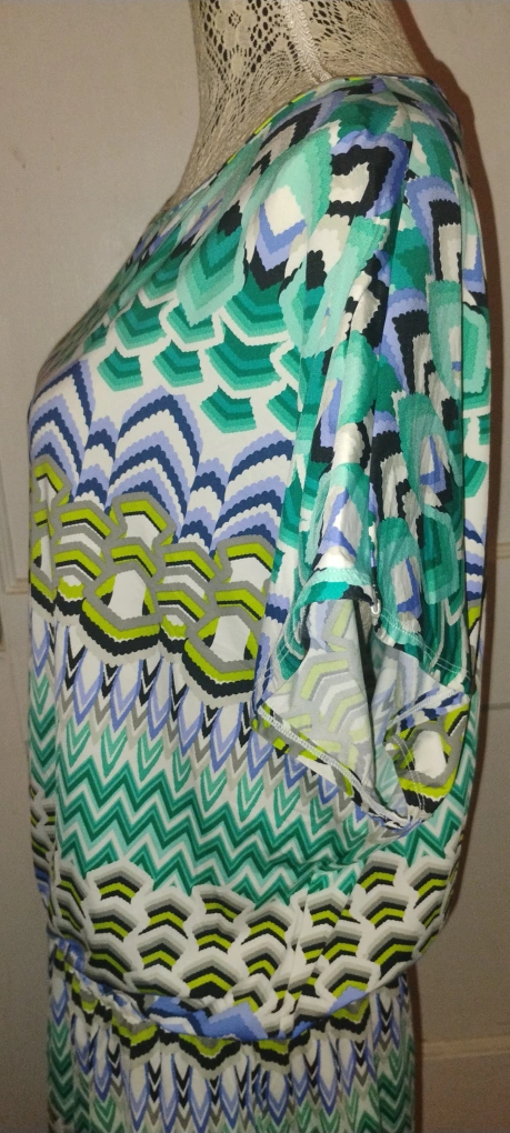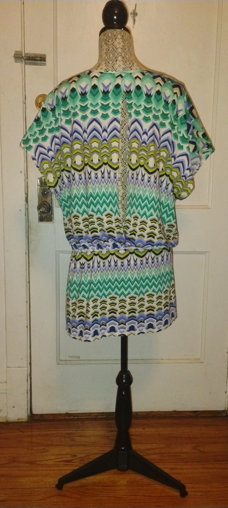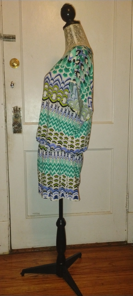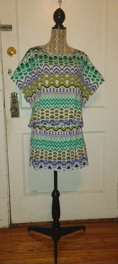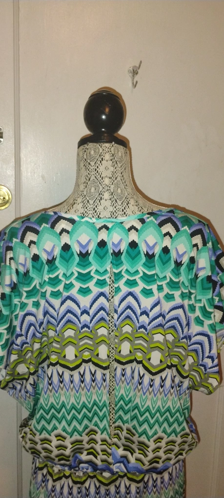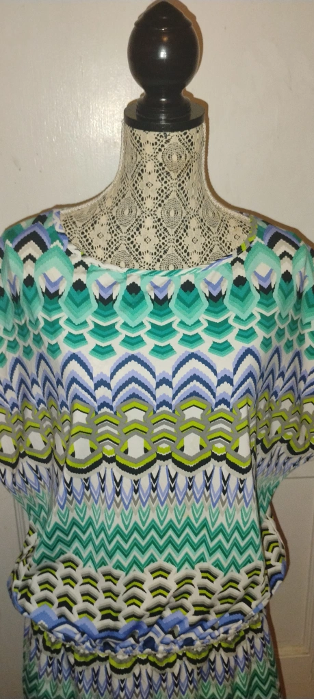 67Cute dress with a geometric pattern in shades of green, blue, and white. It has short sleeves and an elastic waist. Perfect for a casual day out! Cash only Meet up spot Montrose and Milwaukee Anytime will do except for midnight.