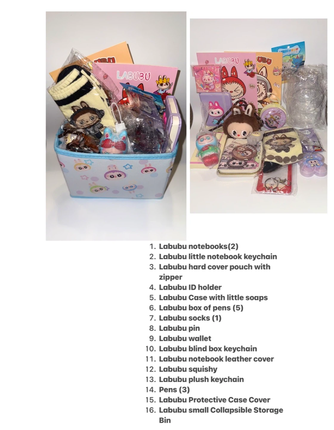 Here's a fun Labubu gift set! It includes a variety of items such as notebooks, a little notebook keychain, a hard cover pouch with a zipper, an ID holder, a case with little soaps, a box of pens, socks, a pin, a wallet, a blind box keychain, a notebook leather cover, a squishy, a plush keychain, pens, a protective case cover, and a small collapsible storage bin
