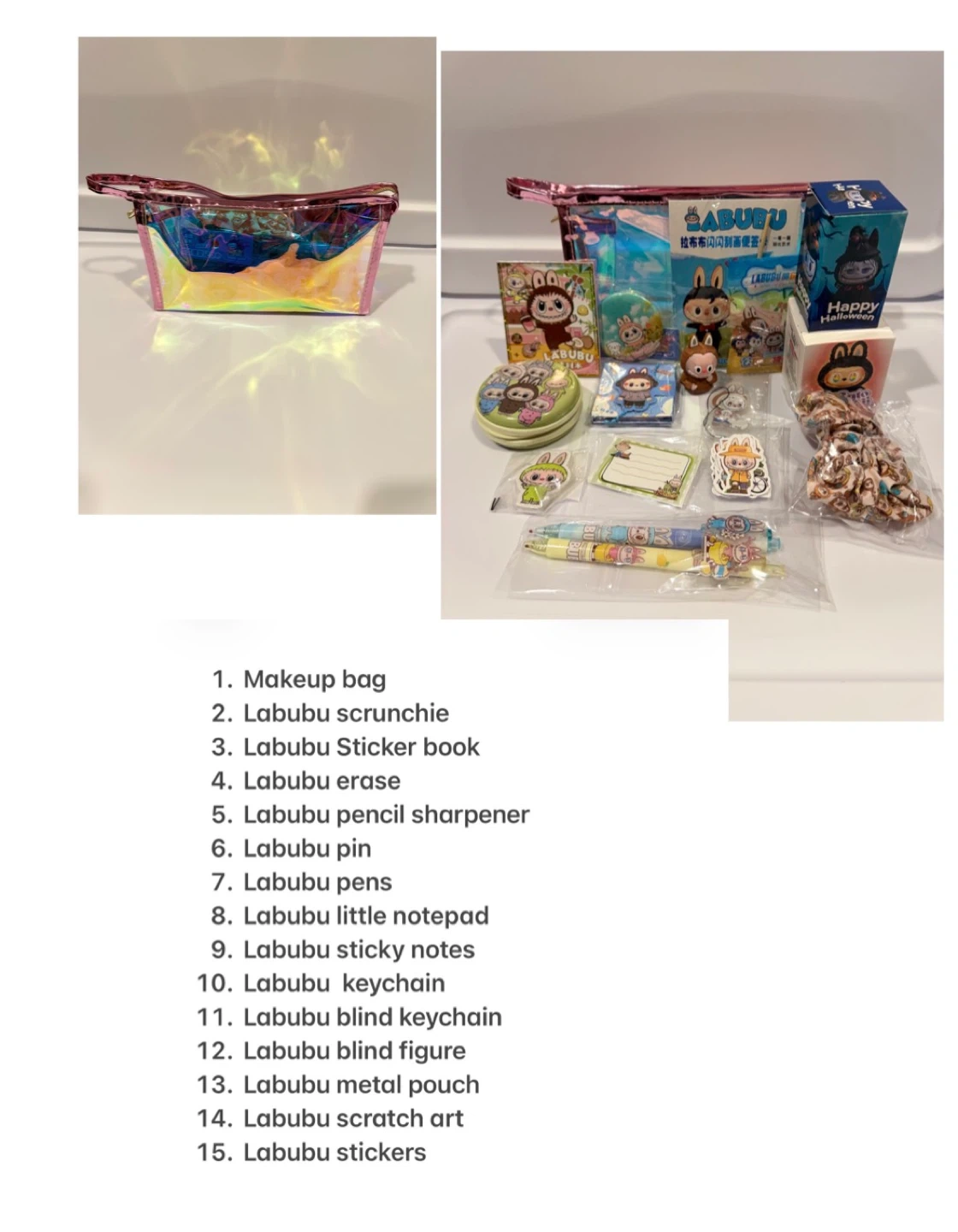 15Selling a collection of Labubu items! Includes a mystery bag, scrunchie, sticker book, erase, pencil sharpener, pin, pens, little notepad, sticky notes, keychains, a blind keychain, a blind figure, a metal pouch, scratch art, and stickers! Perfect for any Labubu fan