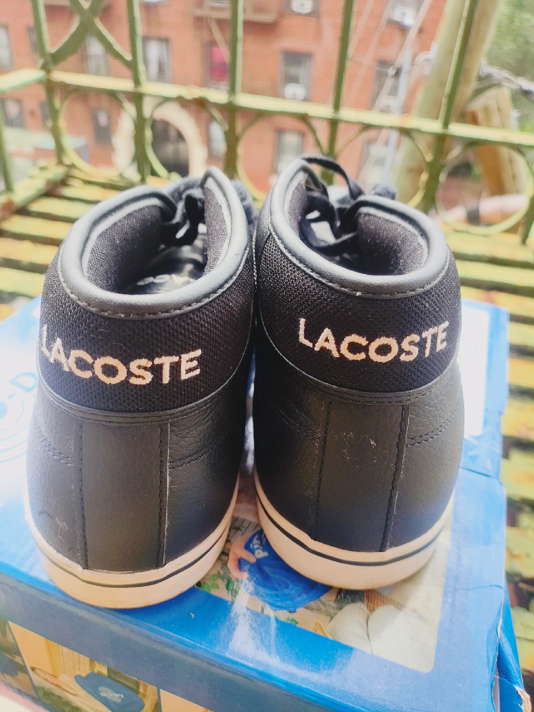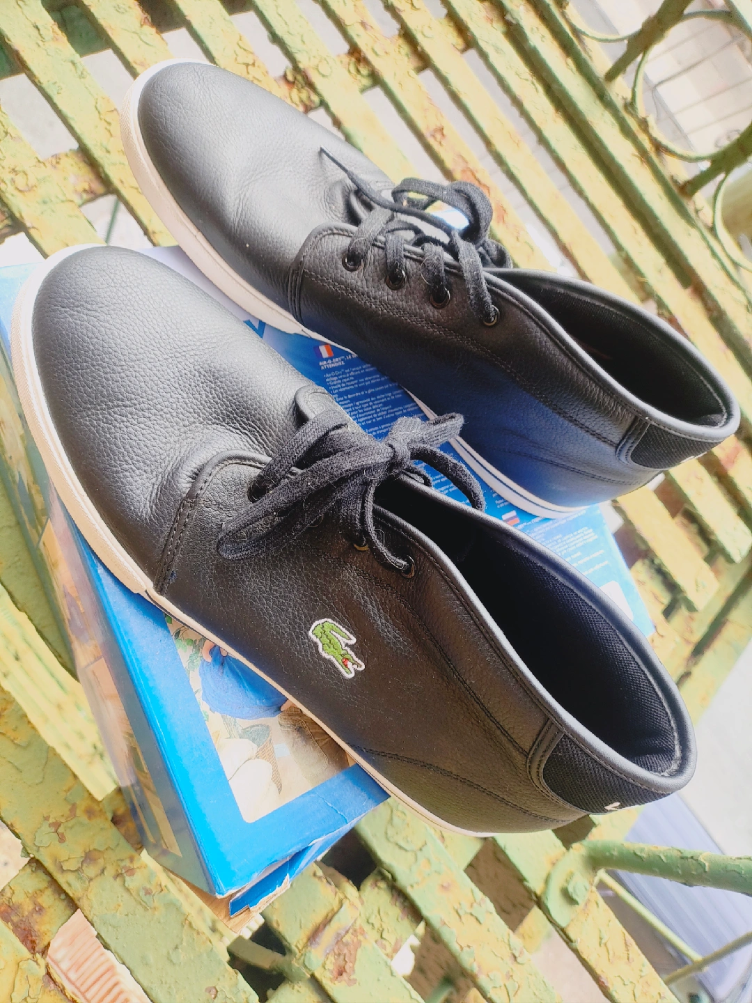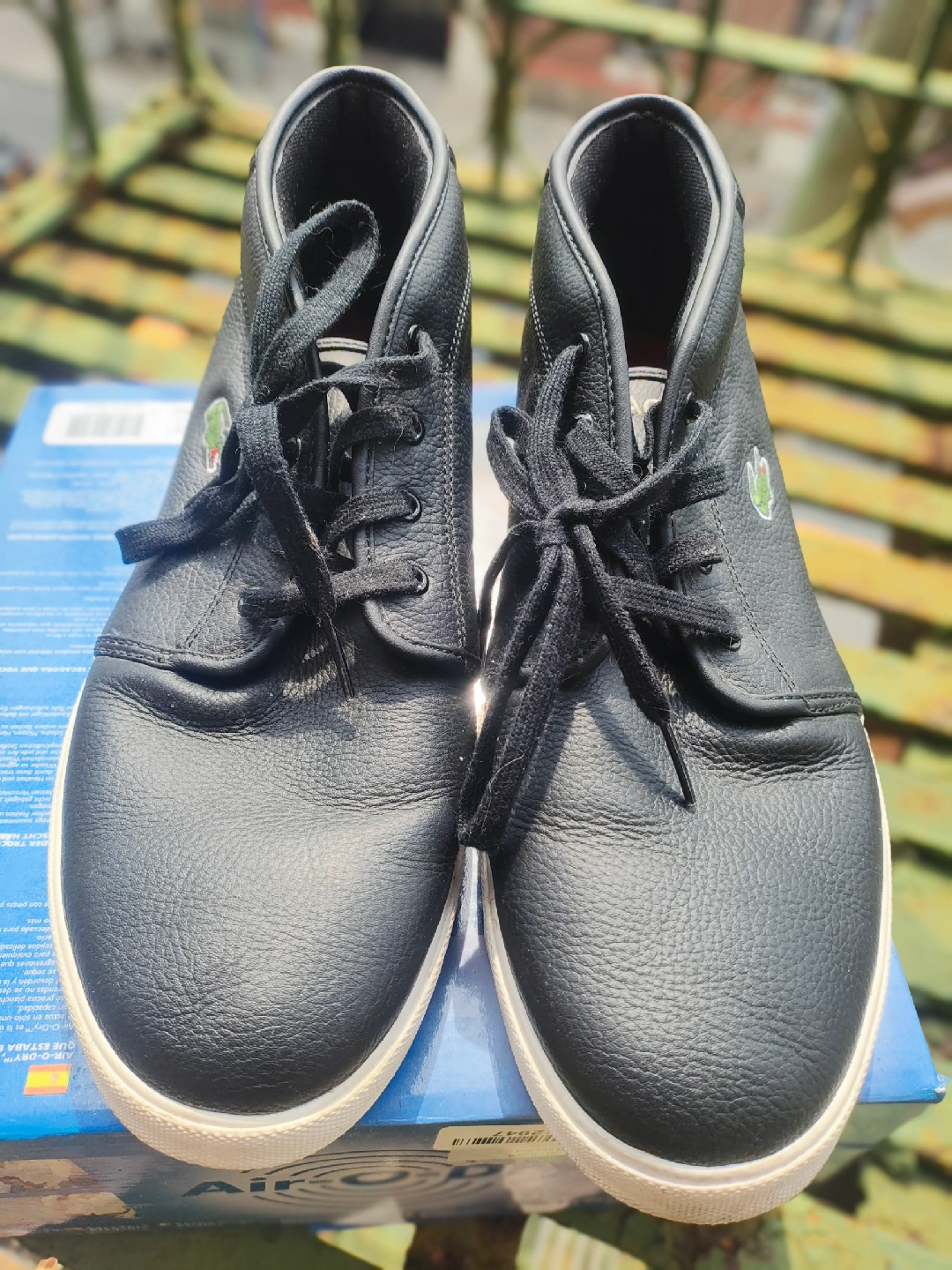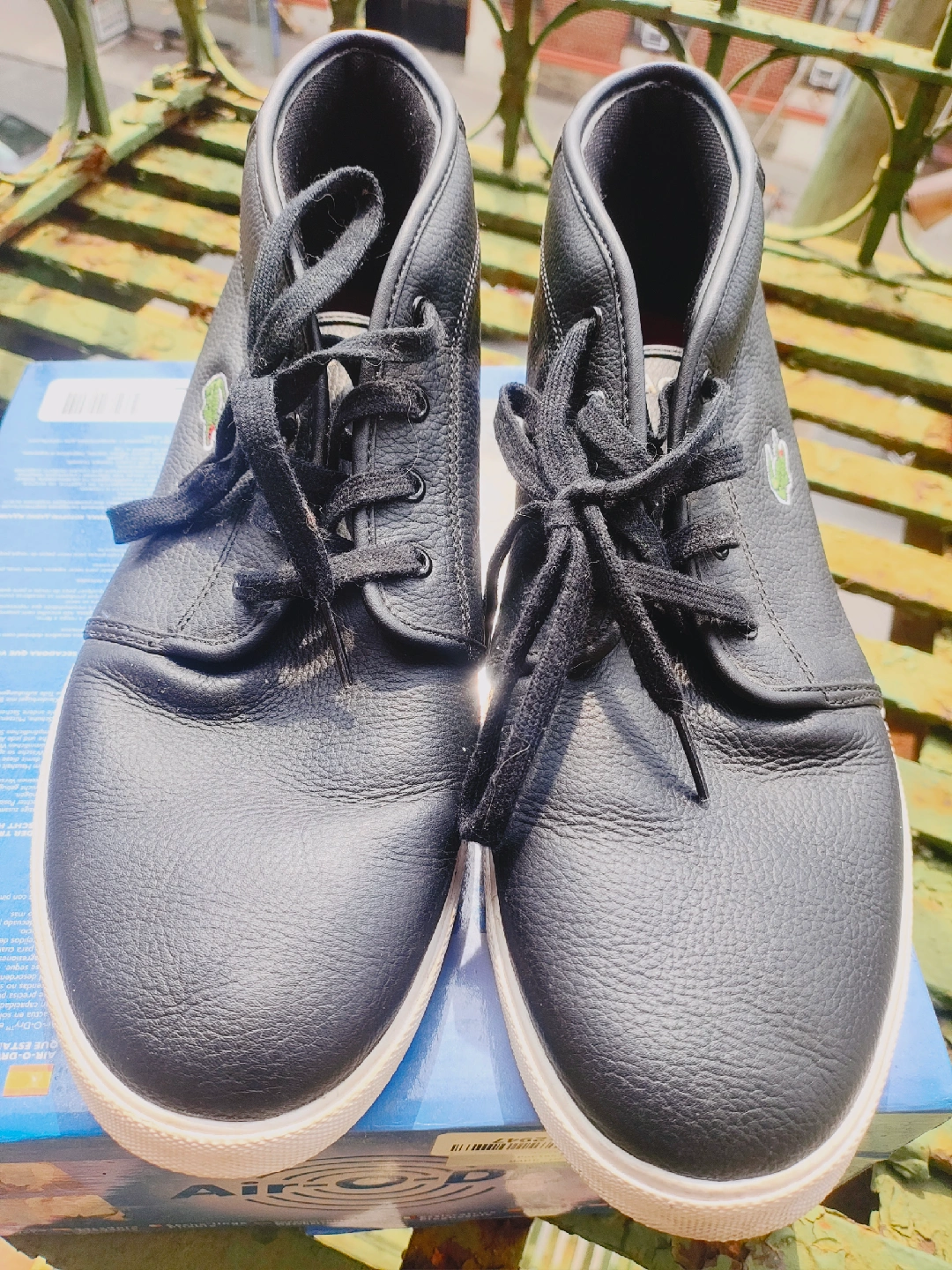 MEN SIZE 13 Selling a pair of Lacoste chukka boots in soft black leather. They have the classic Lacoste logo on the side. These boots are in good condition, lace up. Perfect for a casual yet stylish and comfortable look!