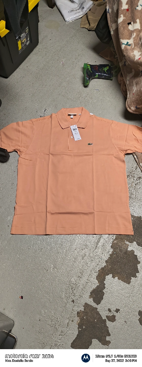 Selling a brand new Lacoste polo shirt in a peach color. It's in new condition with tags still attached!