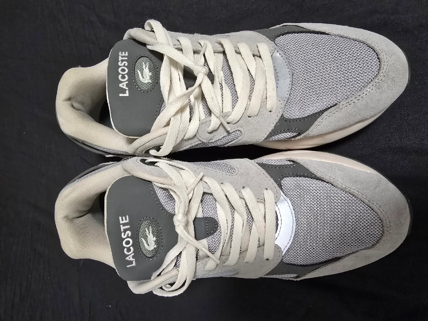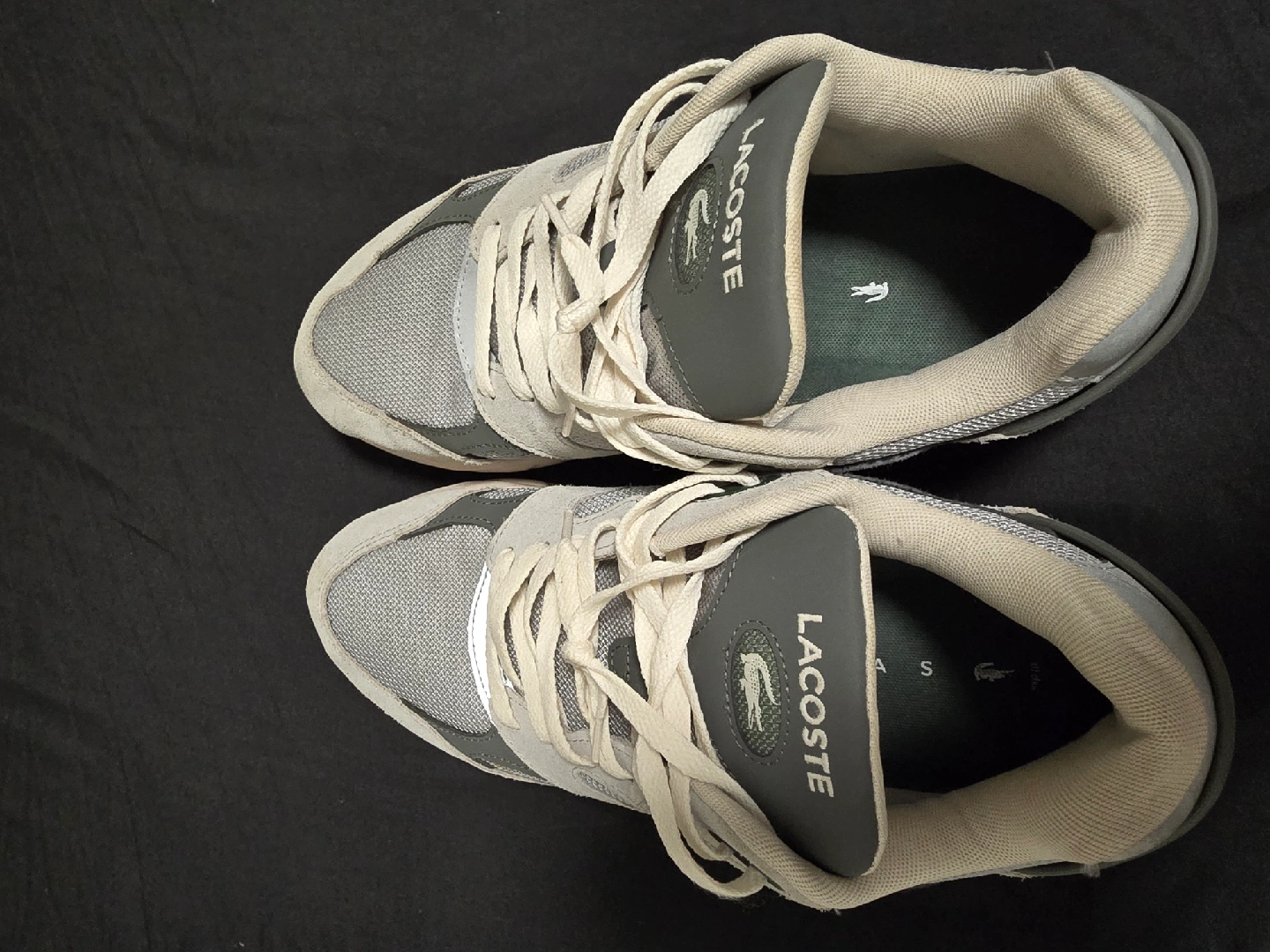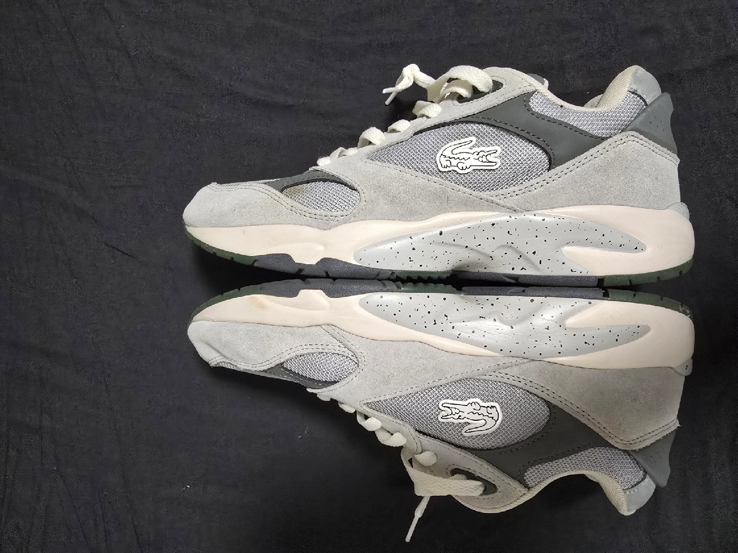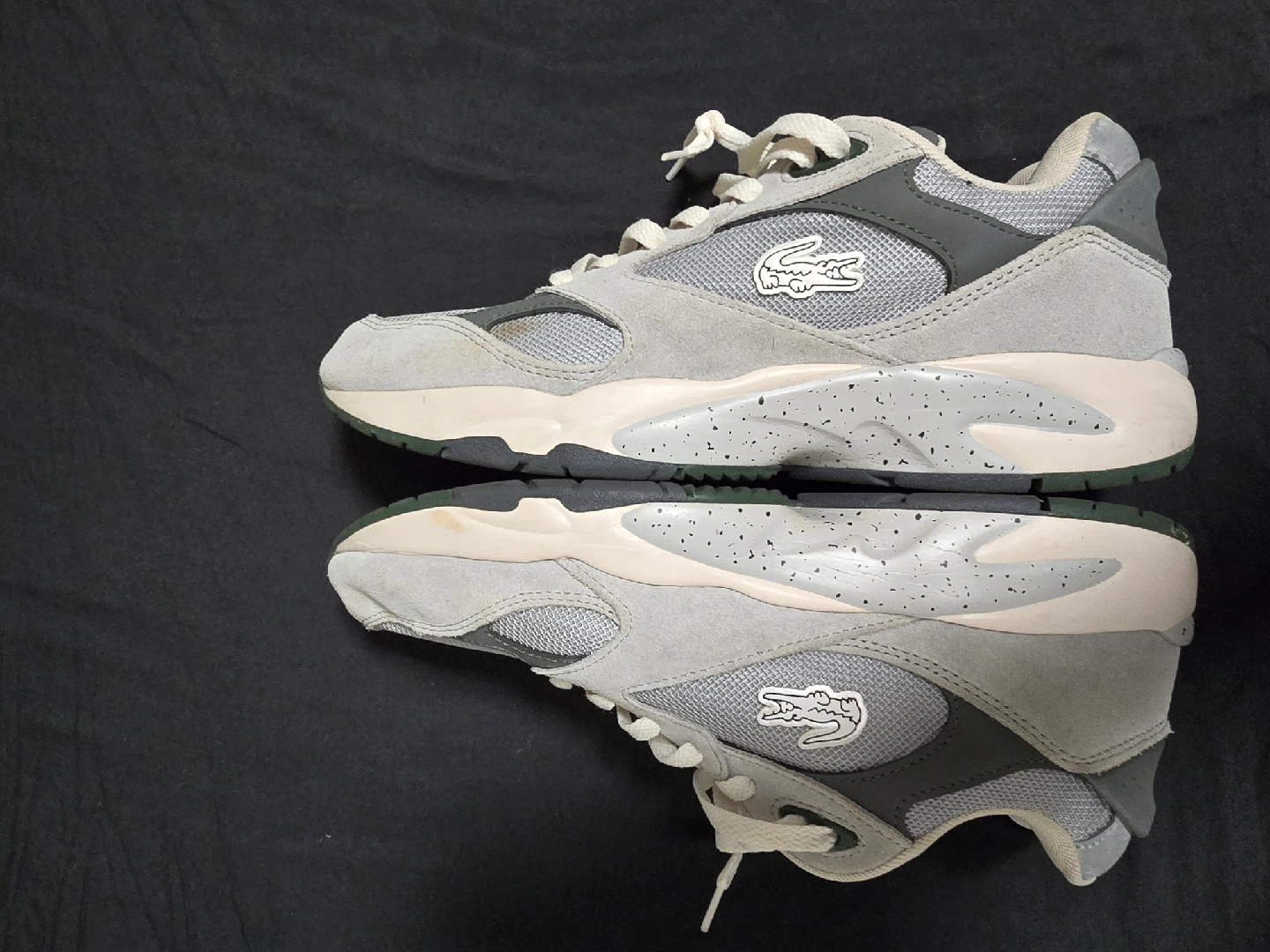 Selling a pair of Lacoste Storm 96 Lo VTG sneakers in men's size 12 (US). These stylish sneakers feature the iconic Lacoste logo. They are a blend of gray and neutral tones, making them versatile for various outfits. Grab these classic kicks!