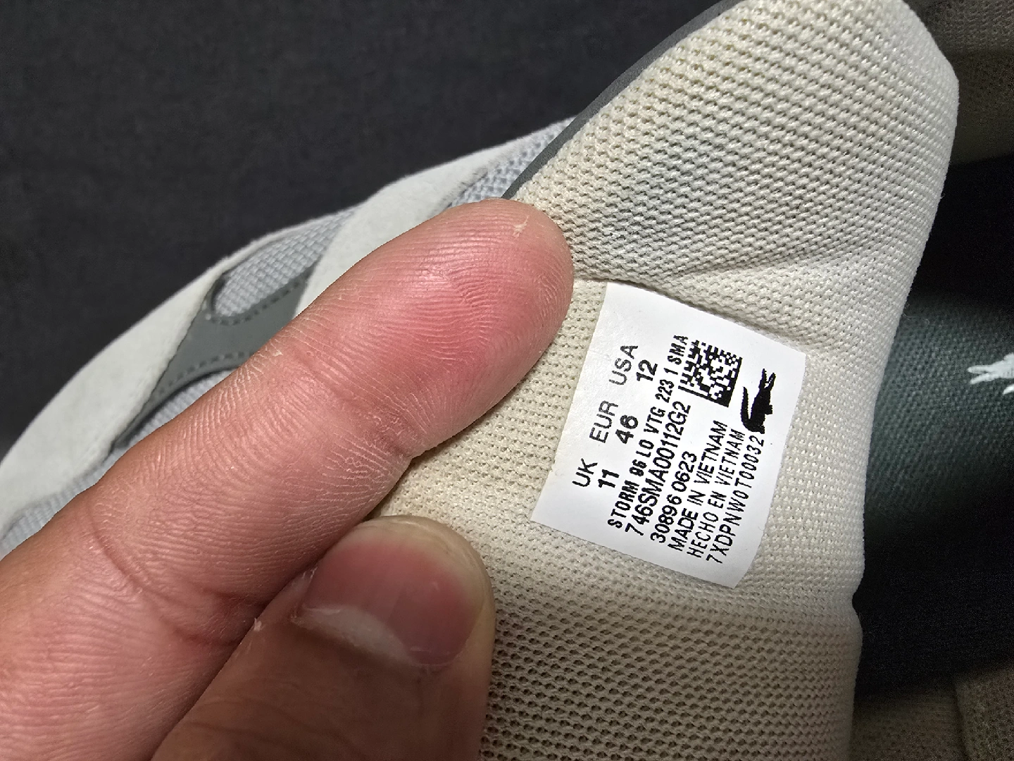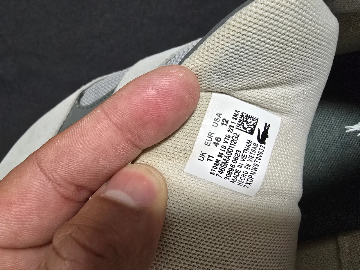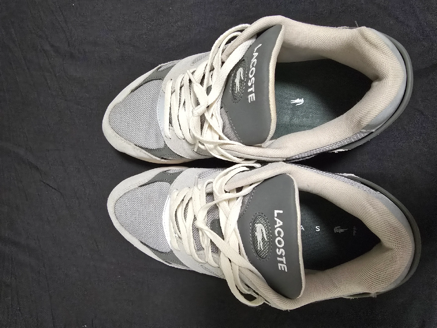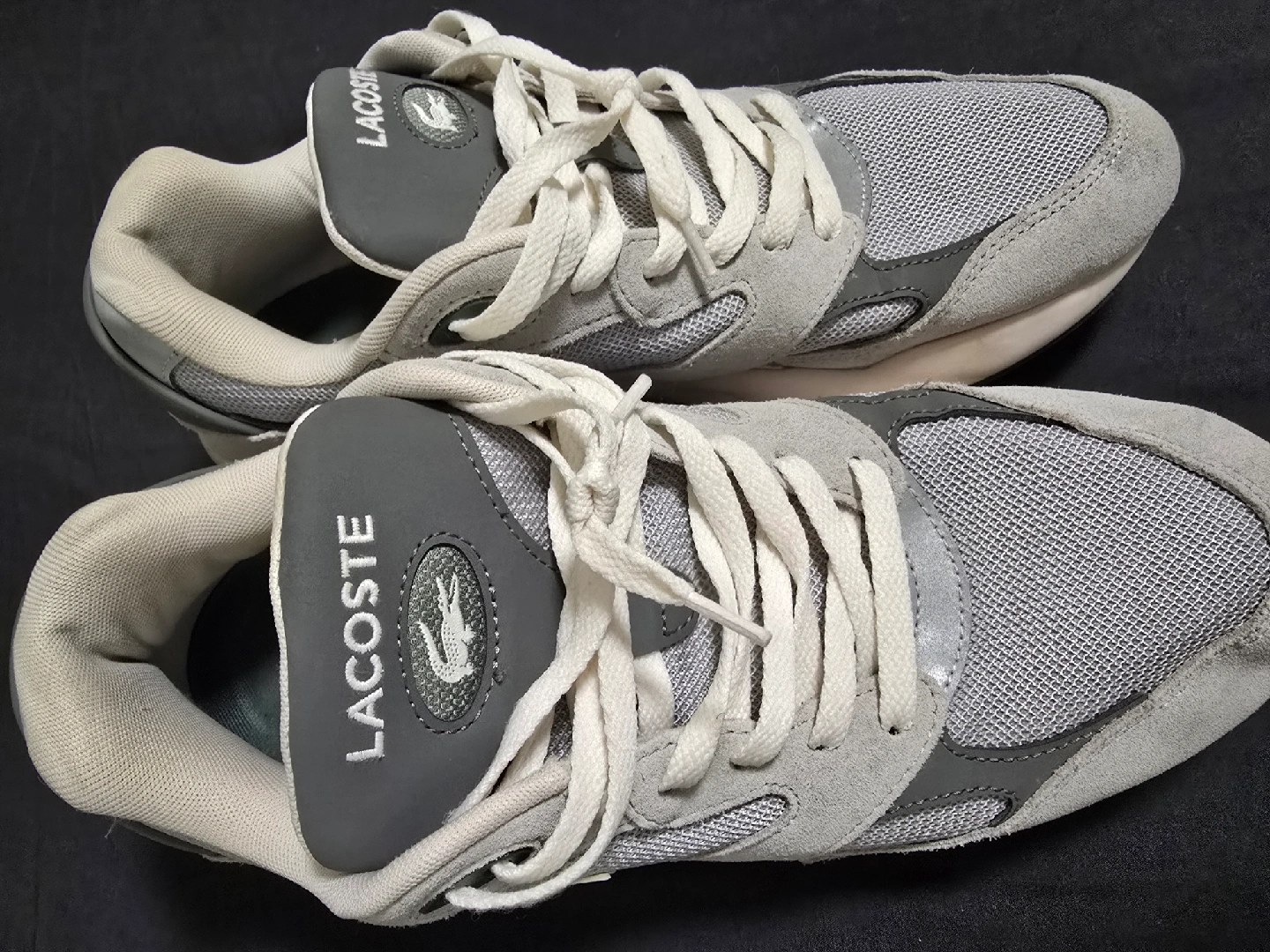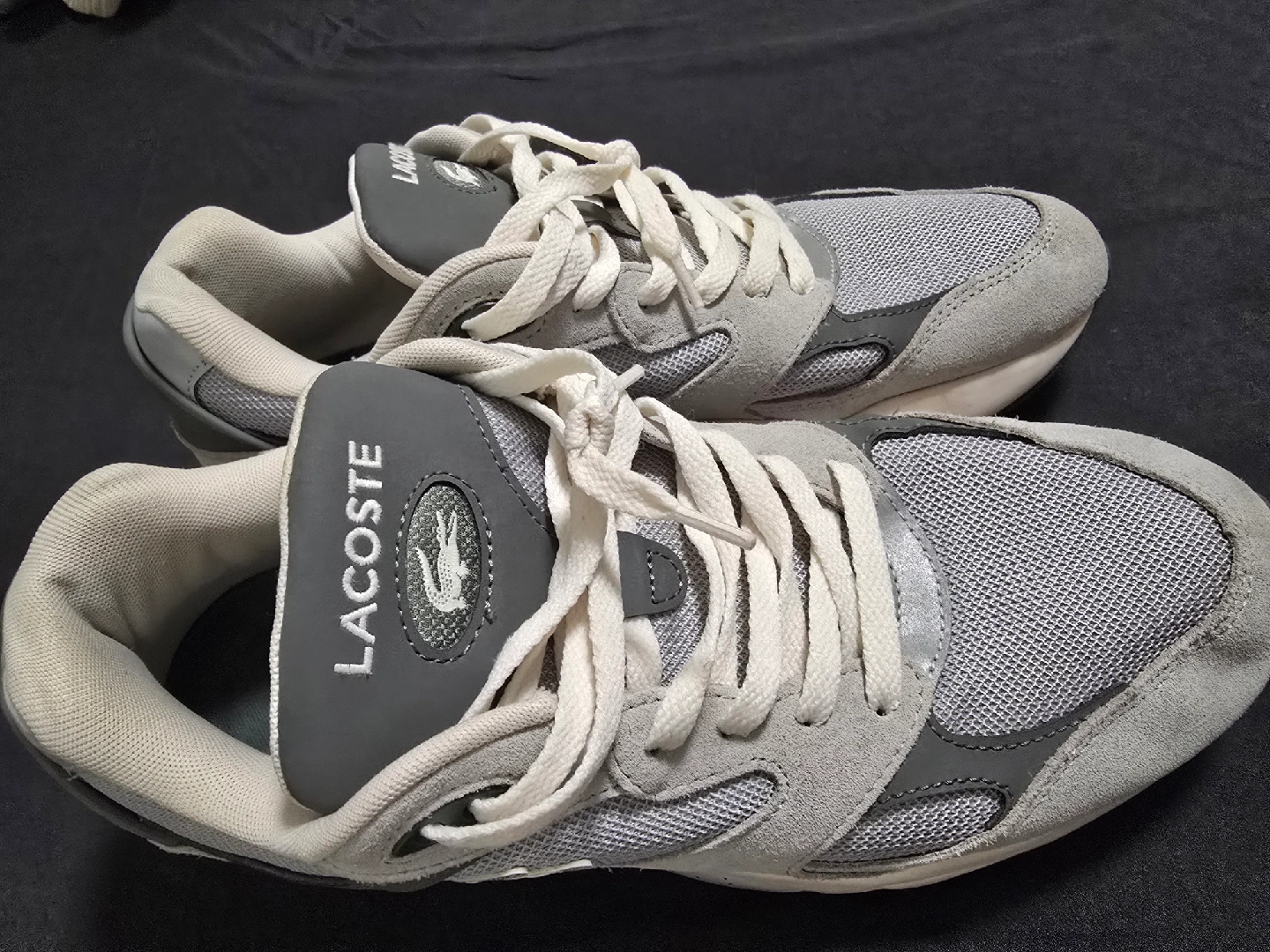 Selling a pair of Lacoste Storm 96 Lo VTG sneakers in men's size 12 (US). These stylish sneakers feature the iconic Lacoste logo. They are a blend of gray and neutral tones, making them versatile for various outfits. Grab these classic kicks!
