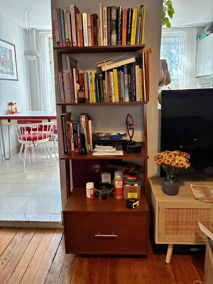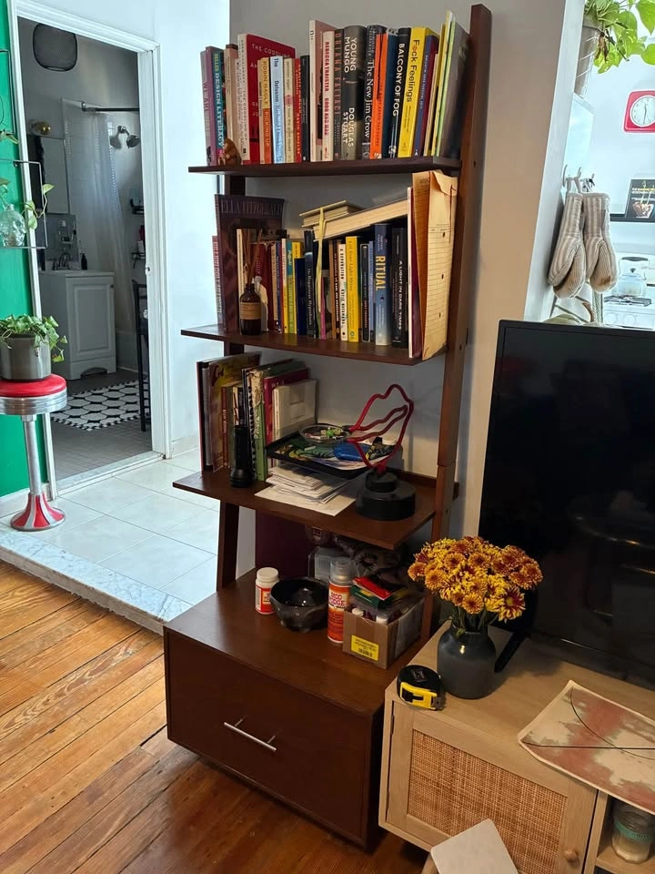 Wood ladder bookshelf originally from Wayfair (leaning in photos because my apartment floor is slanted, not the bookshelf itself!) Love it, just replacing with wall-mounted shelves Some light scratching (pictured) but otherwise good condition - easy to take apart/put together for transport, holds a lot https://www.wayfair.com/furniture/pdp/hokku-designs-carbin-69-h-x-2475-w-solid-wood-ladder-bookcase-w005698477.html? Pickup in Williamsburg near domino park