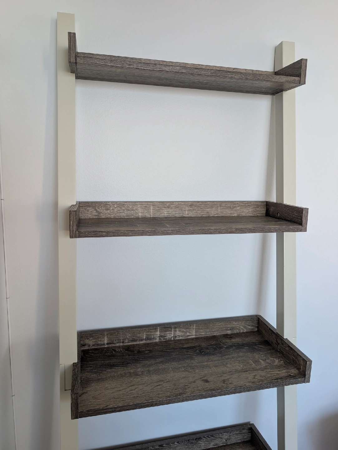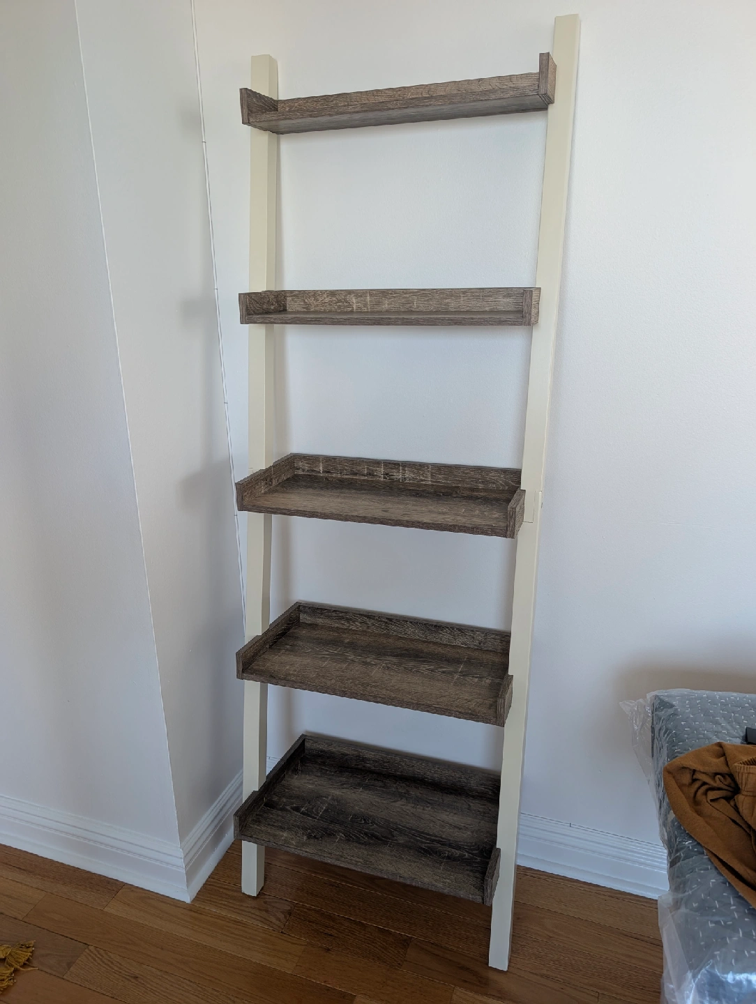 Selling a ladder style bookshelf with a wood and white finish. It's perfect for adding some extra storage and style to any room. It's in great condition and ready for a new home only reason I'm selling is space in a new studio.