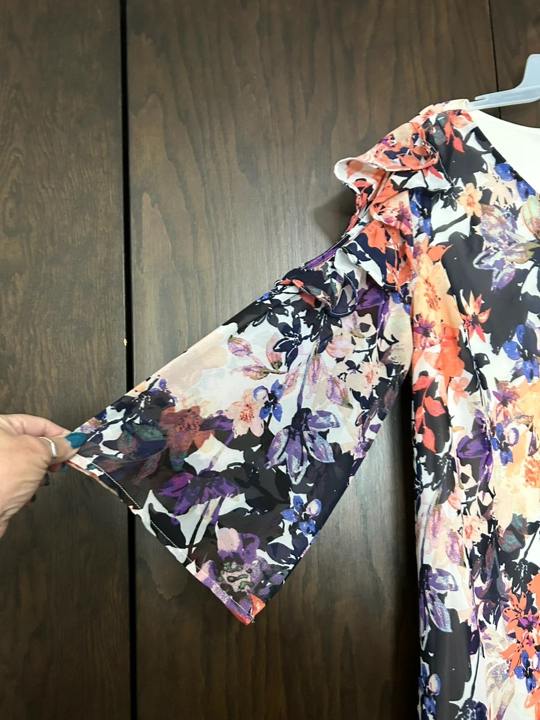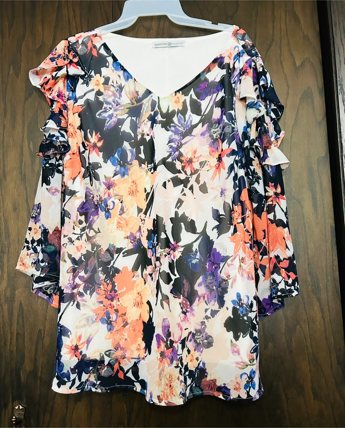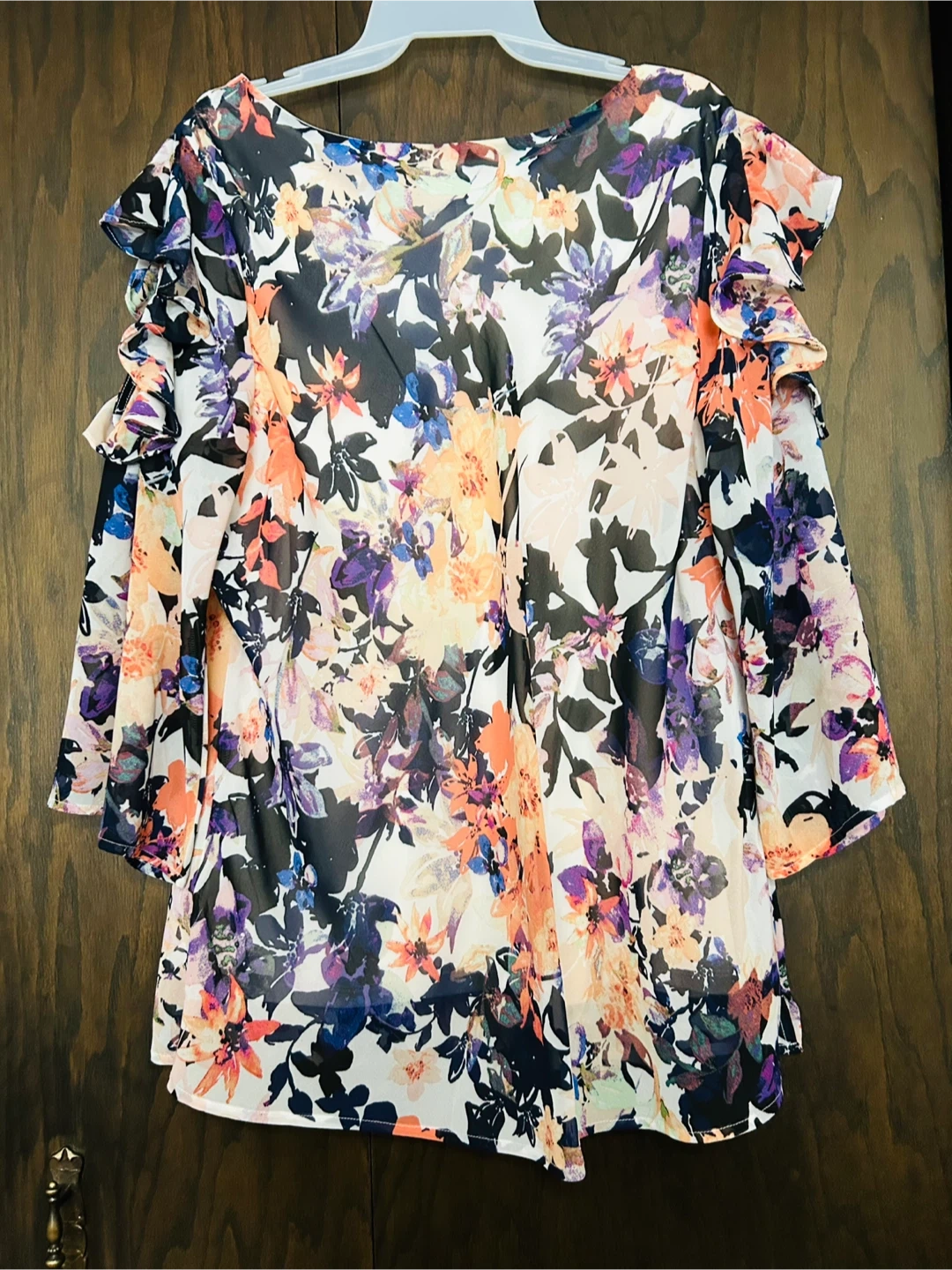 Ladies cold shoulder top with long sleeves with ruffles at the top. This blouse is sheer with a full lining sewn in. The fabric is 100% polyester. The size is XL and it measures 22” across the front and it is 27” long. From Avon Signature Collection. Nice condition.