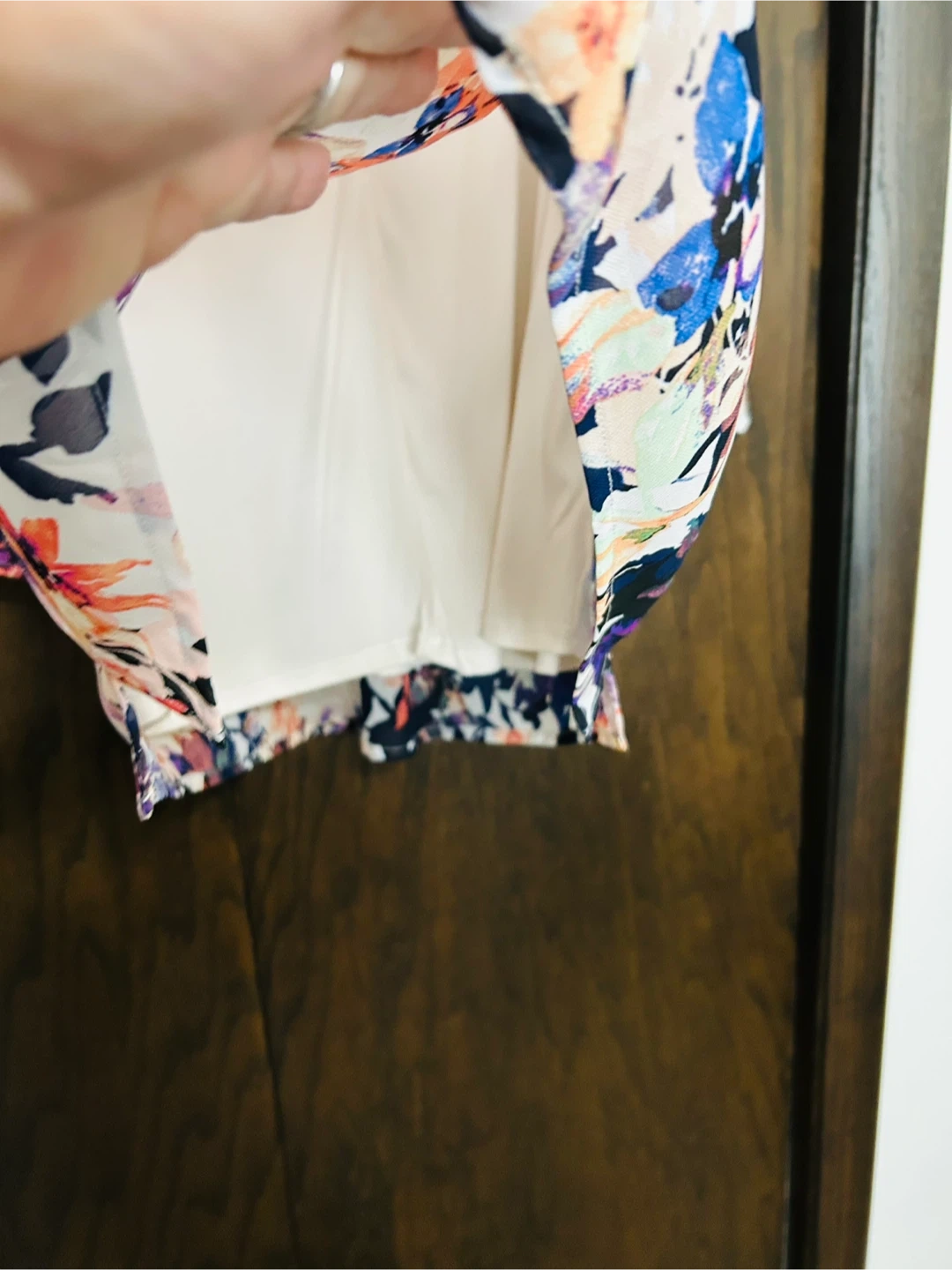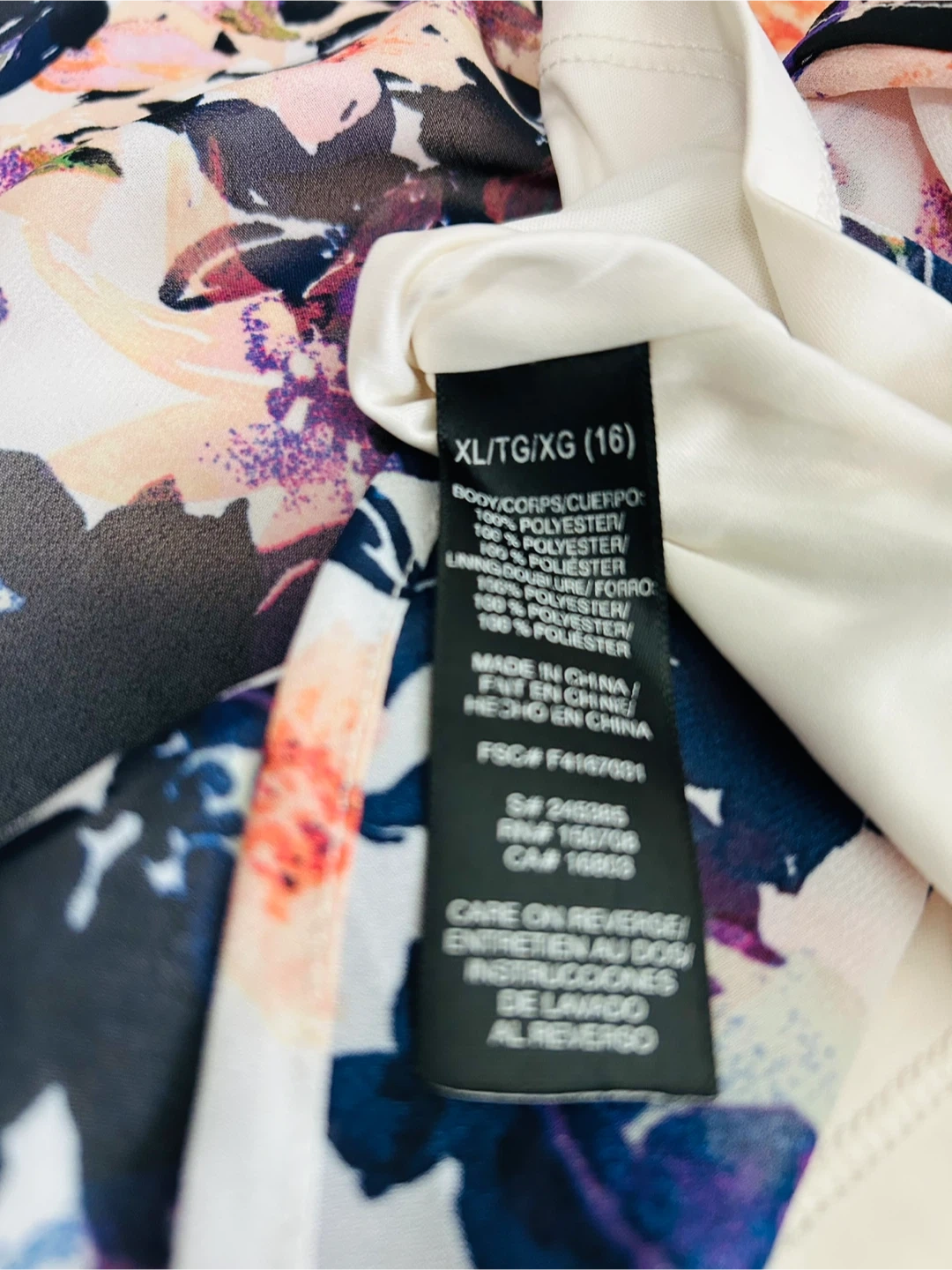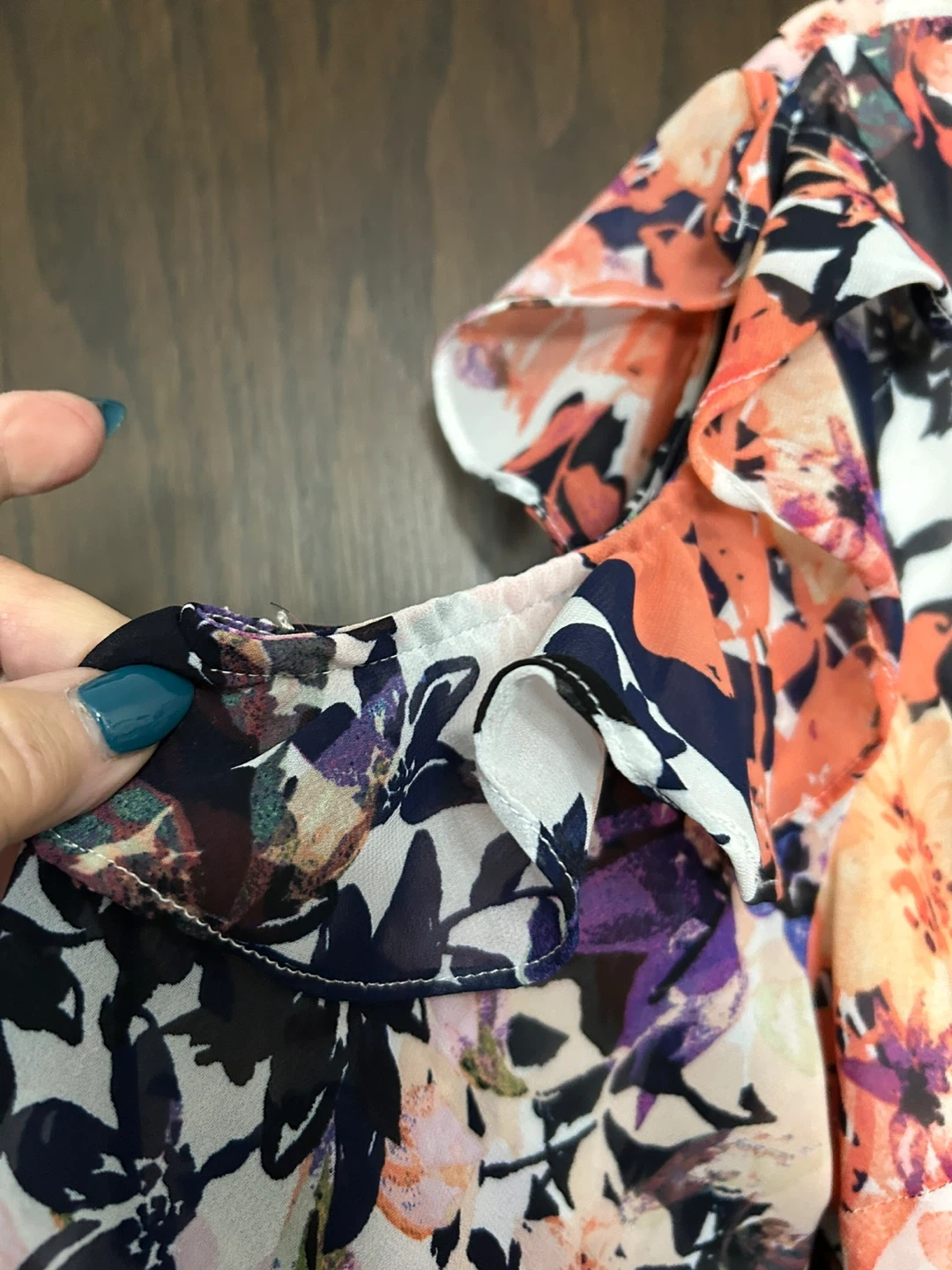 Ladies cold shoulder top with long sleeves with ruffles at the top. This blouse is sheer with a full lining sewn in. The fabric is 100% polyester. The size is XL and it measures 22” across the front and it is 27” long. From Avon Signature Collection. Nice condition.