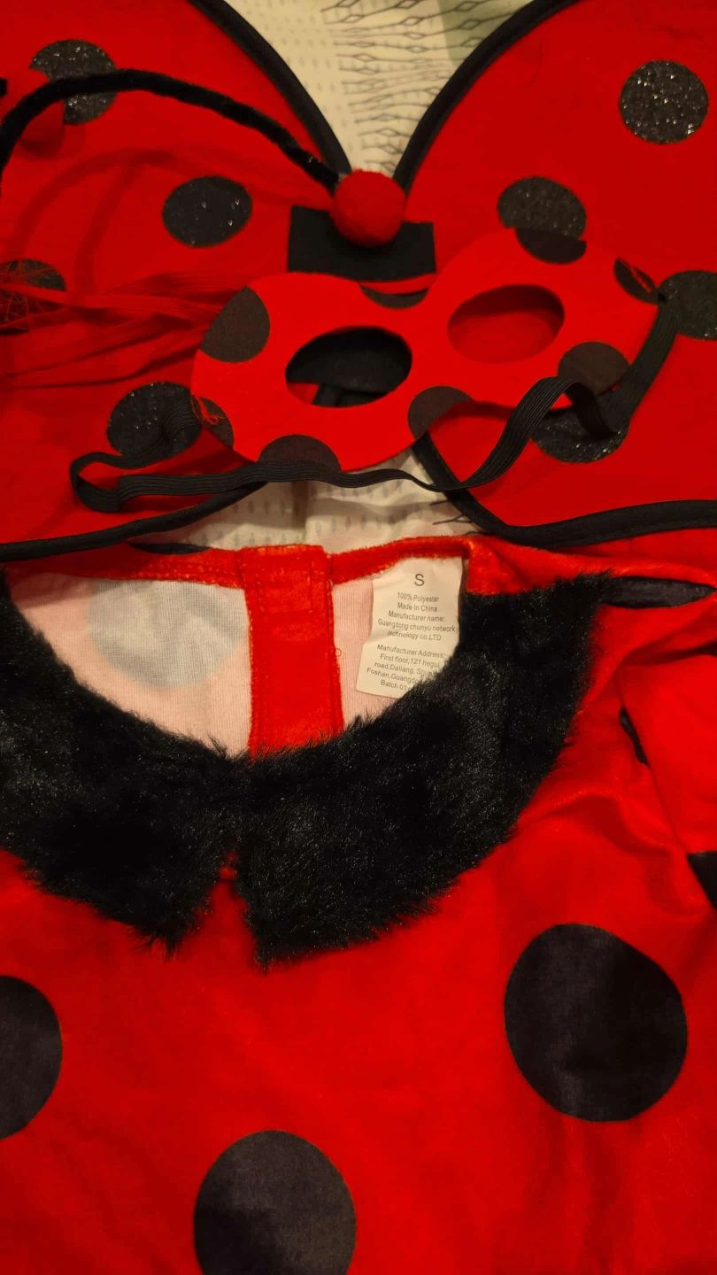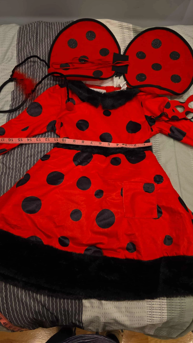 183Cute ladybug costume, perfect for Halloween! It's a size small and comes with the dress, wings, and headband. The costume is red with black polka dots and has black faux fur trim. It's made of 100% polyester.