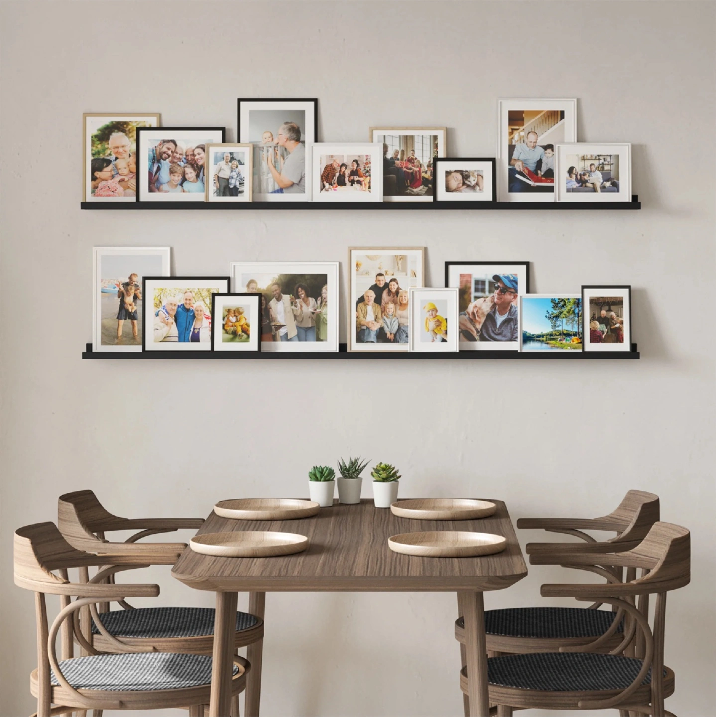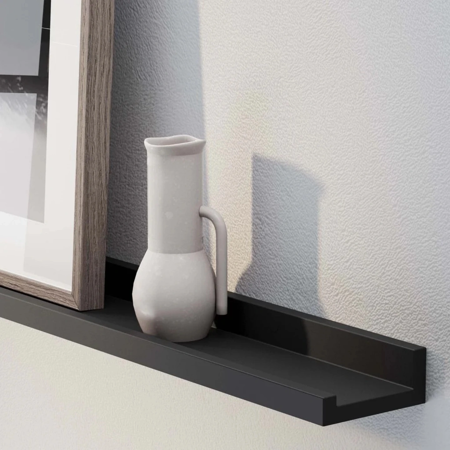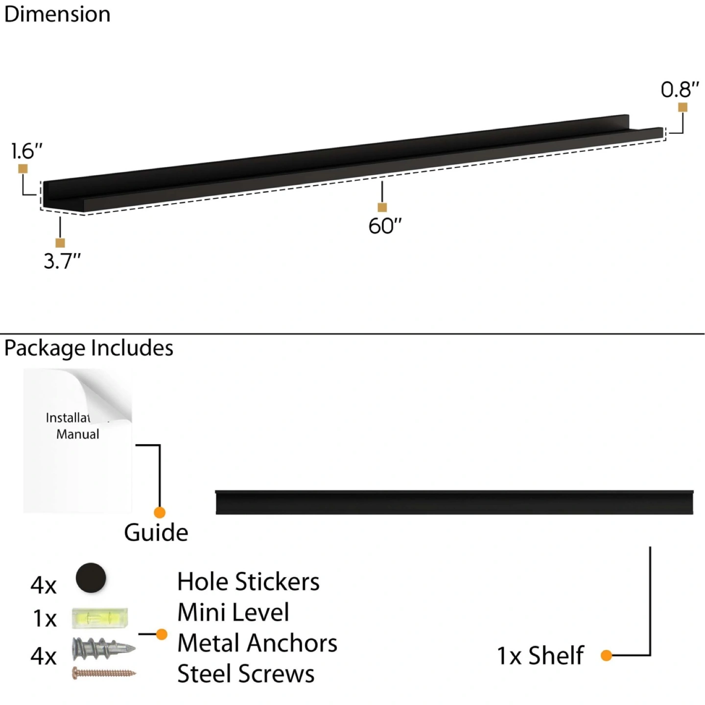 15Display your beautiful photo frames or art frames to personalize your living room decor. Create a wall decor only with Lagos 60'' black picture ledge wall shelves. Complement your home decor and turn any dull wall into a picture frames collage! This sleek floating shelf is perfect for creating an aesthetic room decor while saving space. Use this ledge shelf for wall to create a boho bedroom wall decor, cute nursery decor, living room decor, farmhouse kitchen decor and more! Wallniture Lagos wall mounted shelves are very simple to set up, you can easily install the long floating shelves by following the steps in the user manual. Enrich your walls with the LAGOS 60 inch display shelf for collectibles! Its pure white finish brings a touch of refined serenity, creating a perfect stage for books, pictures, collectibles, artwork, and cherished accents. Order now to infuse your space with timeless grace! Engineered wood, black wall shelves Solid and sturdy construction Tiered discounts based on the number of ledge shelf purchased Store your books, vinyls and pictures with stylish ledge shelf Display your photos, paintings, and collectibles Color: Black Product Dimensions(Each): H 1.6"x L 60" x D 3.7" Weight Capacity (Each): Up to 30 Lbs (Drywall Installation) Package Also Includes: Wall Mounting Hardware, and Instructions Manual.