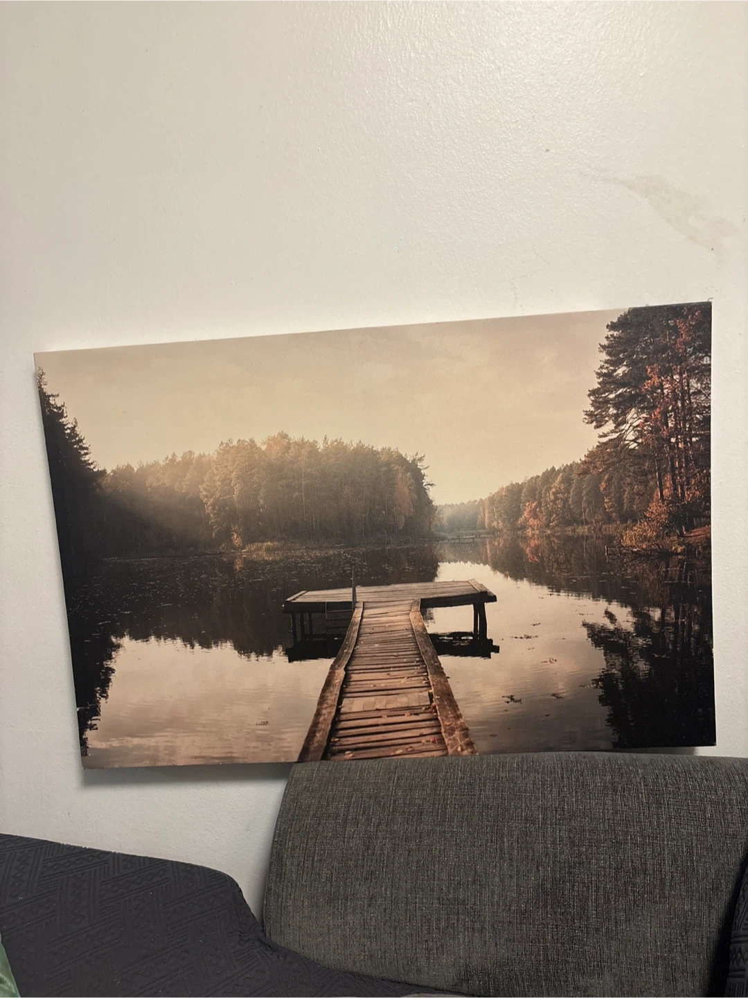 This is a canvas print featuring a serene lake and dock scene. It would look great in any room!