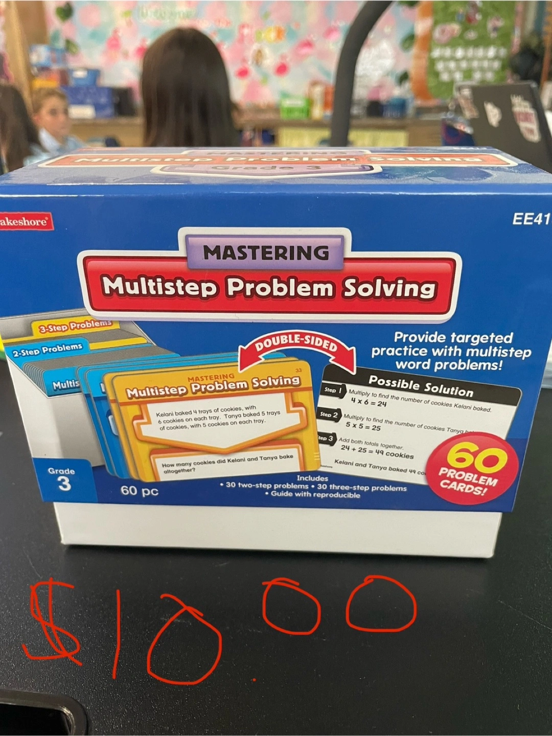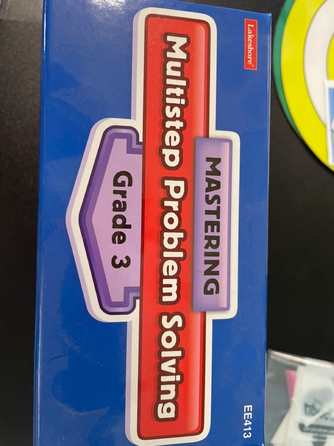 I'm selling a Lakeshore Mastering Multistep Problem Solving set for Grade 3! It includes 60 problem cards and targets practice with multistep word problems. There are 30 two-step problems and 30 three-step problems. A guide with reproducible materials is also included. WOODRIDGE OR BROOKFIELD AREA.