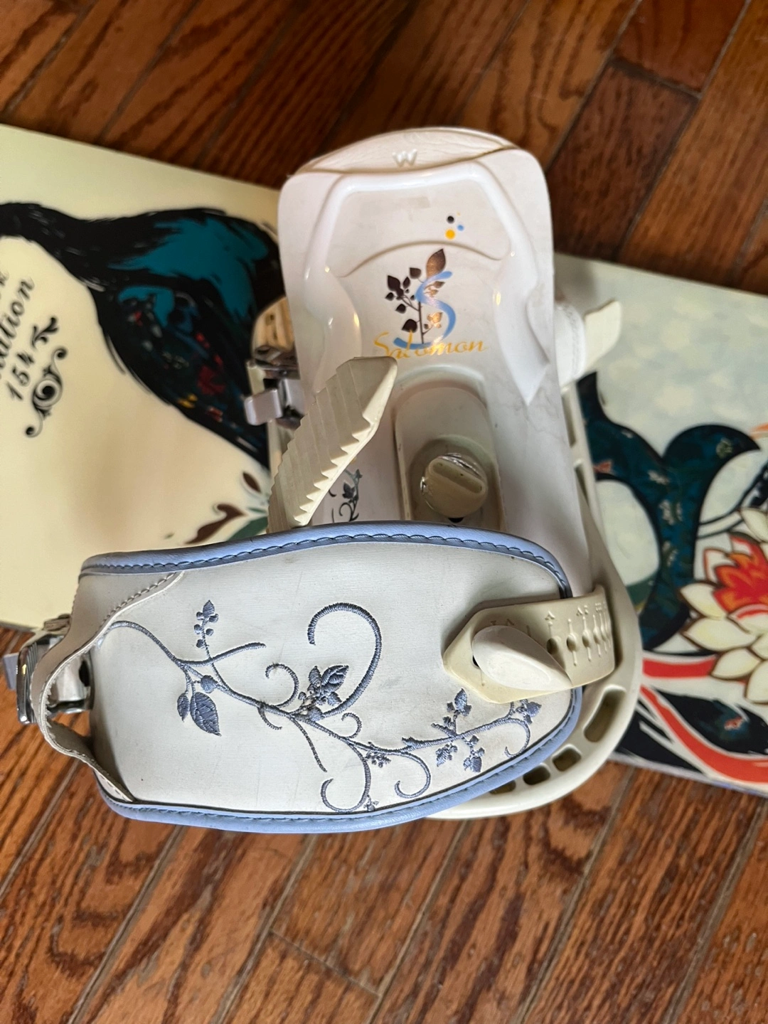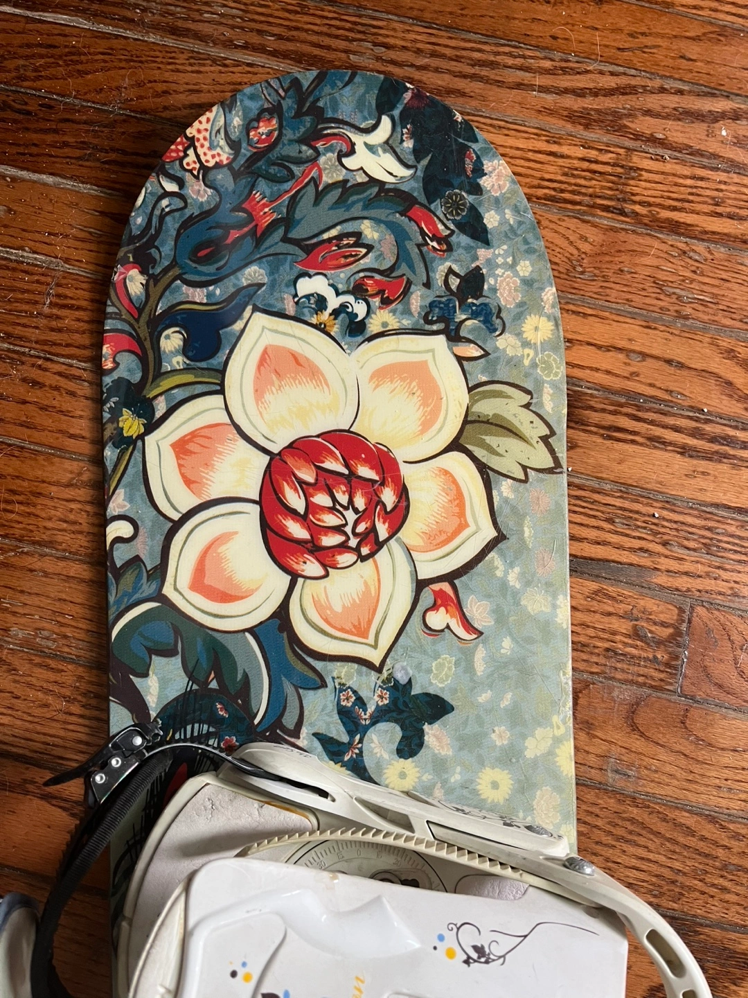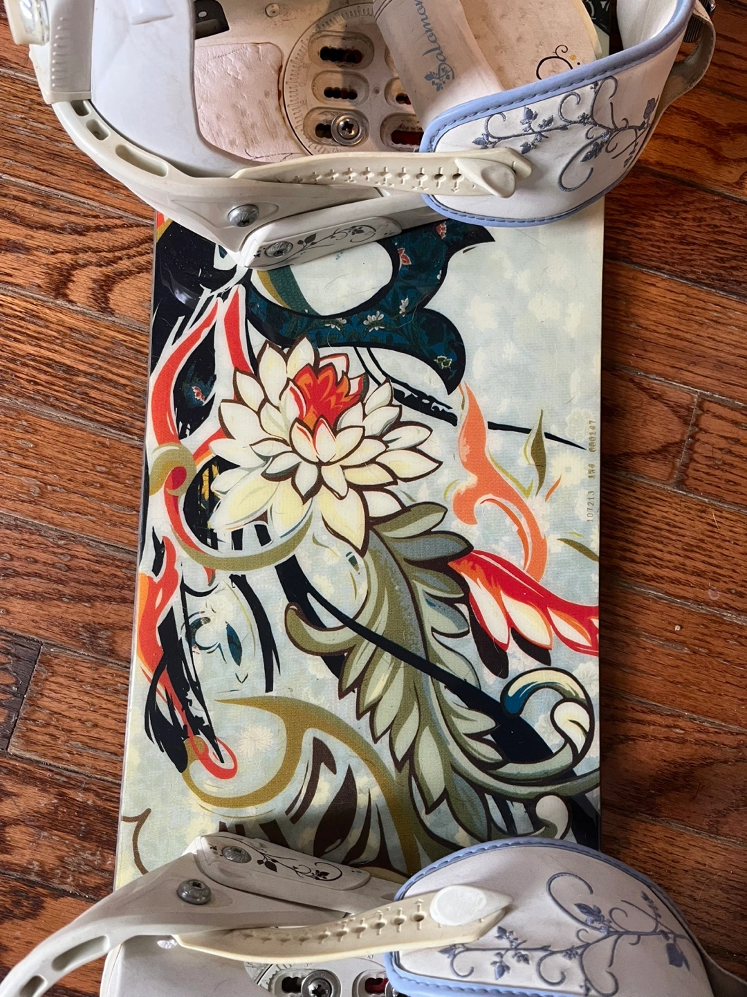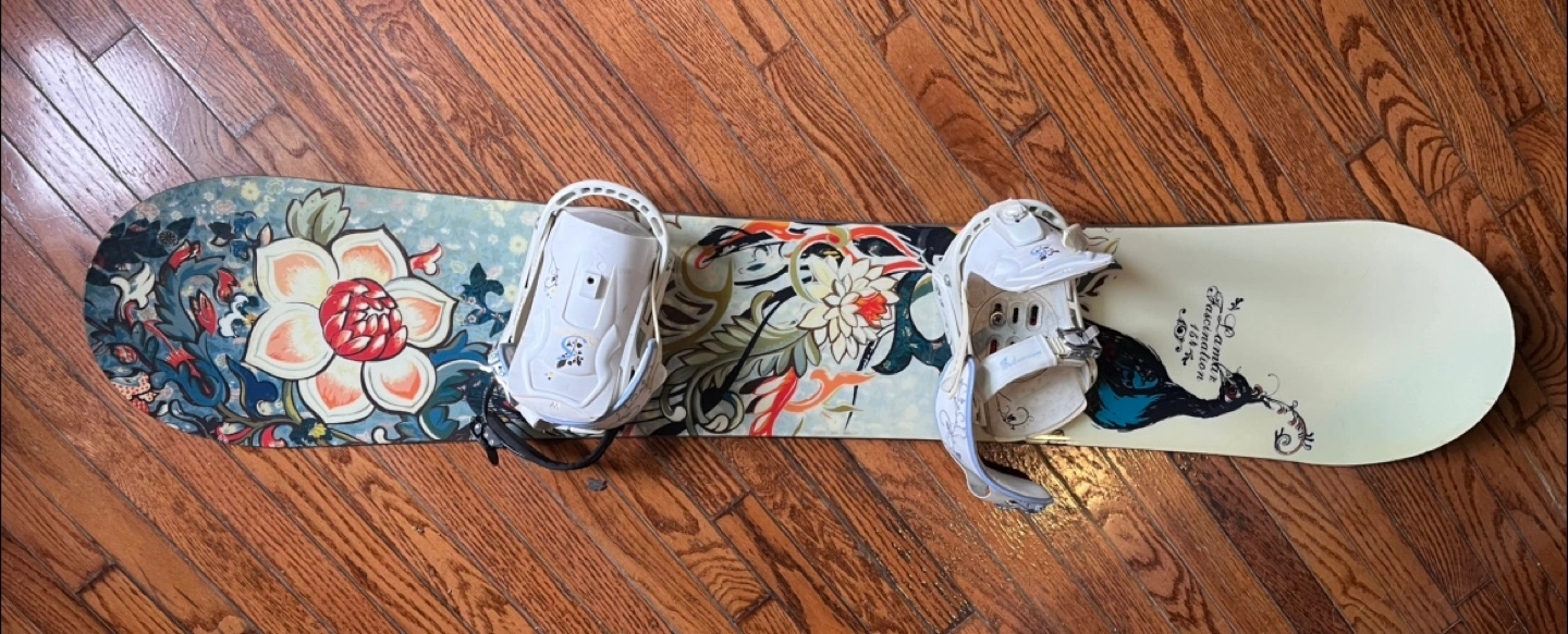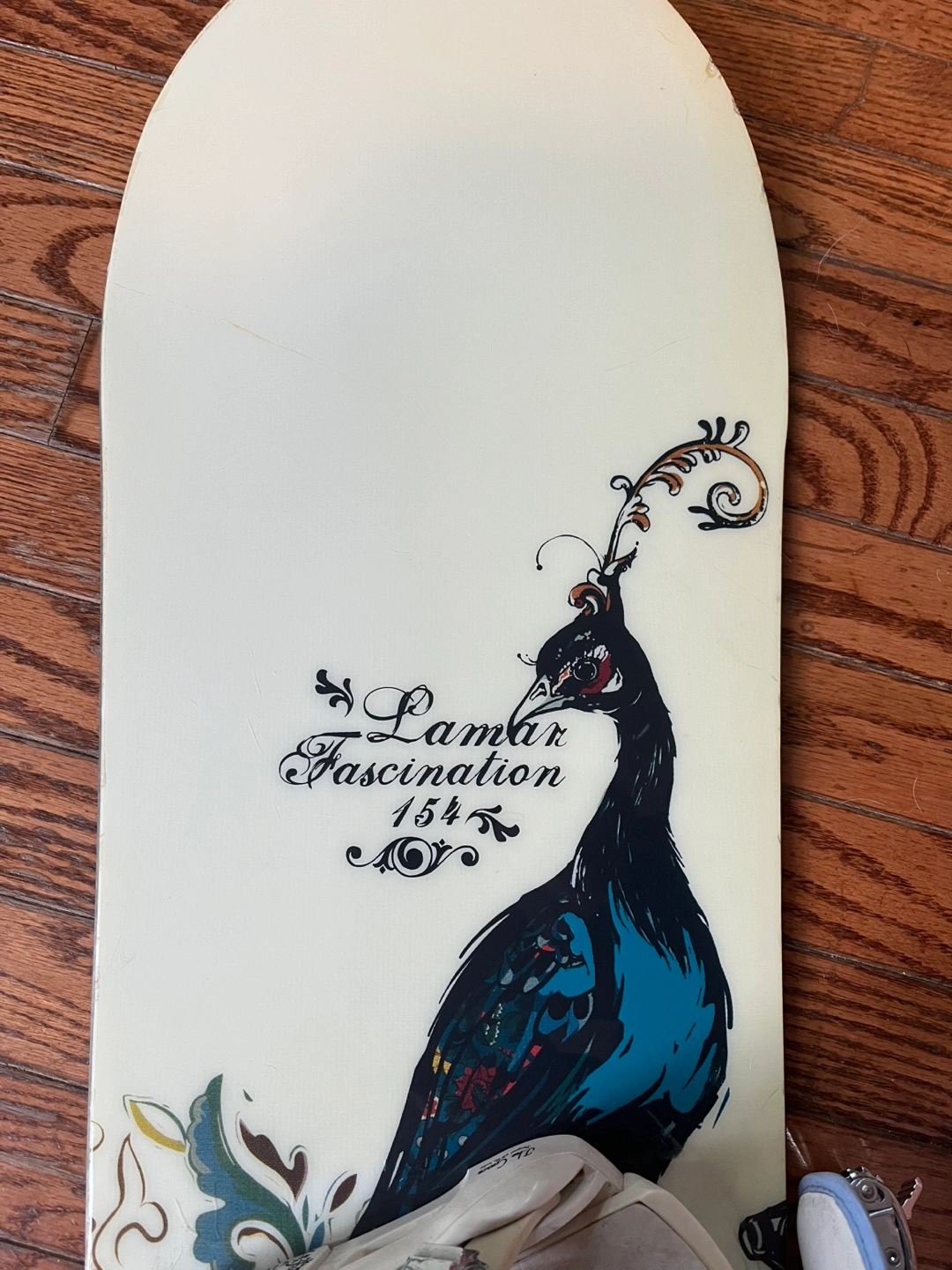 Selling a Lamar Fascination snowboard, size 154. It has a beautiful floral and peacock design. Great for hitting the slopes!