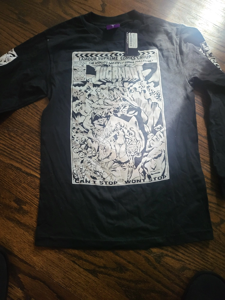 Black long sleeve t-shirt. Features a comic book design on the front. Graphic continues down the sleeves. A nice shirt to wear during your downtime, or at home after a long day.