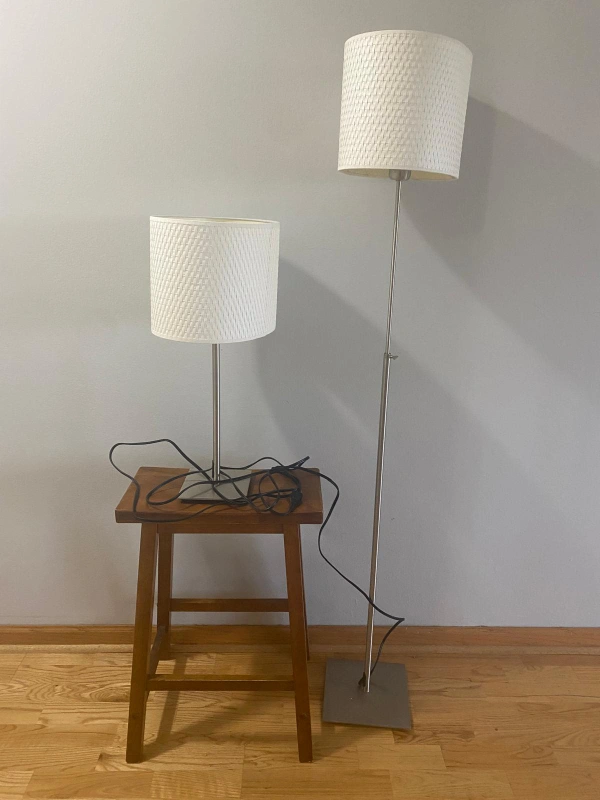Selling a set of lamps, including a table lamp and a floor lamp. Both have a white textured shade and a silver-colored base. They're in great condition and would look great in any room!