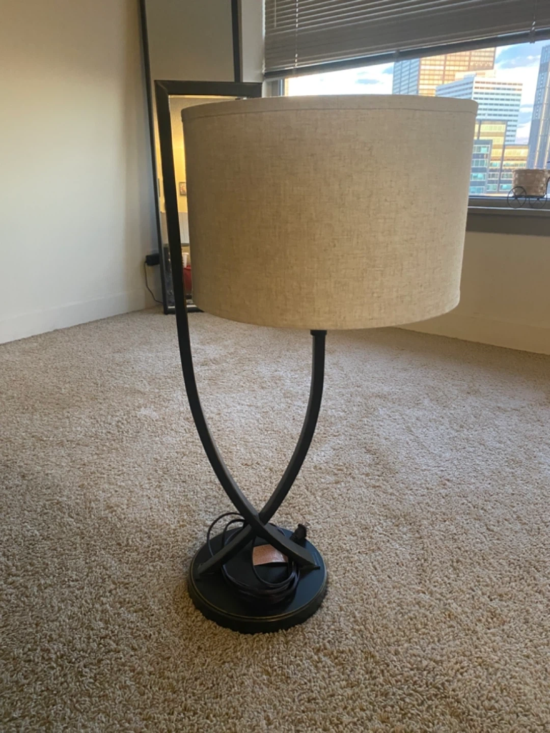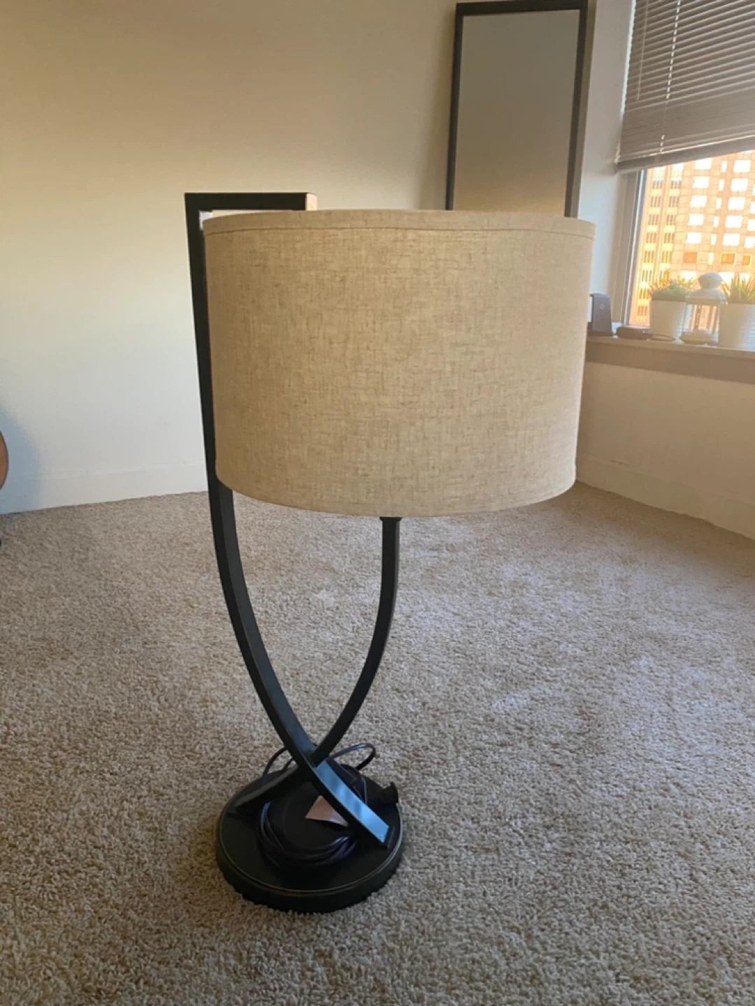 60Selling a lamp that would look great in any room! It has a sturdy black base and a neutral beige shade. It's in great condition and ready to brighten up your space