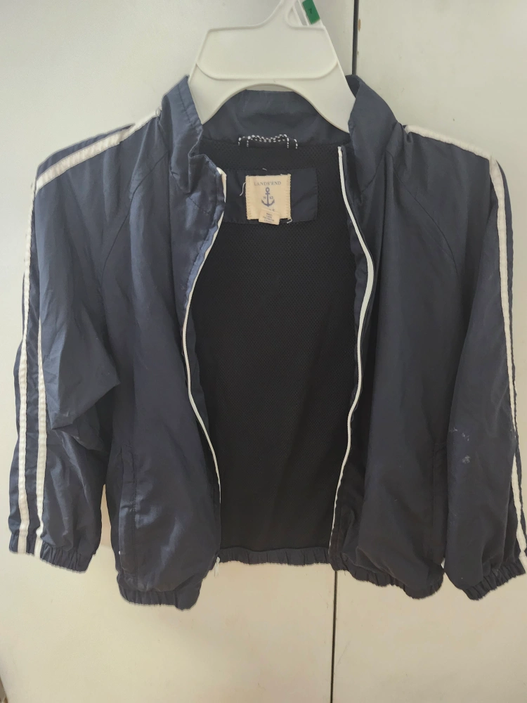 Lands' End navy blue jacket with white stripes on the sleeves. It's a size M.(5-6)