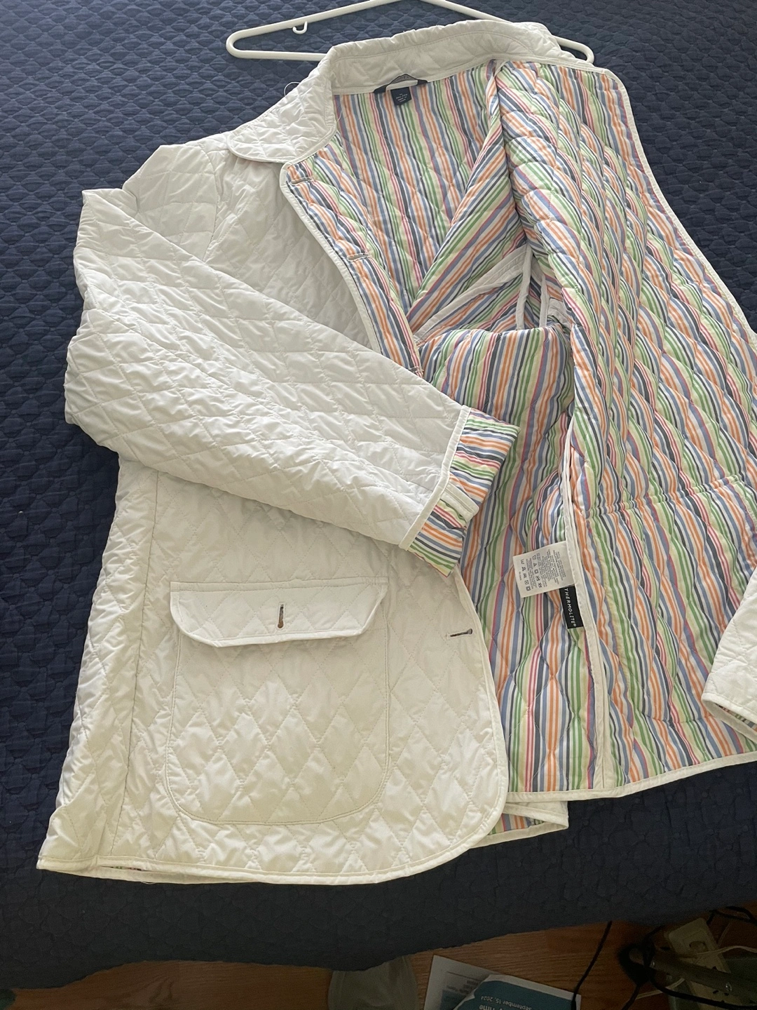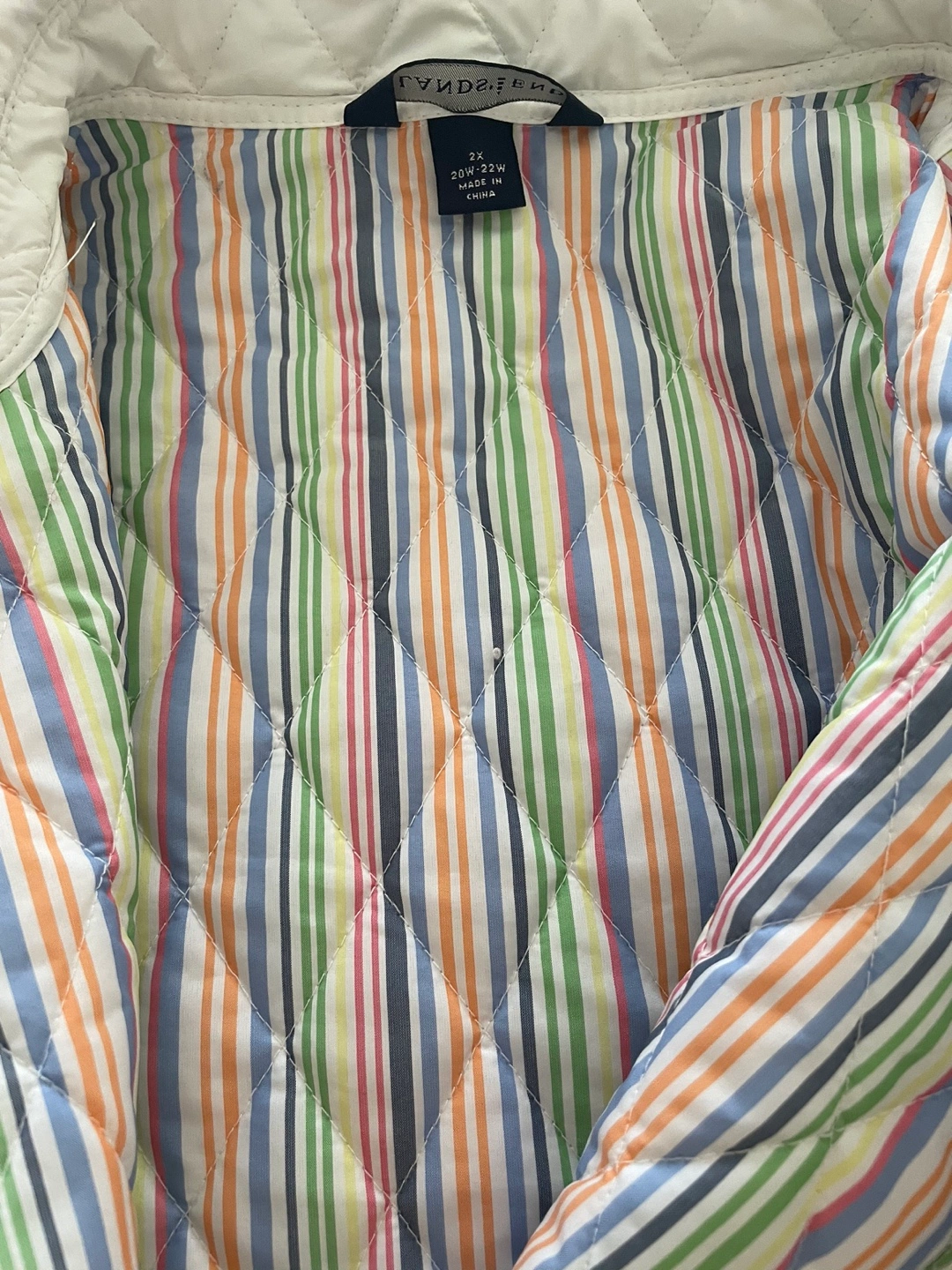 25White quilted jacket with a colorful striped lining. Size 2X. Great for spring & fall Washable!