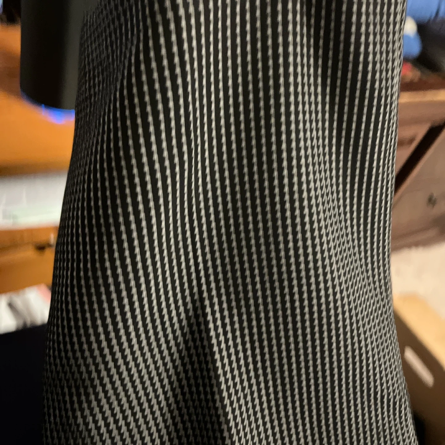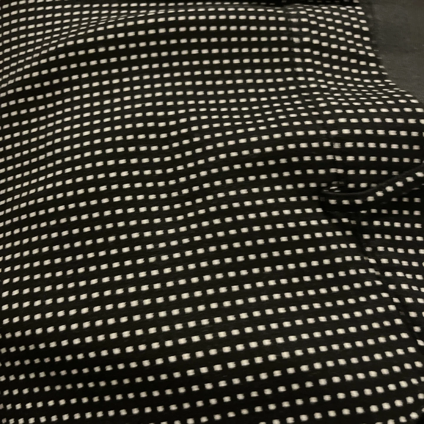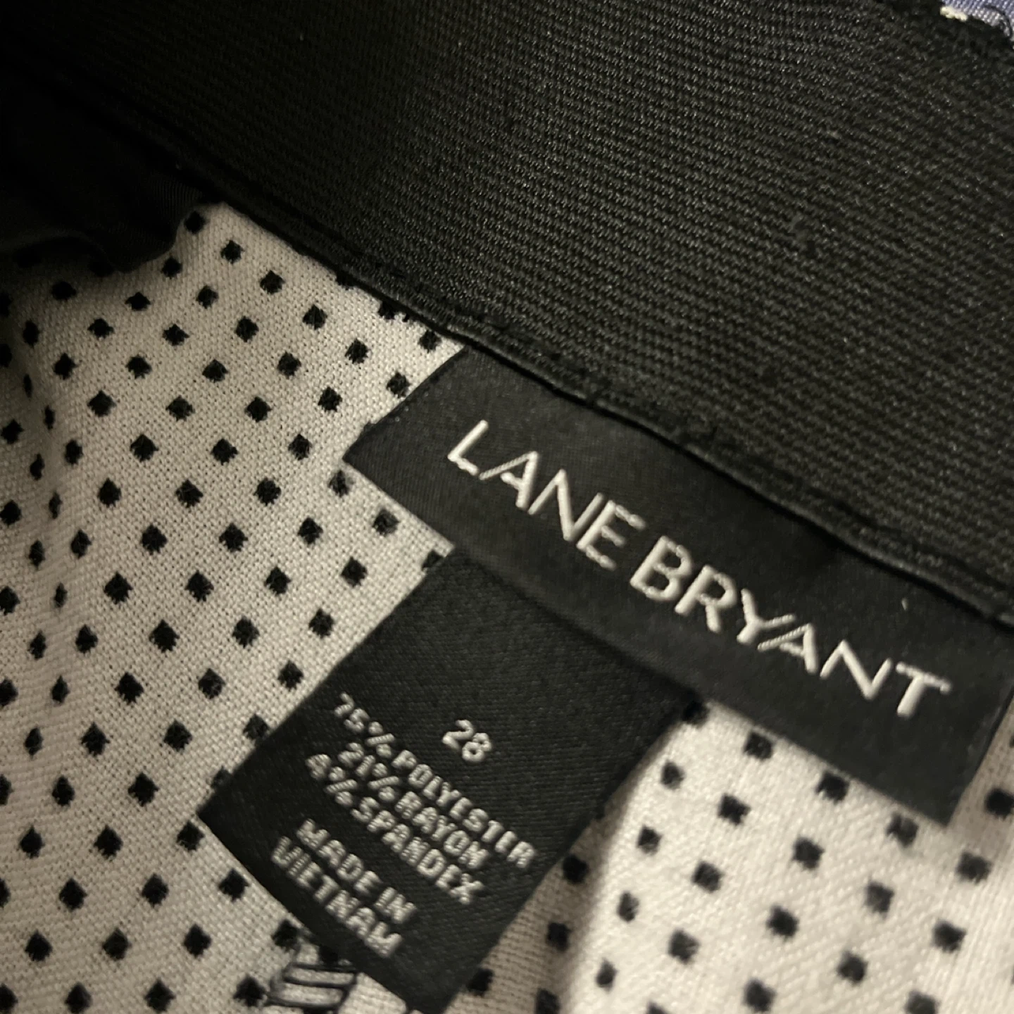 Here are some Lane Bryant pants in a size 28! They feature a black and white pattern. The material is 75% polyester, 21% rayon, and 4% spandex