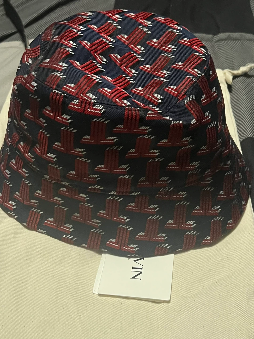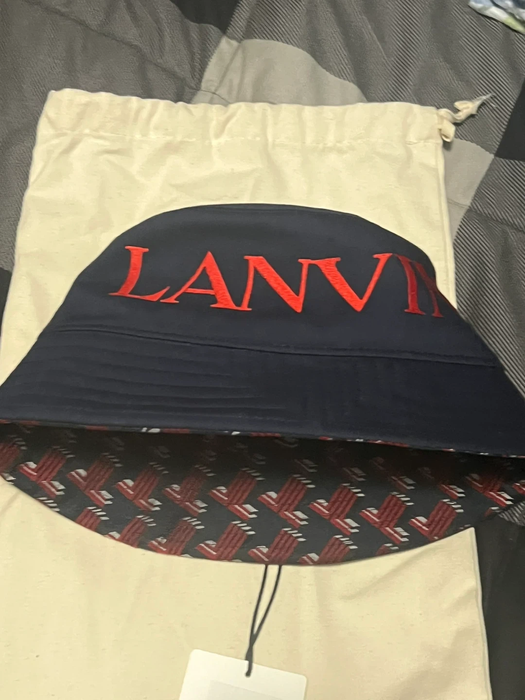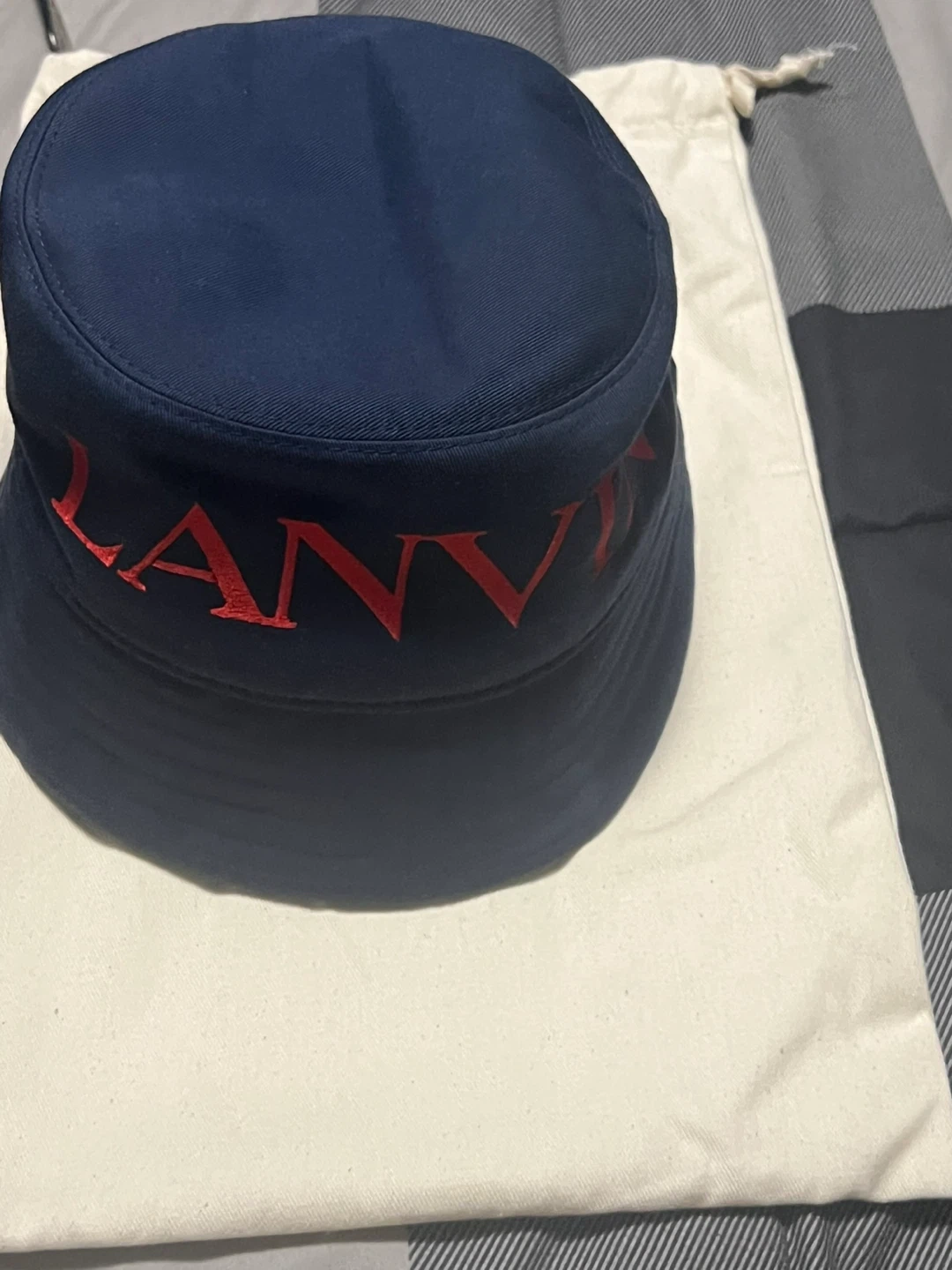 10Lanvin Paris bucket hat, size 60. The hat is navy with red lettering and a unique pattern on the inside. It's in great condition and comes with a dust bag