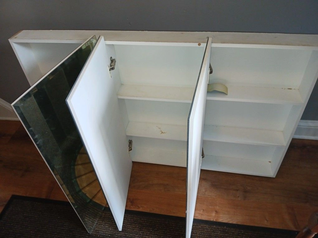 15This is a used 3 section medicine cabinet with mirror. Fair to good condition. White laminate cabinet. Perfect for organizing and storage. Color: White Mounting: Wall mounted Type: Medicine cabinet