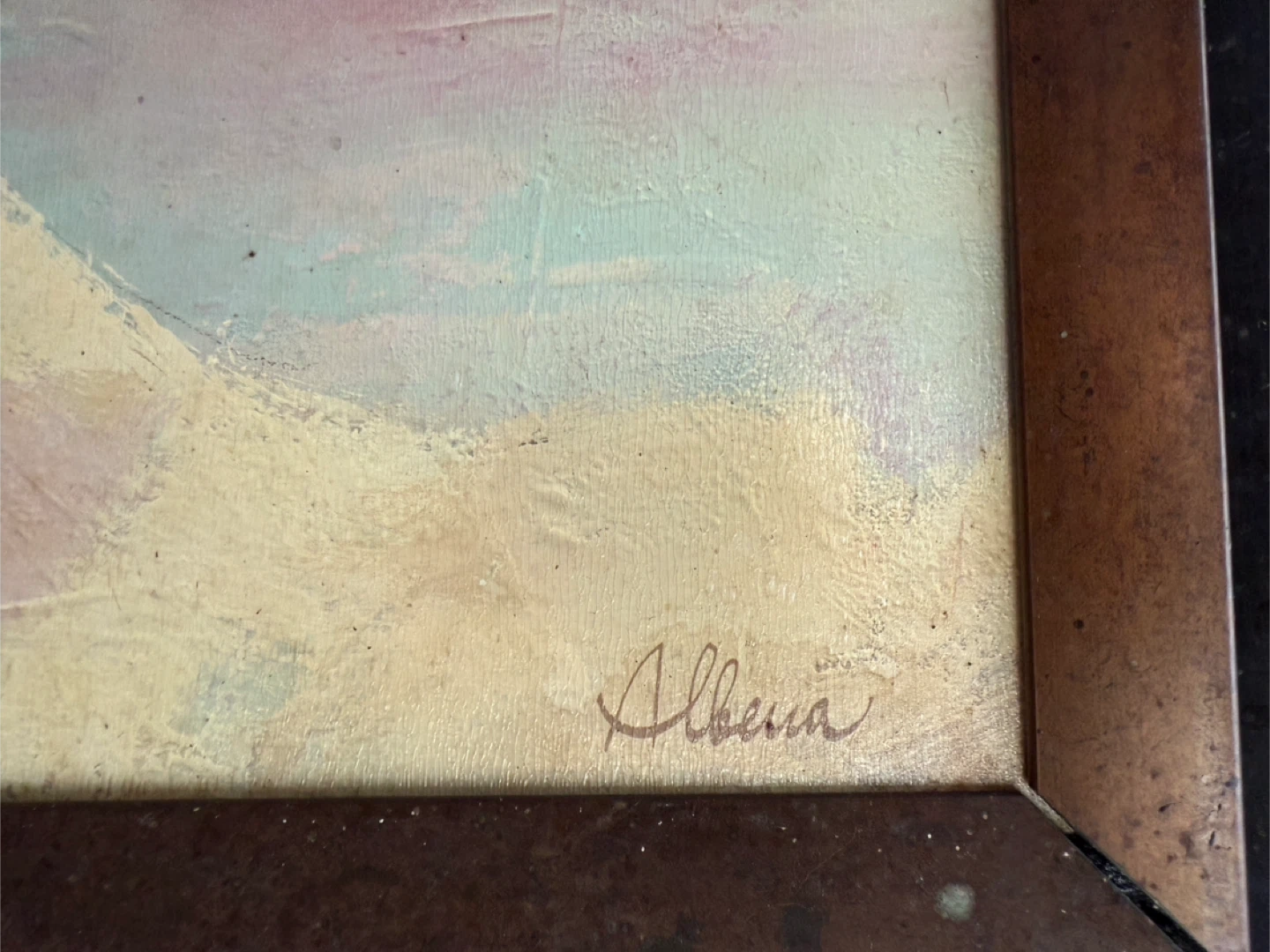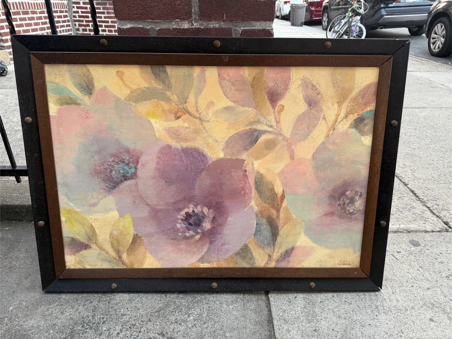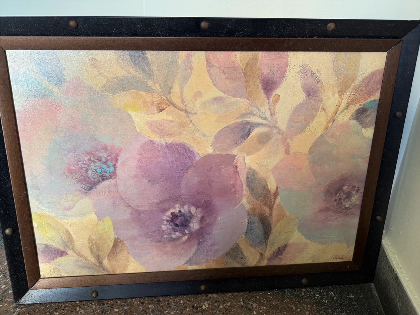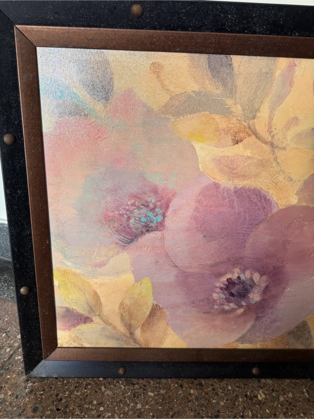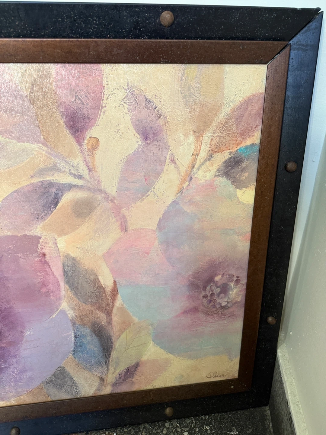 Beautiful floral painting signed by 'Albena'! It's framed with a dark brown and black frame. The painting features lovely purple and gold hues. It would look great in any room! Framed «ELICO LTD» by «NINE PENS»