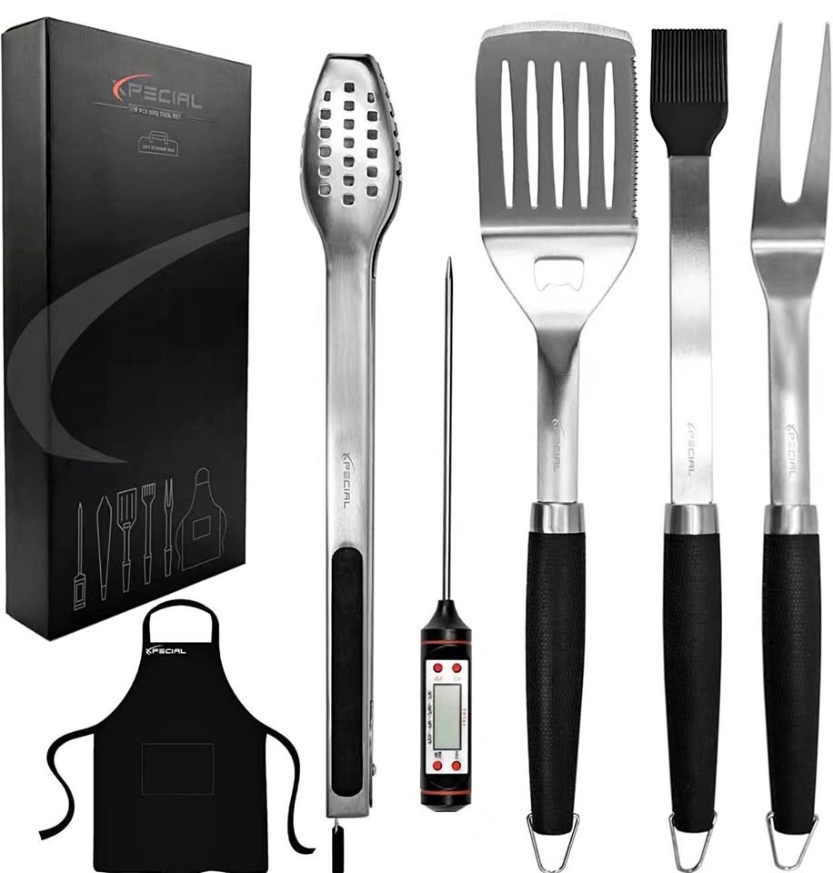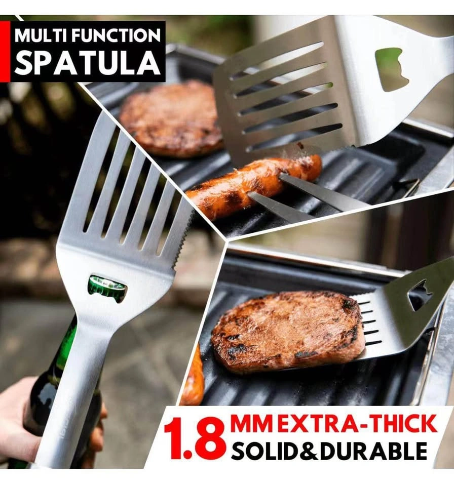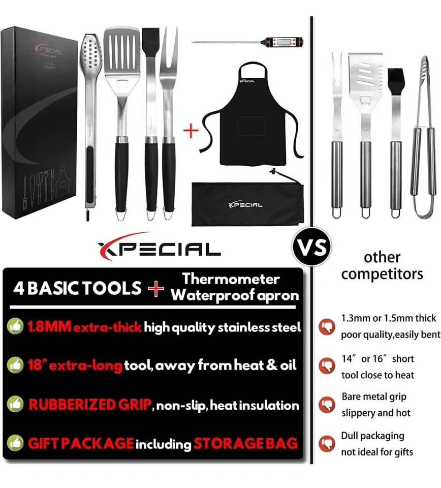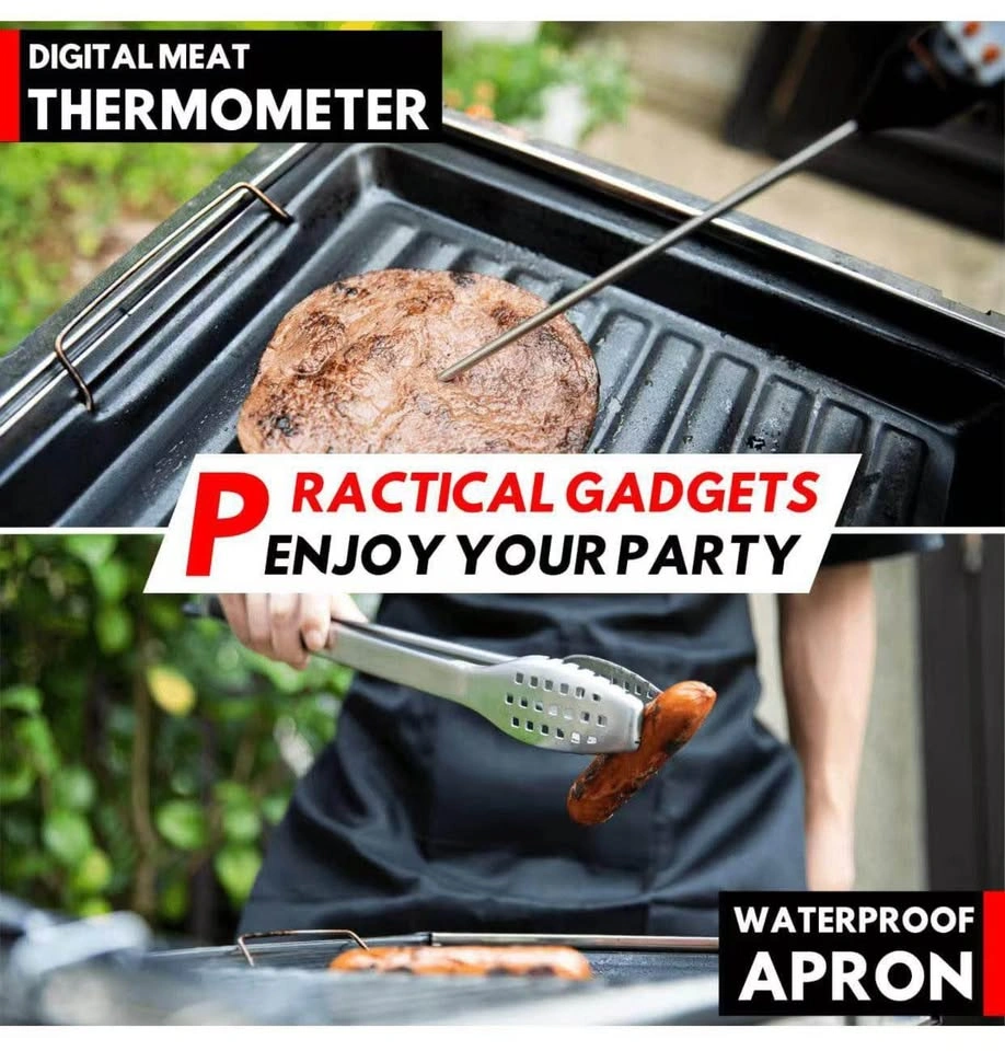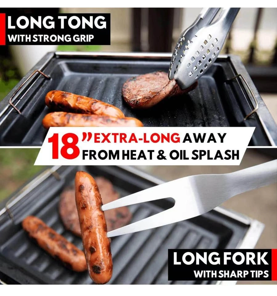 40Large BBQ Tool Set - Longer & Thicker Heavy Duty Grill Tools, 18inch Stainless Steel Grilling Utensils Accessories with Rubberized Grips Spatula, Fork, Basting Brush, Tong, Thermometer, Apron
