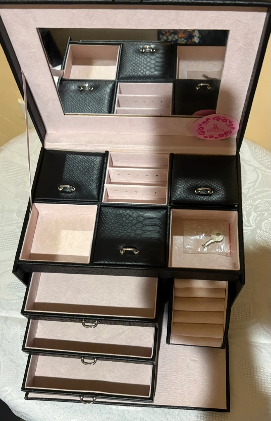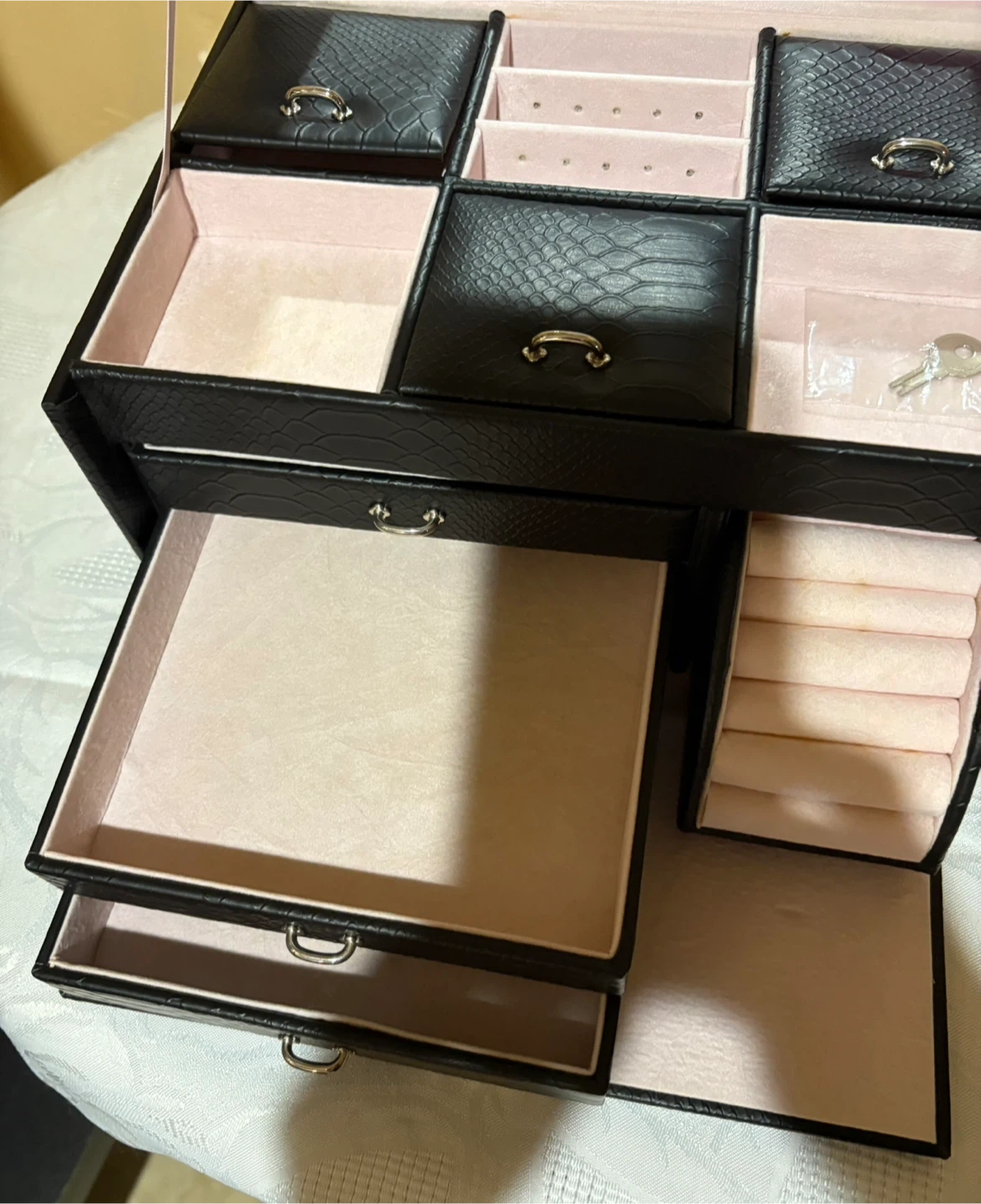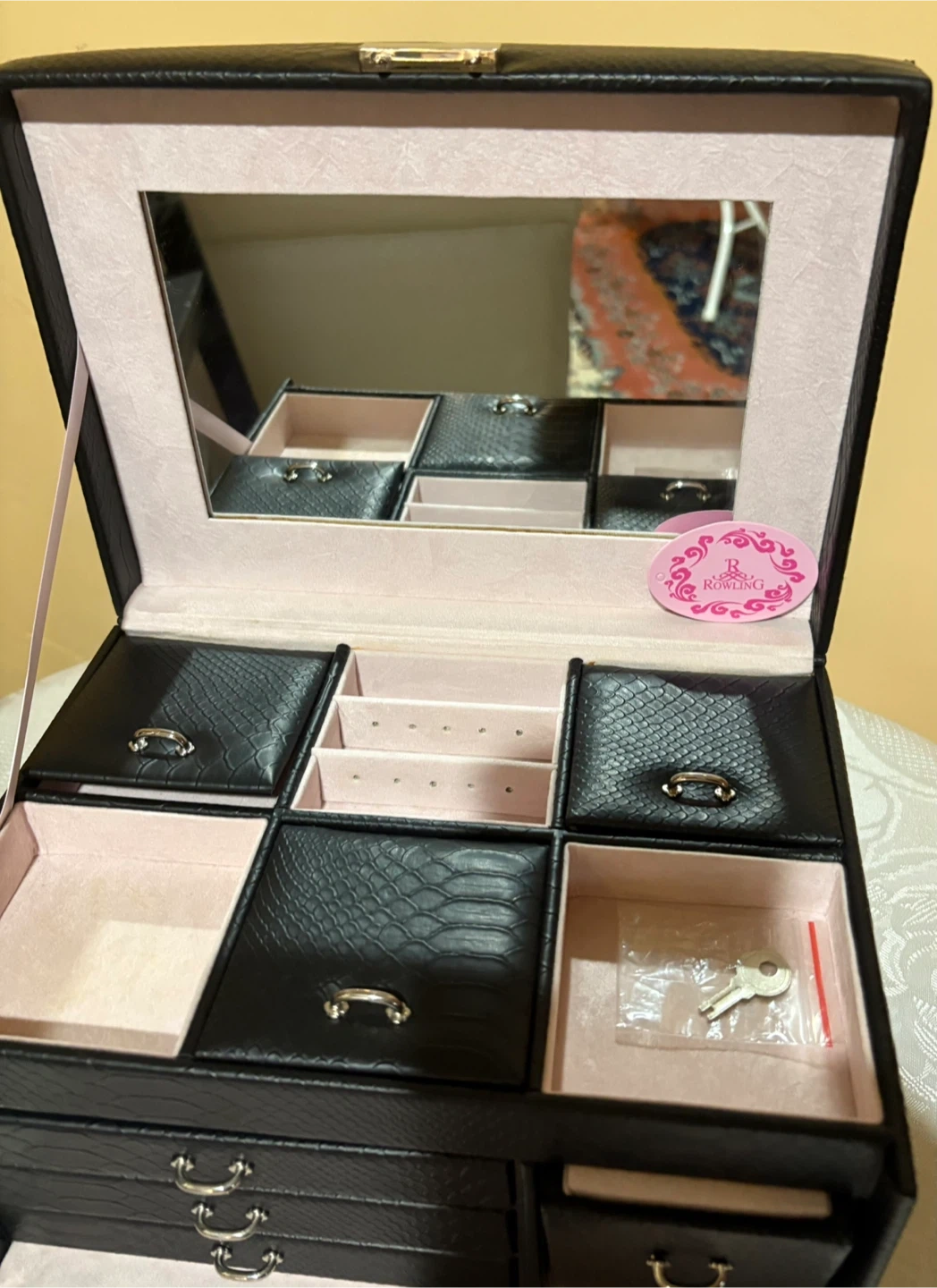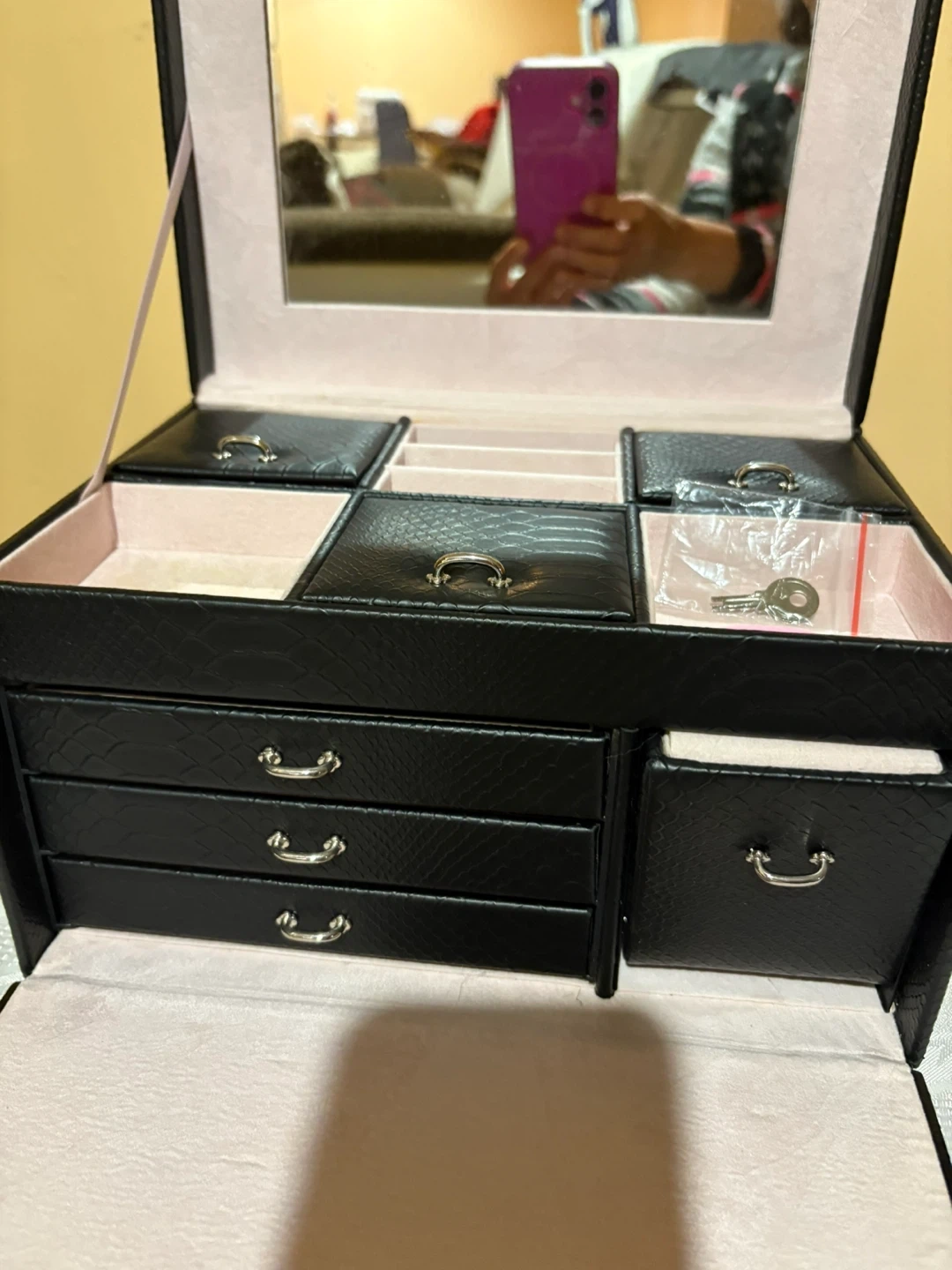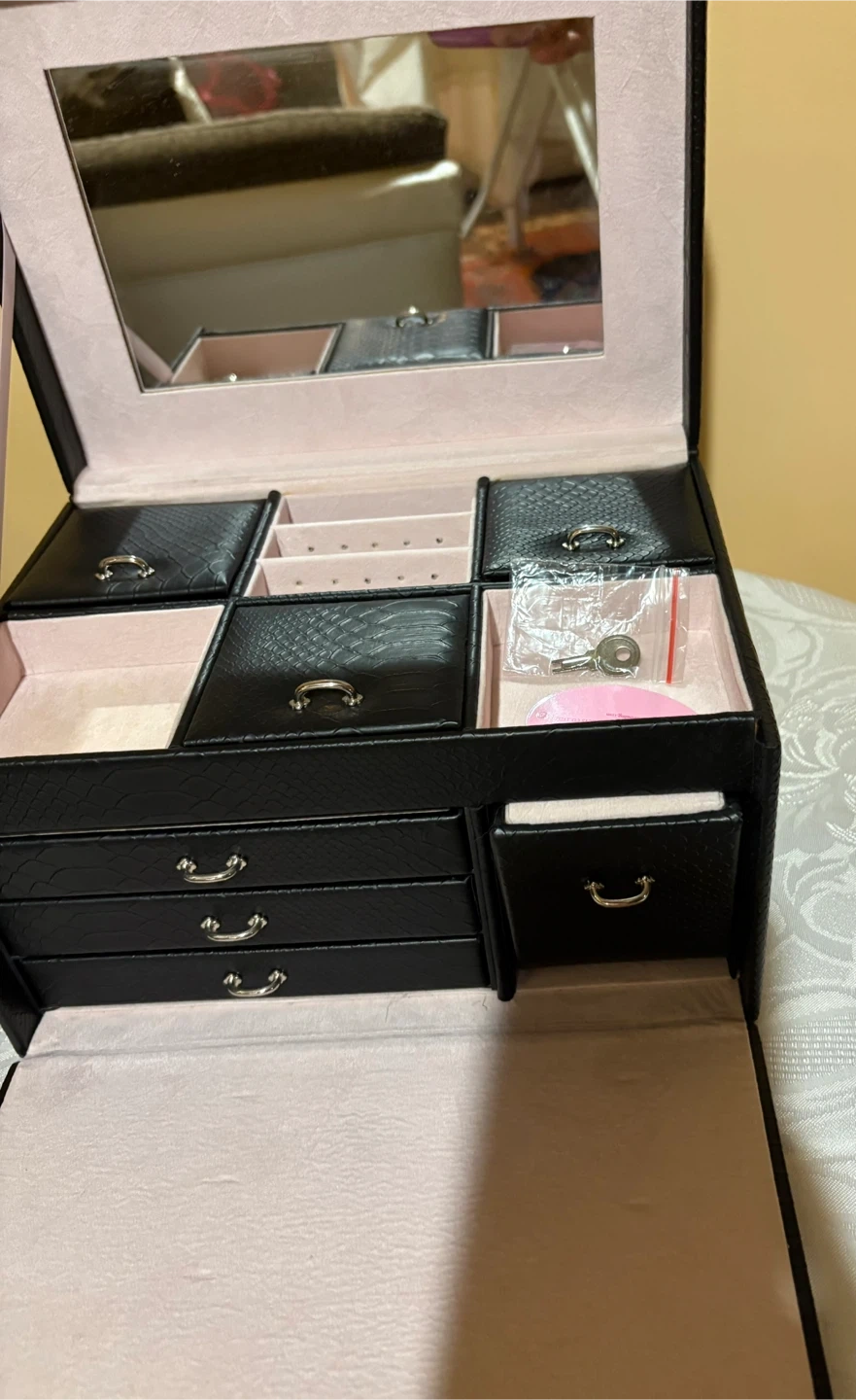 15Here's a large jewelry box in great condition! It's black with a snakeskin-like texture on the top compartments and drawers. The inside is lined with a soft, light pink fabric. It also has a mirror and comes with a key to lock the top compartment H:7” W:6 L:8”