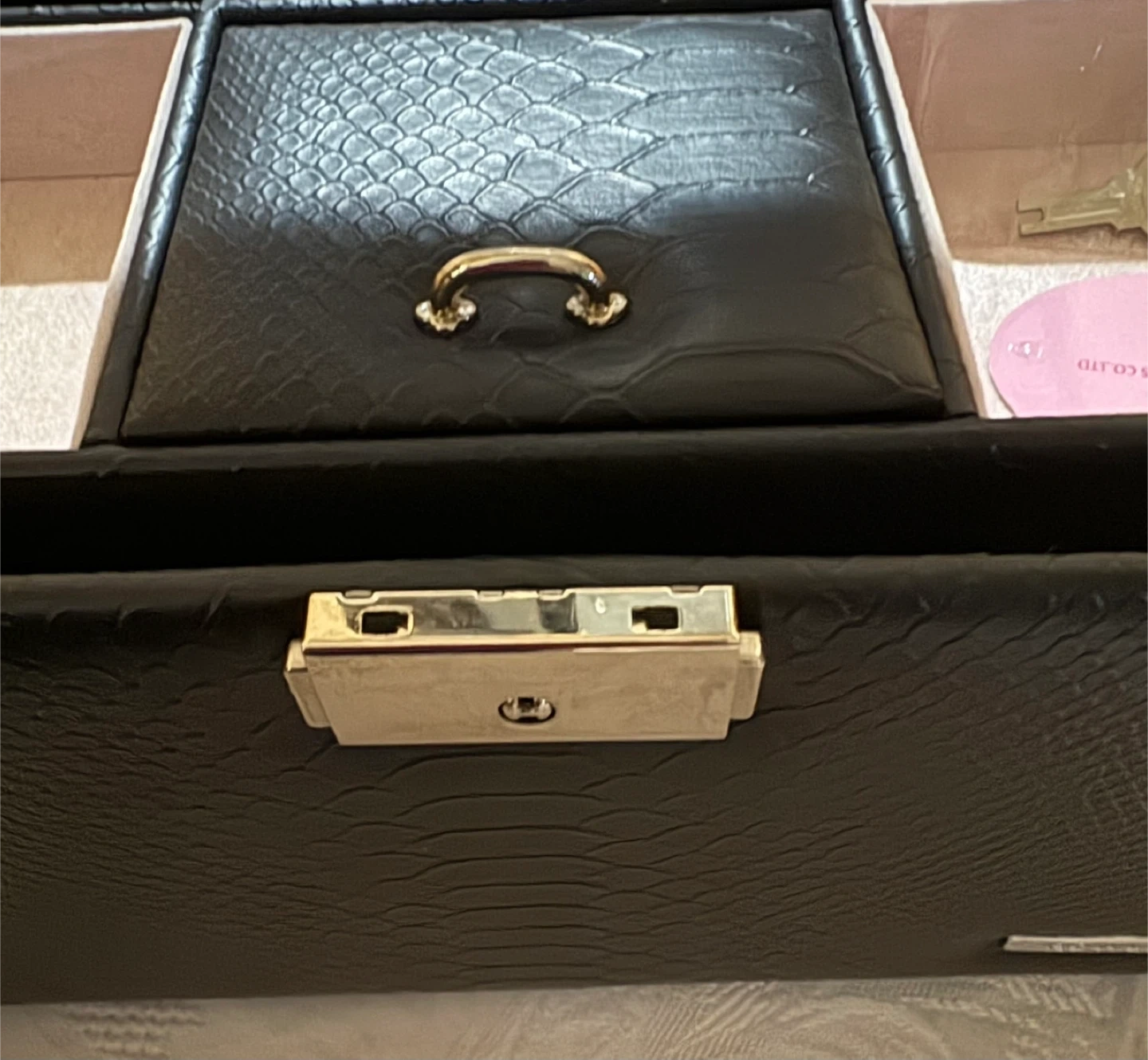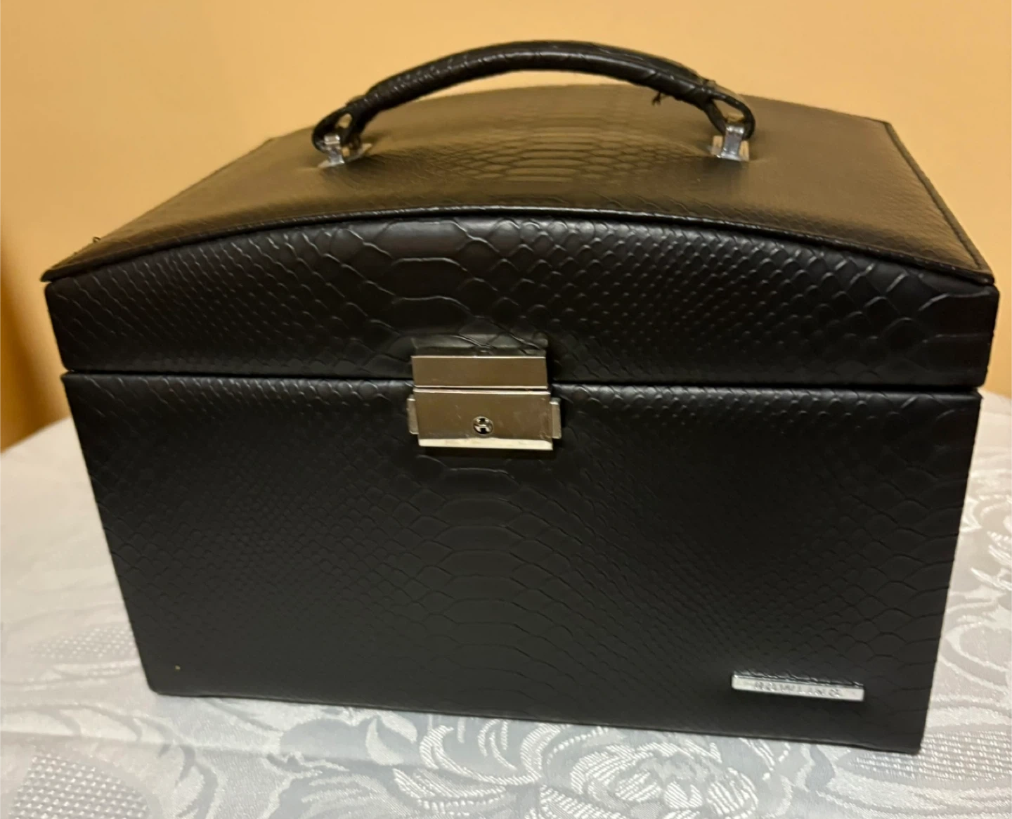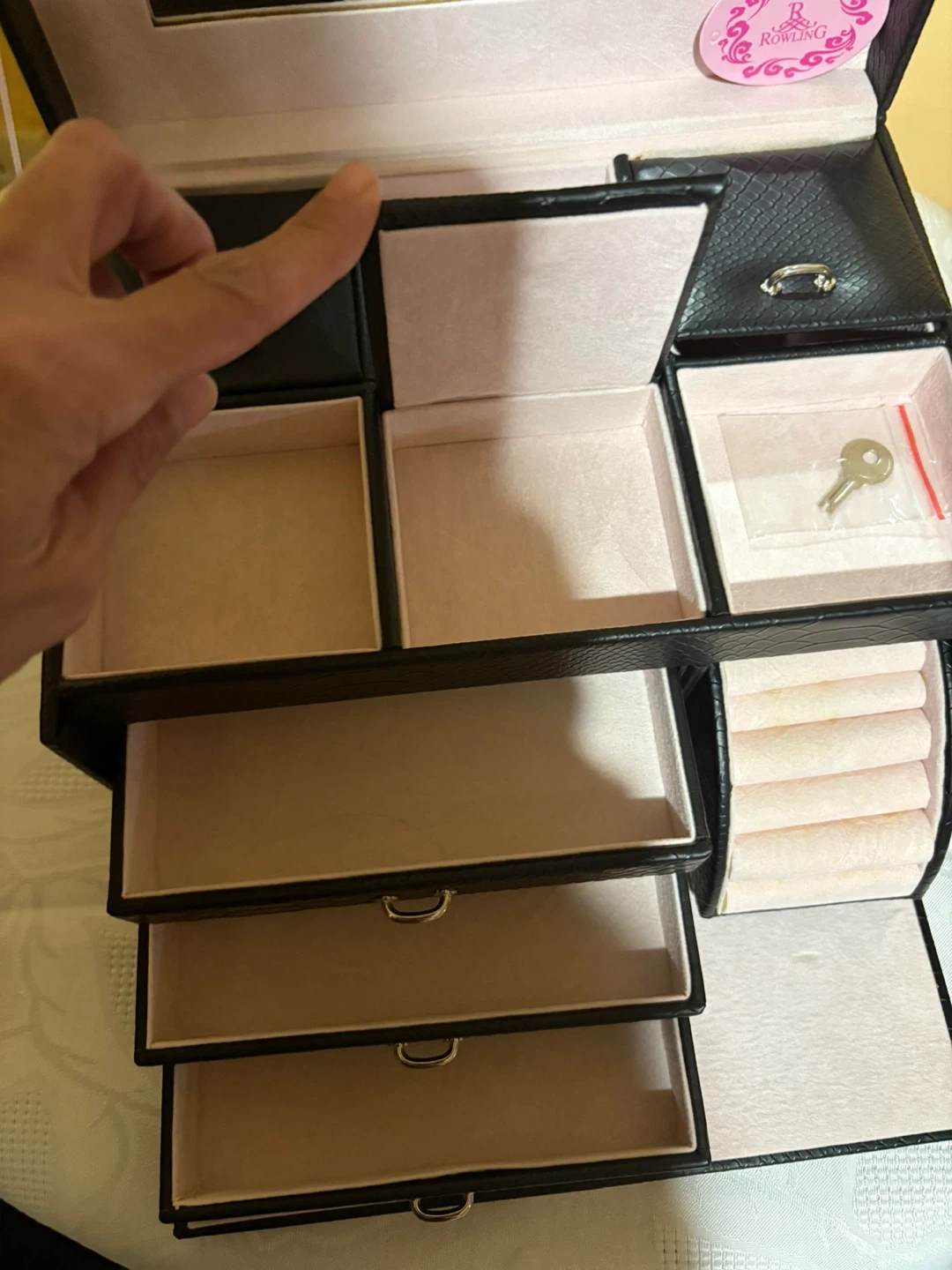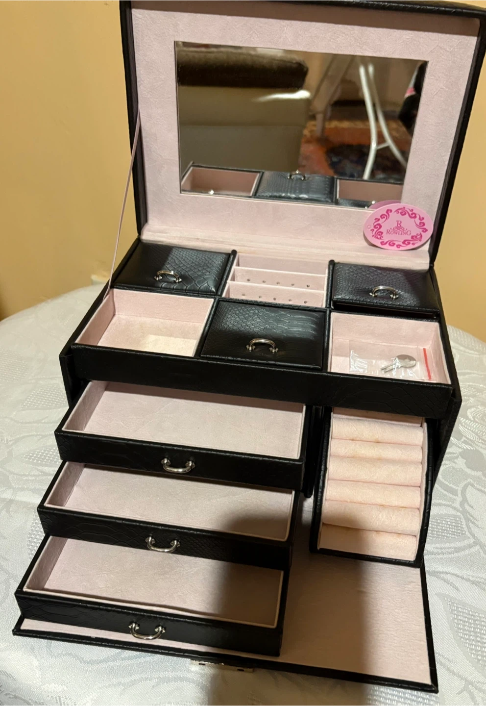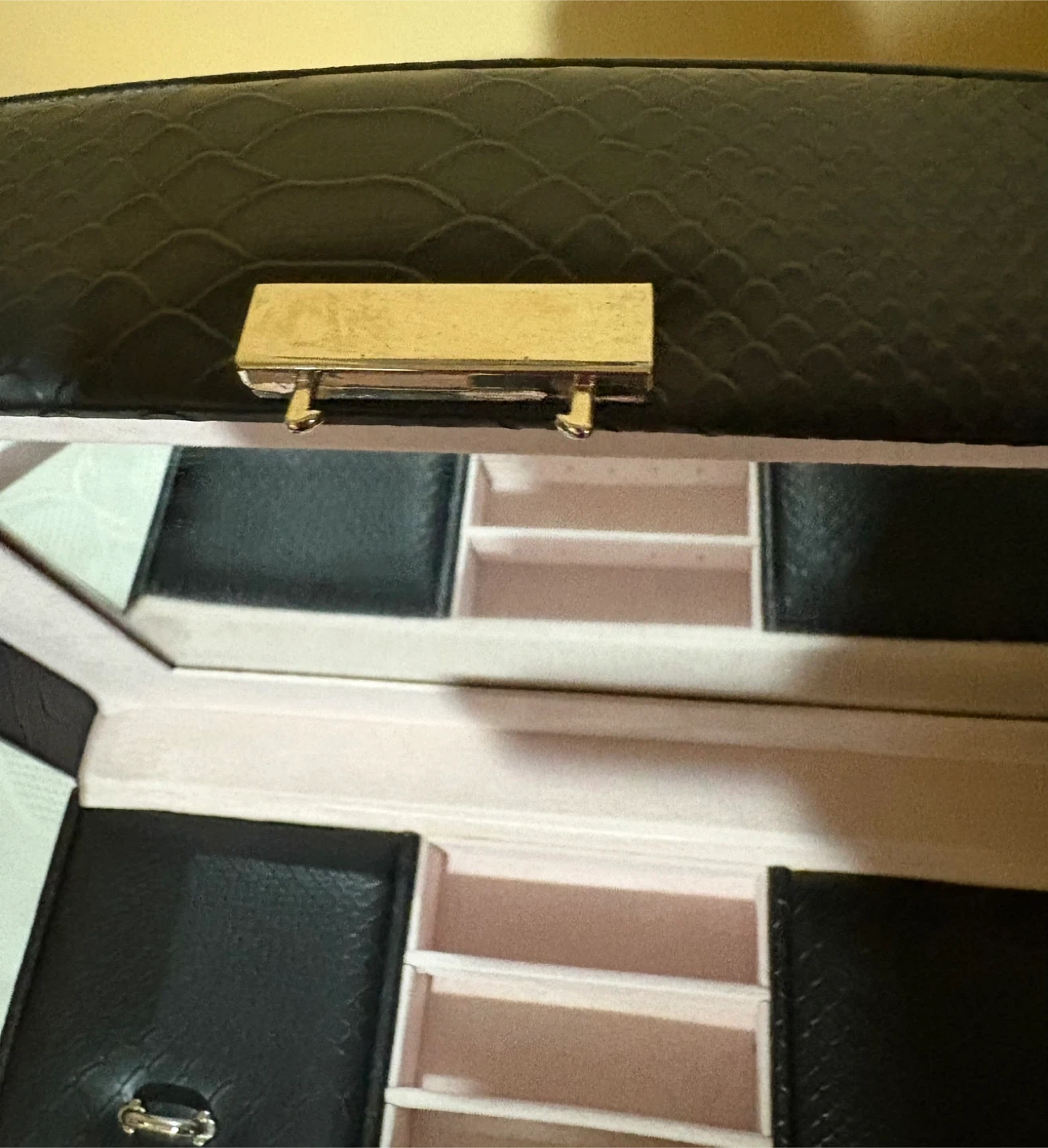 15Here's a large jewelry box in great condition! It's black with a snakeskin-like texture on the top compartments and drawers. The inside is lined with a soft, light pink fabric. It also has a mirror and comes with a key to lock the top compartment H:7” W:6 L:8”