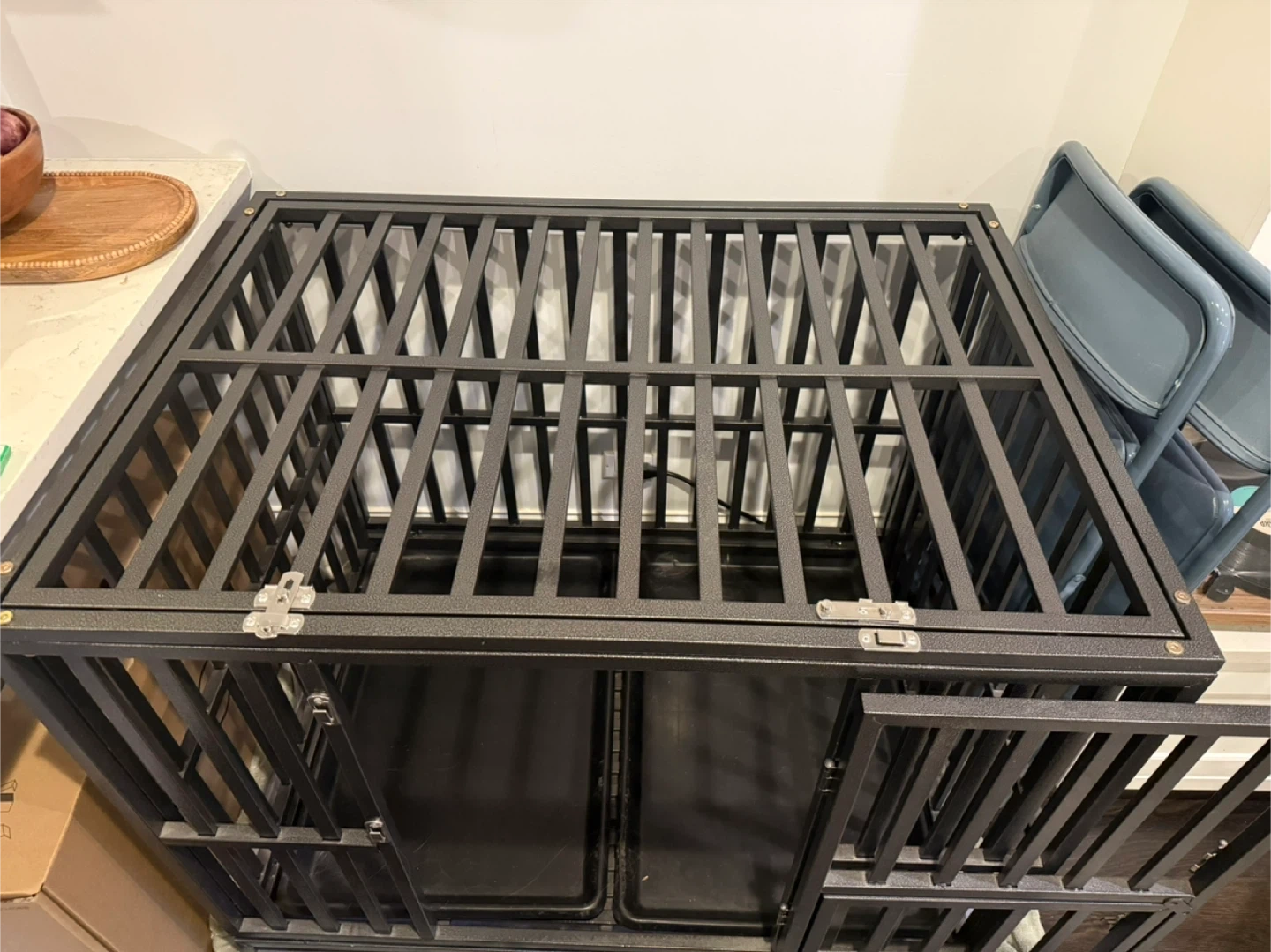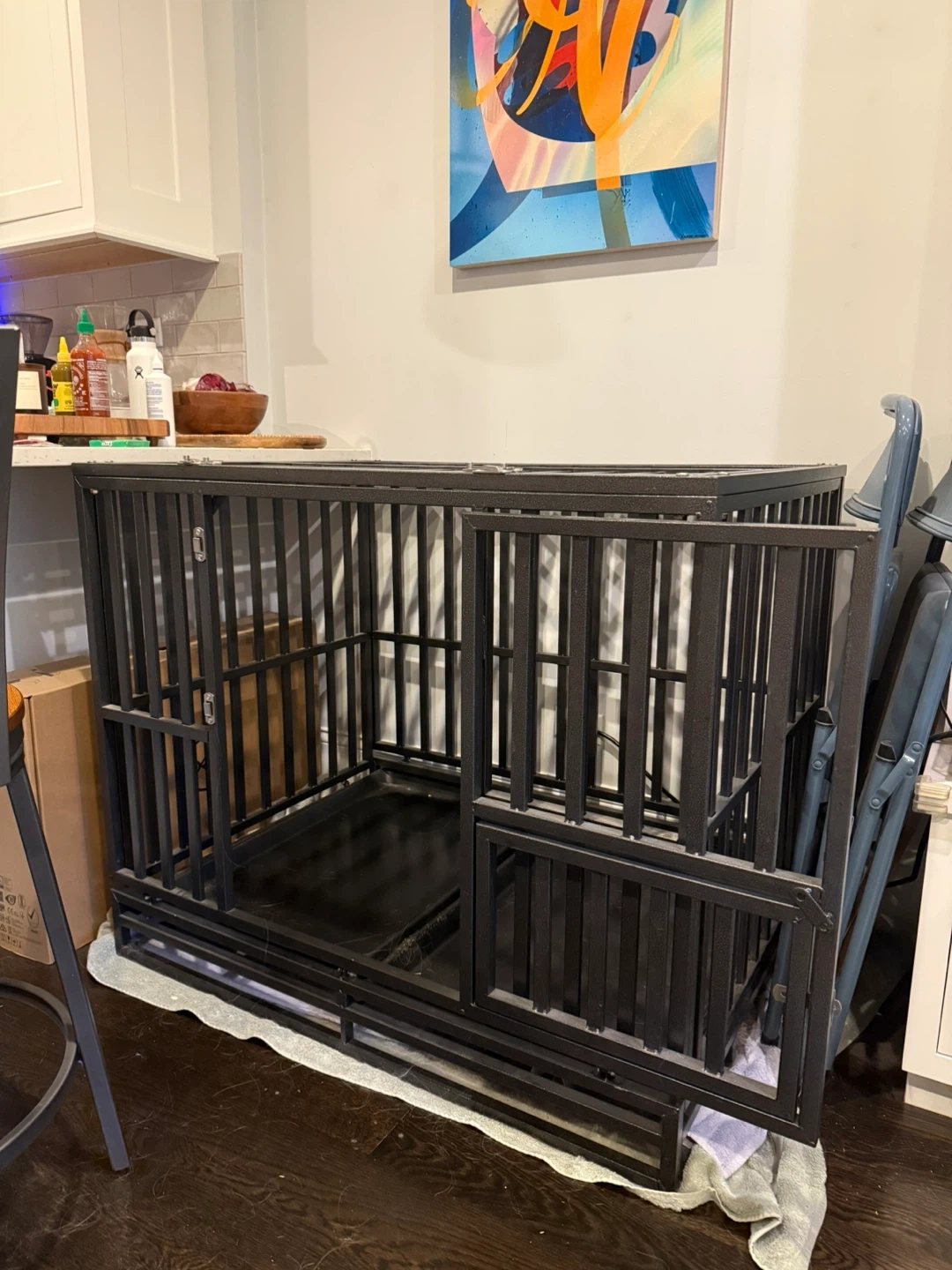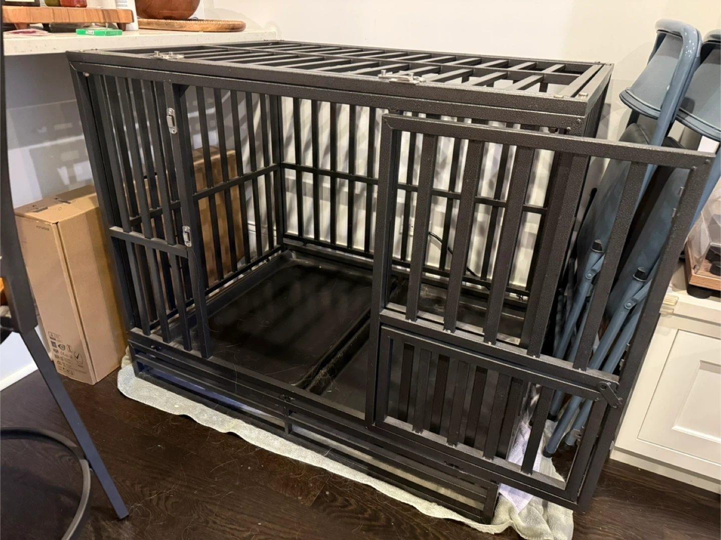 Selling a large, sturdy black metal dog crate. It's in great condition and ready for a new furry friend. Perfect for providing a safe and comfortable space for your dog indoors Currently disassembled for easier pick up. Assembly instructions included, very easy to put together. Also has optional wheels. 41.5” wide 34.75” tall 30.25” deep Chicago or northern suburbs. Open to reasonable offers.
