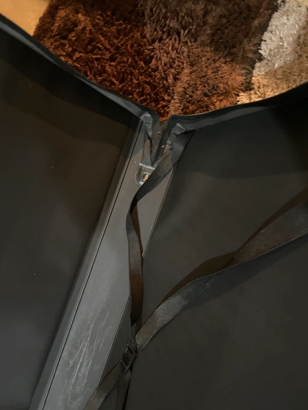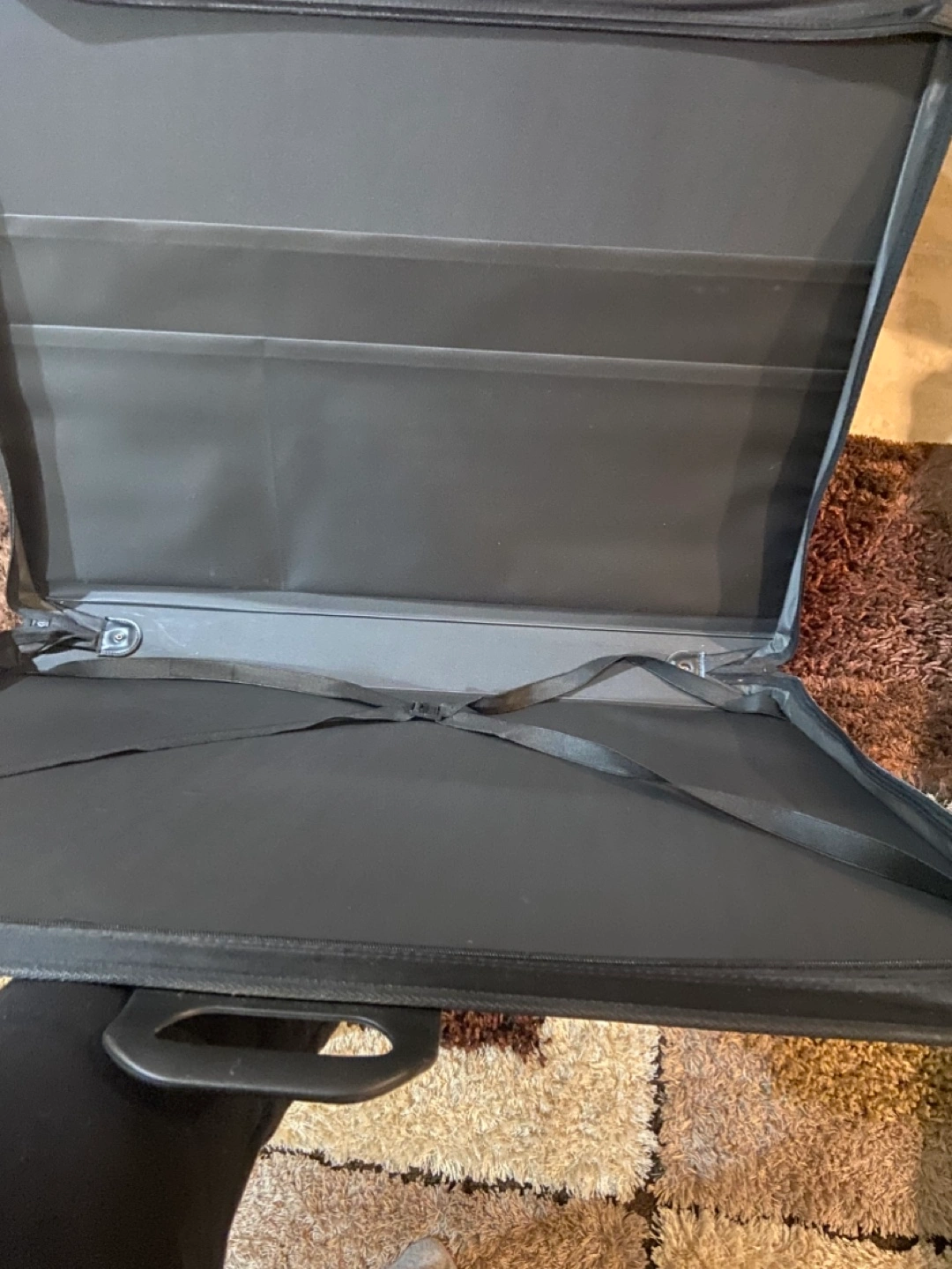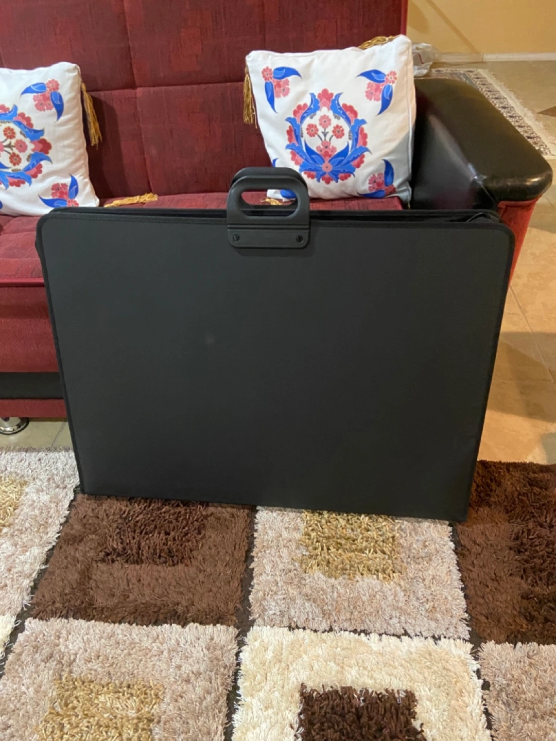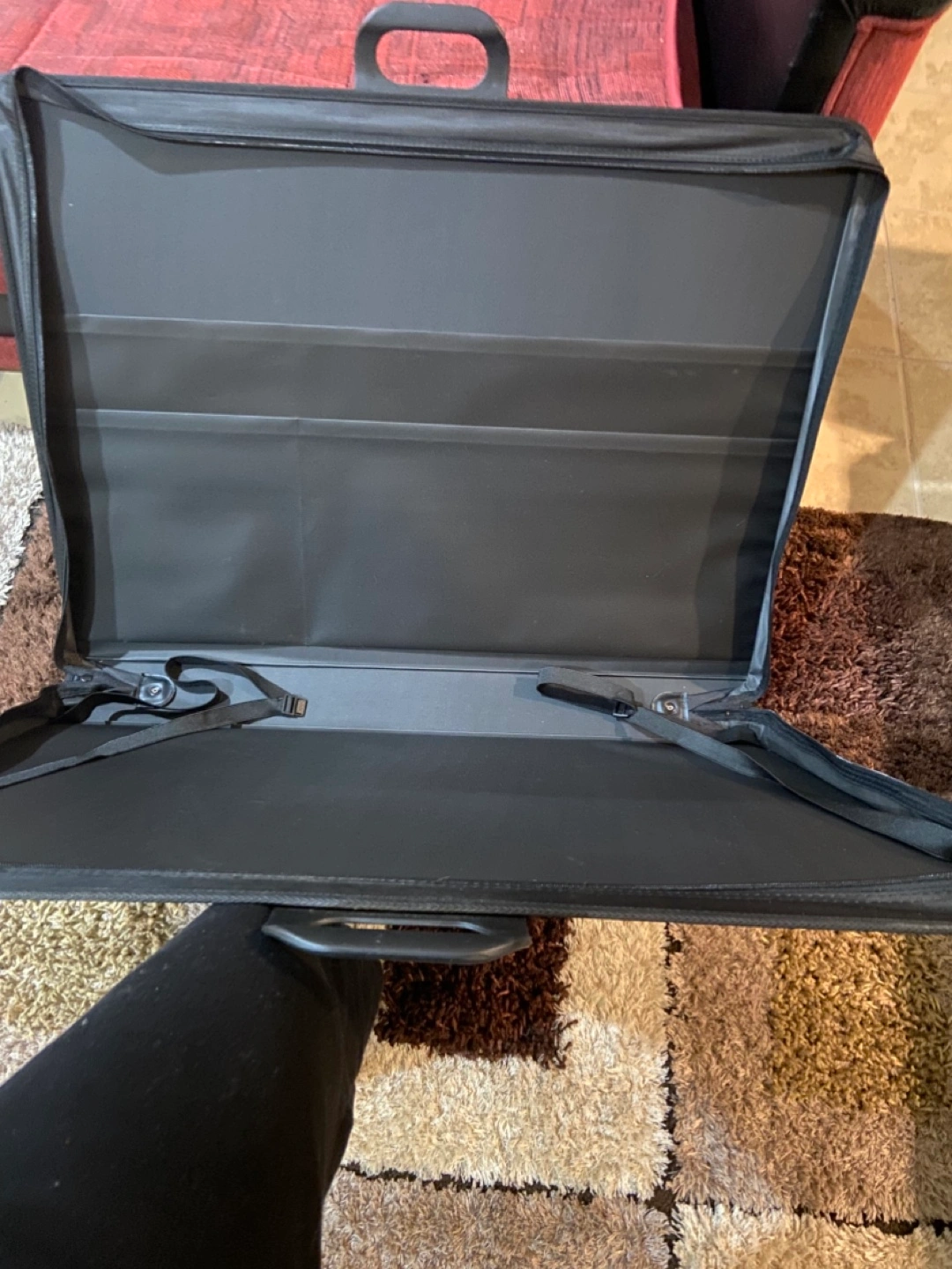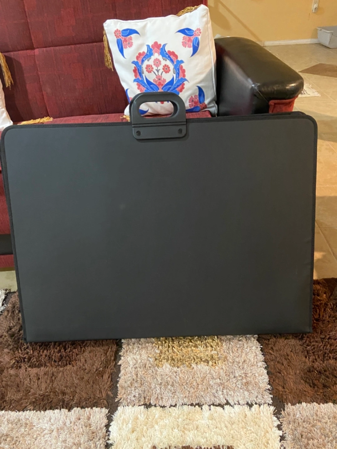 Black portfolio case. Large size. Top handle and interior straps. Great for carrying artwork or documents.
