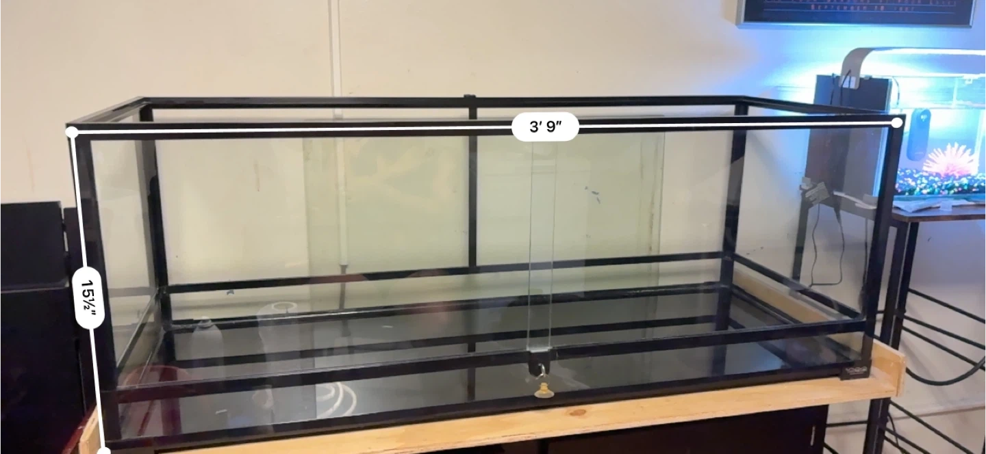 Selling a large terrarium tank with a sleek black frame. It's a great size for reptiles or other small animals. The dimensions are 3'9" in length and 15.5" in height. It's in good condition and ready for a new home!