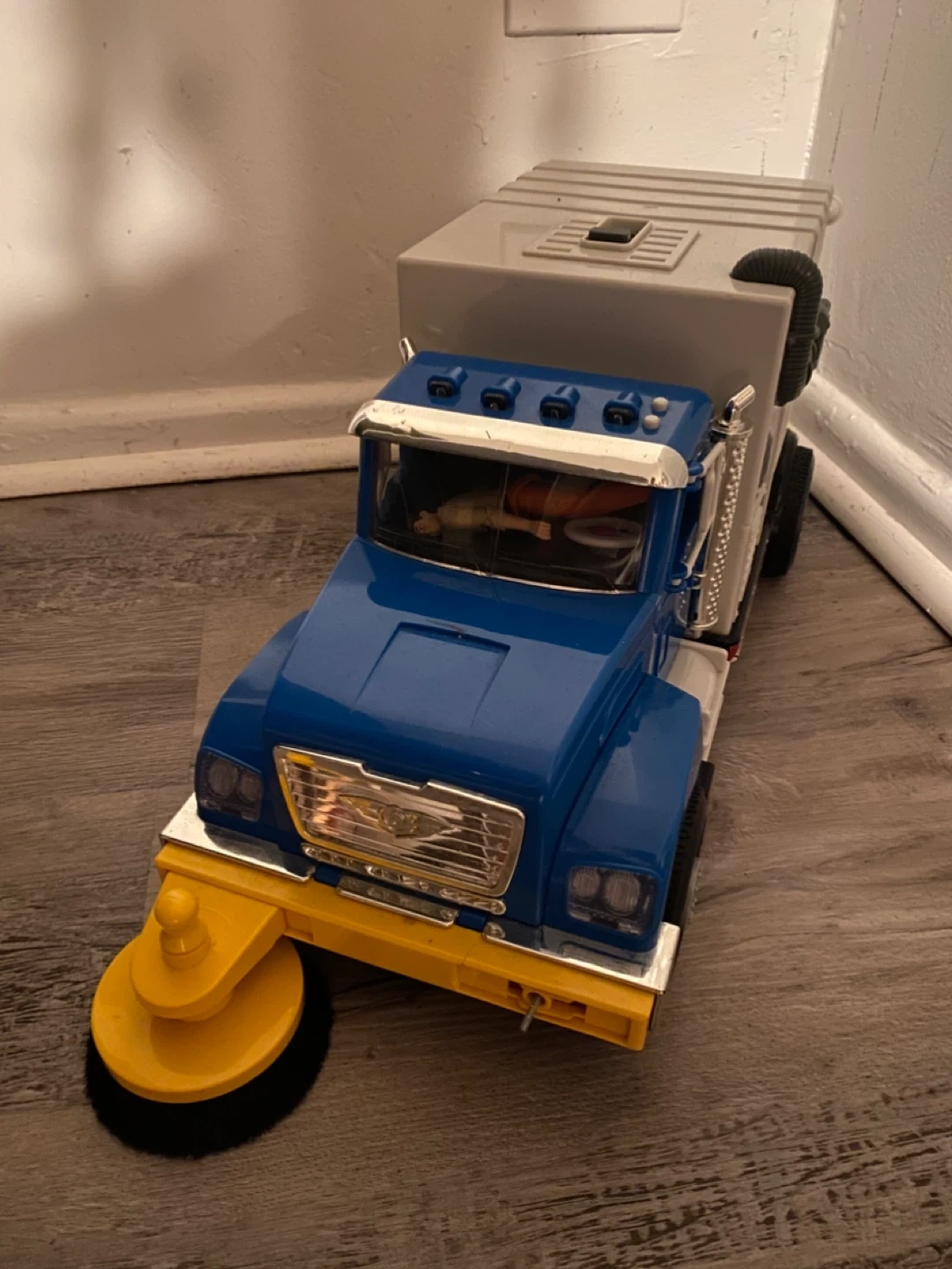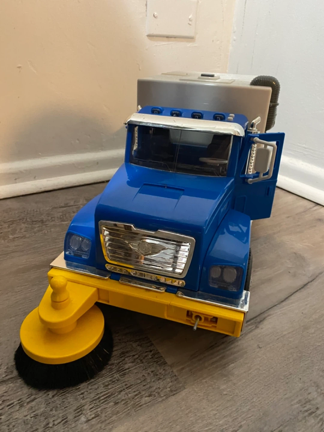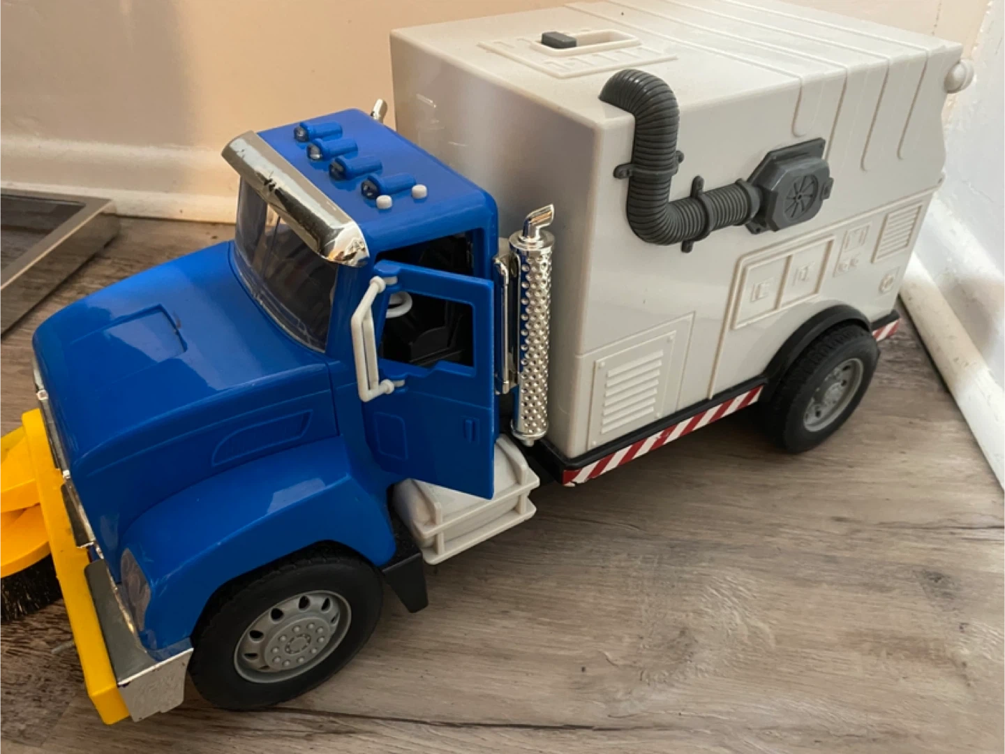 Selling a large toy street sweeper truck in blue and yellow. It looks like it's in great shape and ready for some fun!