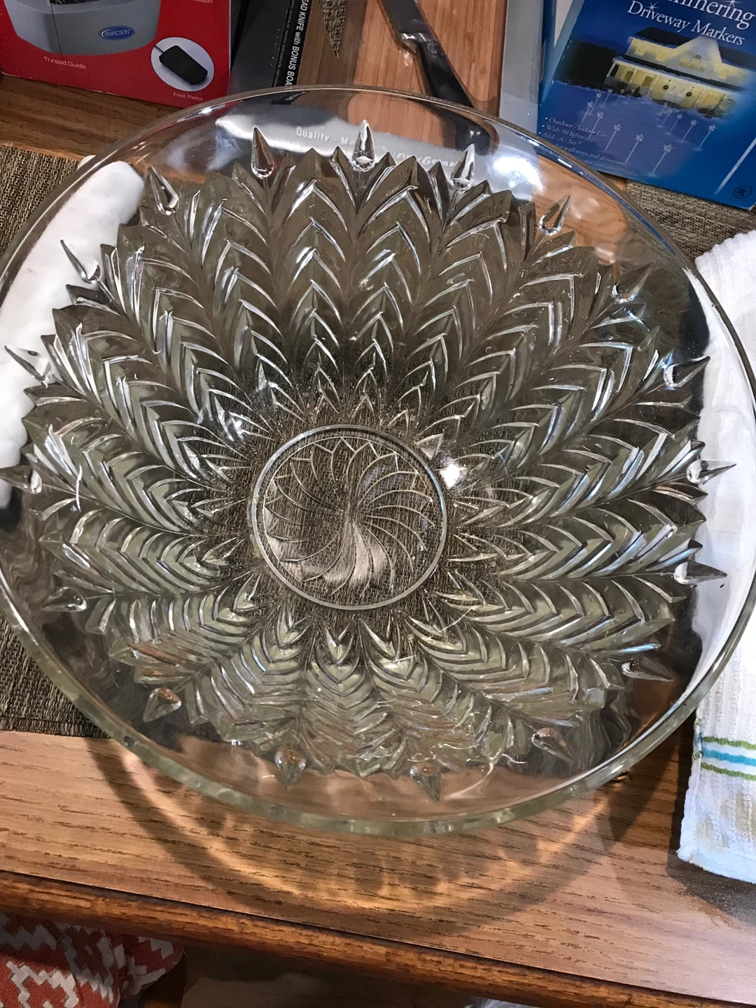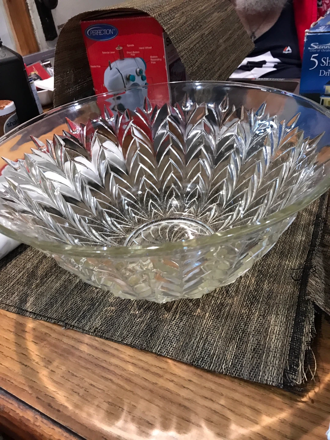 157Selling a beautiful clear glass bowl! It measures about 14 inches in diameter. It's in great condition and would be perfect for serving or as a decorative piece