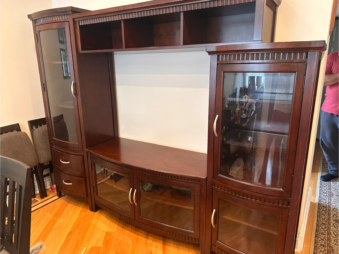 10Selling a large, dark wood entertainment center. It features glass door cabinets on either side, open shelving, and a large space for a TV. It's a beautiful piece that would look great in any living room or entertainment space