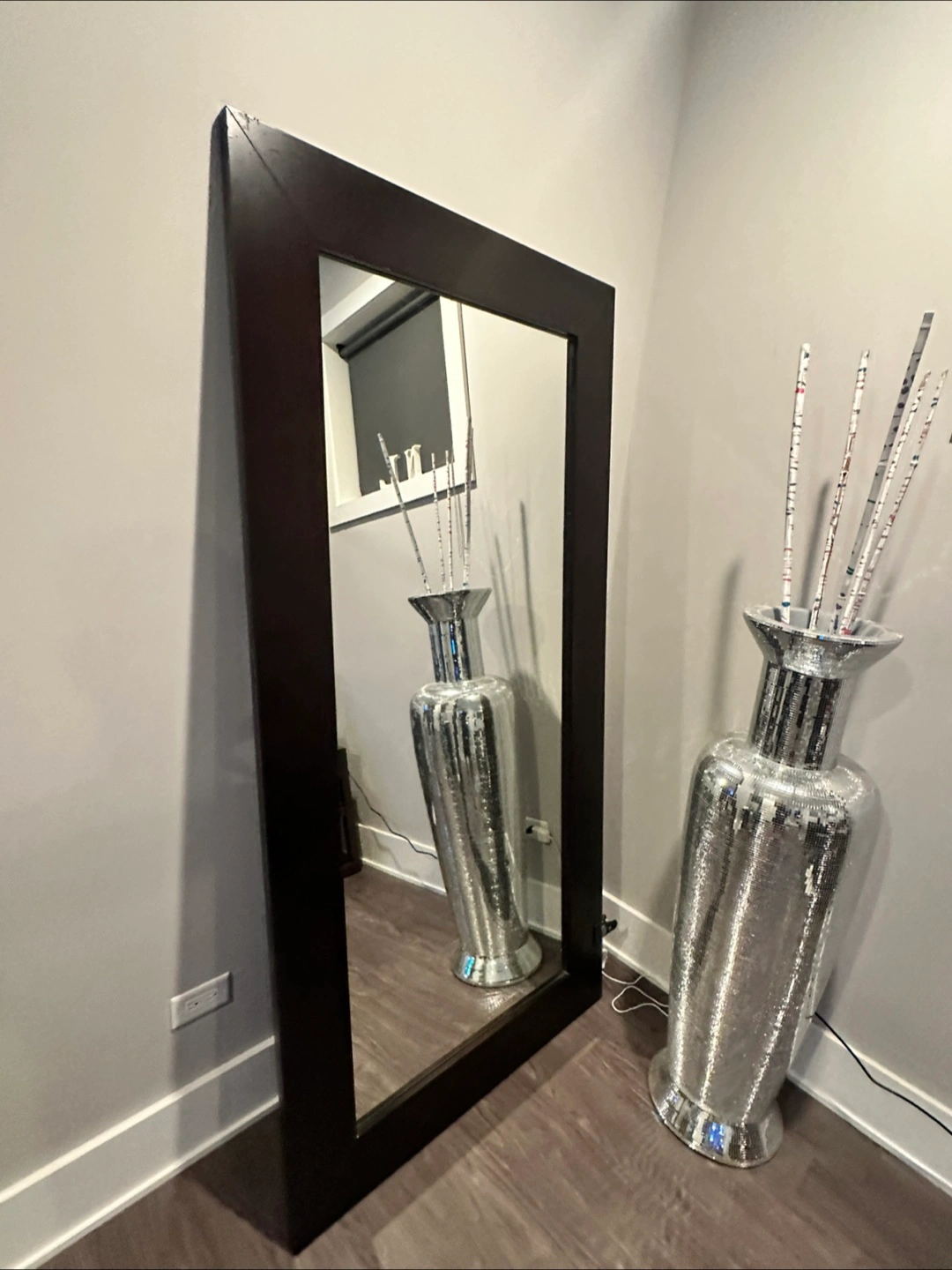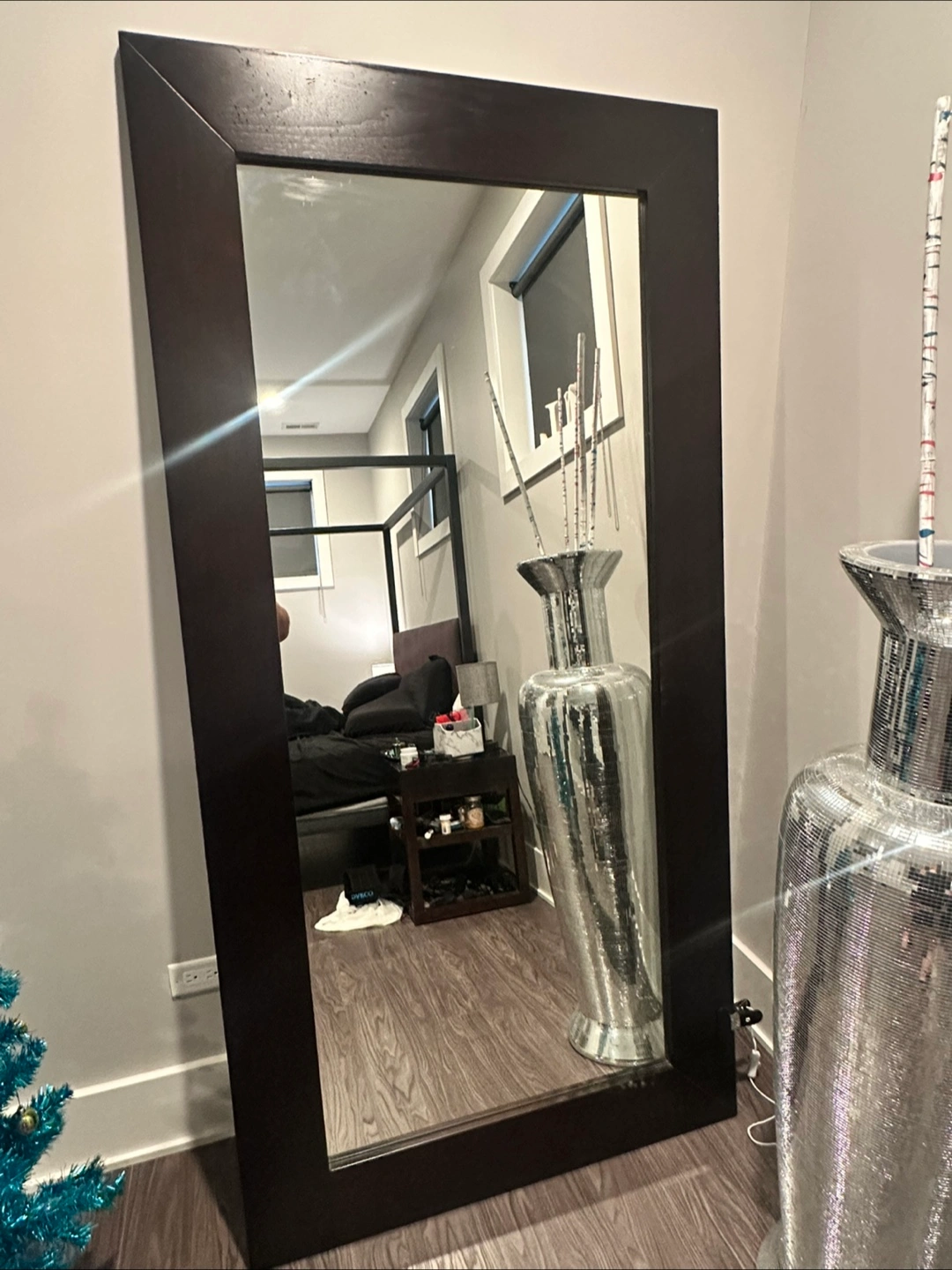 Selling a large full-length mirror with solid oak wood frame. It measures 6 feet 5 inches in height and 3 feet 3 inches in width. It's in great condition and ready to brighten up your space