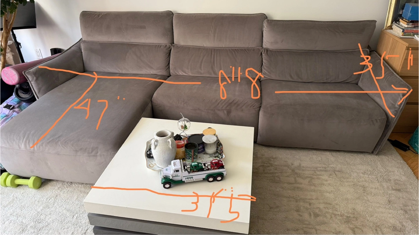 Selling a large sectional sofa! It's a comfortable and stylish addition to any living space. The sofa is grey and measures approximately 118 inches in length, 47 inches in width, and 37 inches in height