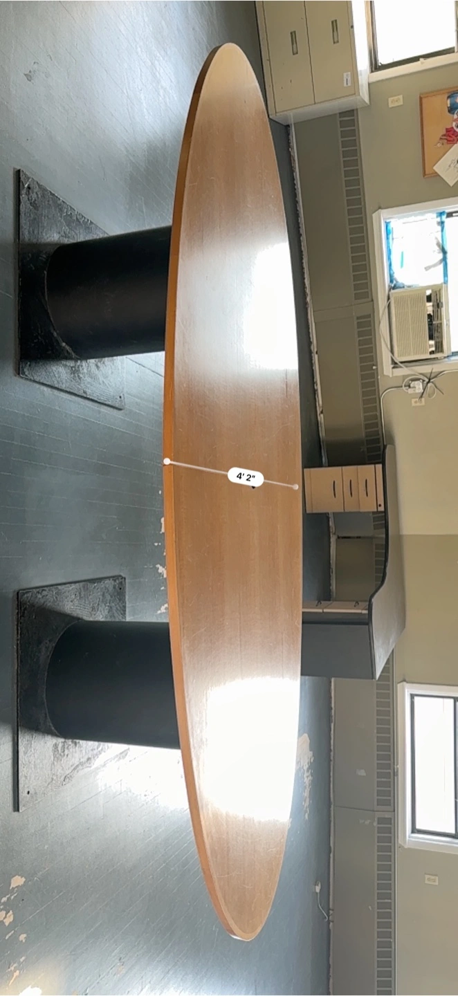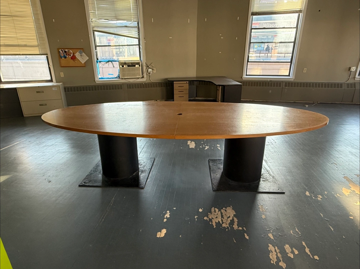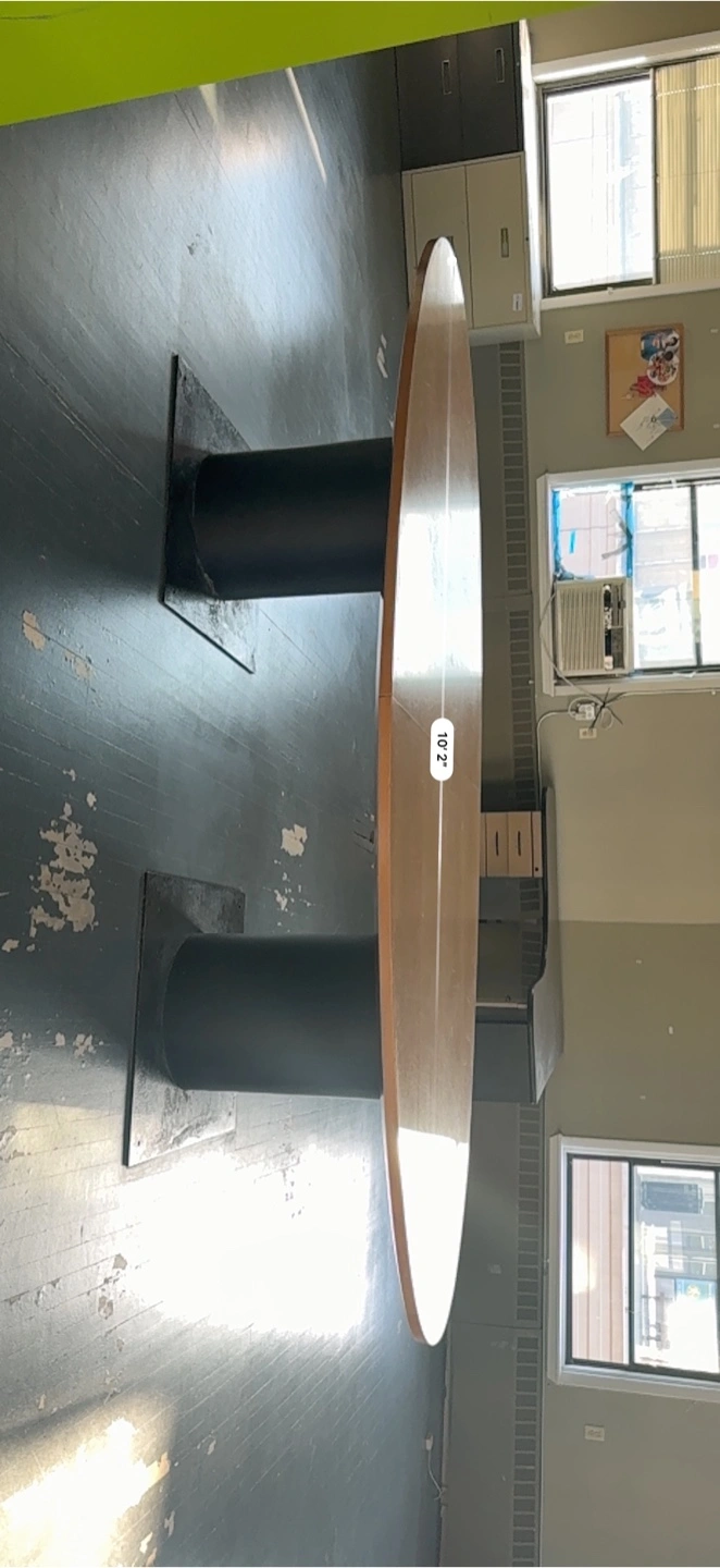 Here's a large oval conference table. The table has a wooden top and black cylindrical legs. The dimensions are approximately 10'2" long and 4'2" wide. It would be great for a large meeting room or office space