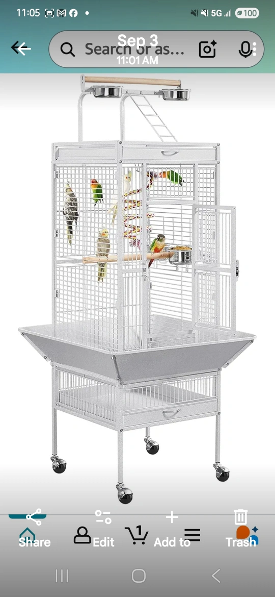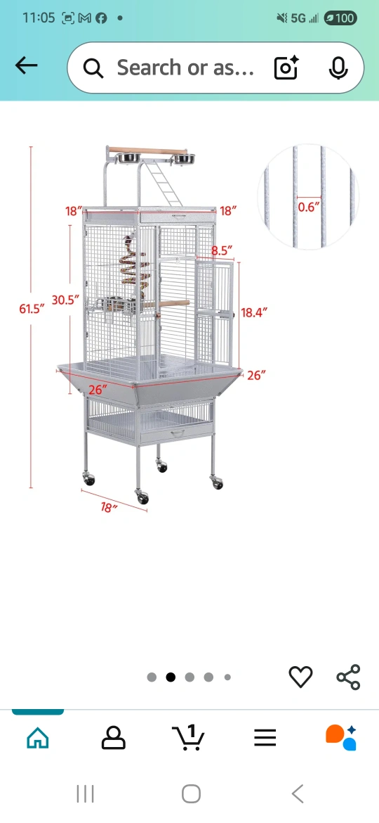 Selling a large bird cage on wheels. It's about 61.5 inches tall, 26 inches wide, and 18 inches deep. Perfect for parrots or other birds!