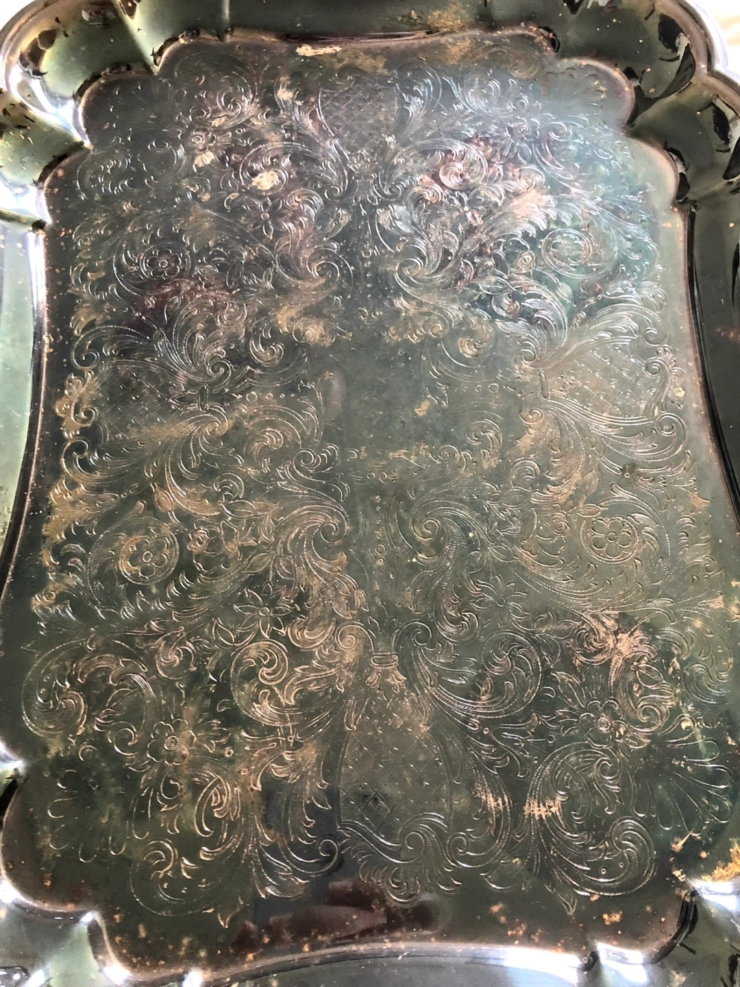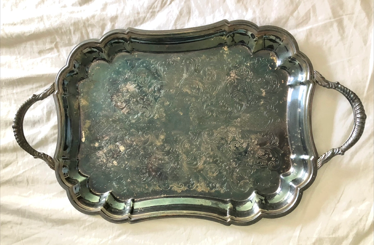 130LARGE SILVER PLATED HOLIDAY SERVING TRAY - VINTAGE - VIKING PLATE CANADA Tarnished 1960s silver plated serving tray by Viking Silver Plate of Canada. - 15 1/2 Inches long x 11.5 inches wide - 21 inches long including the two handles - Border is raised approximately 1 inch from serving surface - Silver plated Please check out my other unique items!!