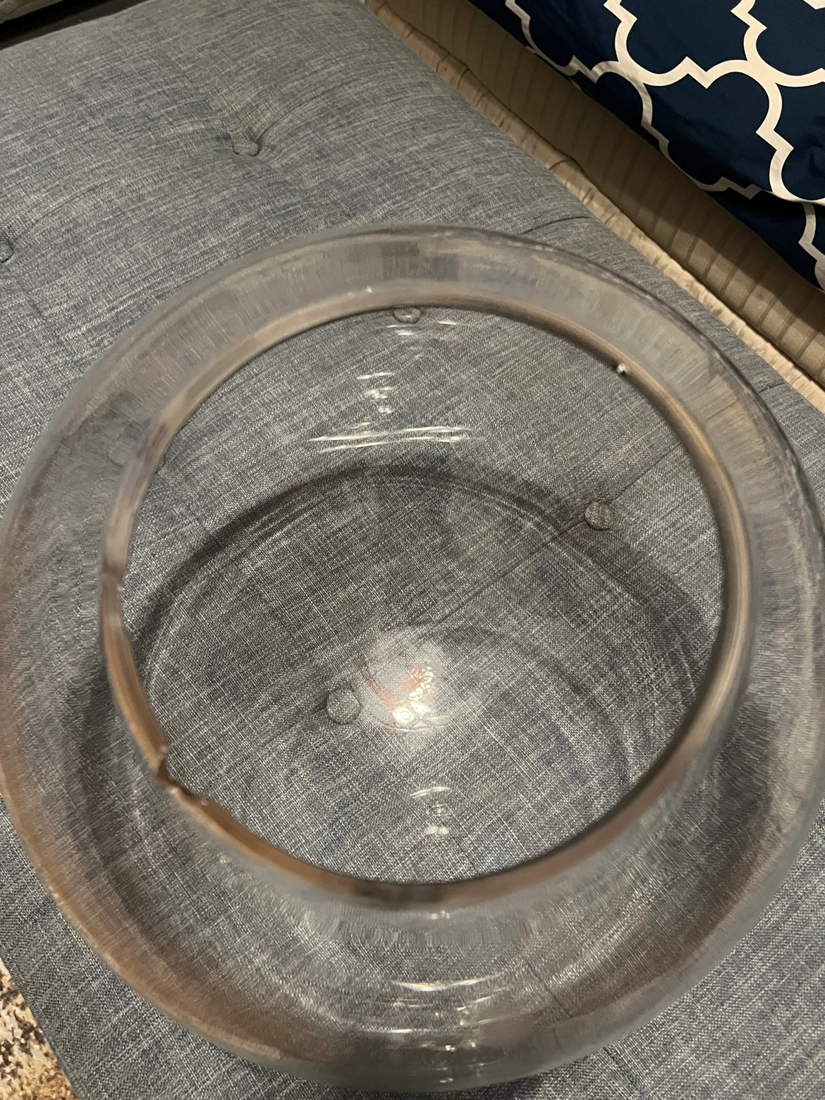 Large glass bowl perfect for a centerpiece, decorative piece, or a large plant! It is about 13 inches in diameter. Few scratches at the bottom & chipped on the rim at 3 small spots but if you can cover it up then it’s great to use.